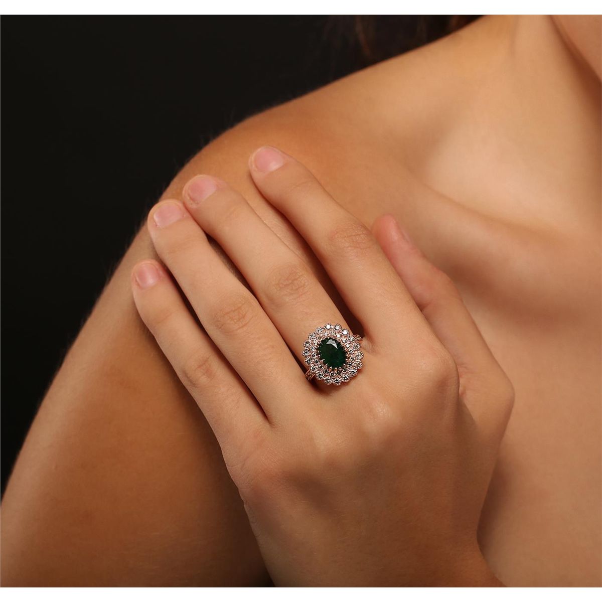 14KT rose gold 2.98ct Emerald and Diamond Ring A6615. One electronically tested 14KT rose gold ladies cast emerald and diamond ring. The featured emerald is set within tiered diamond bezels supported by diamond set shoulders, completed by a two and one-half millimeter wide band. Bright polish finish with milgrain detailing. Identified with markings of "K14". Condition is new, good workmanship. Containing: One prong set oval mixed cut natural emerald, measuring 10.20 x 7.50 x 5.70mm, 20%. bulge factor, approximate weight of 2.98ct., clarity is heavily included, type III, dark, moderately strong, very slightly bluish green color, (GIA vslbG 7/4), cut is good. Transmitting light with a minimum of distortion, transparent. Naturally occurring internal & external characteristics are present. Indications of oil & opticon residue. Graded in the setting.Forty-Eight bezel and bead set round brilliant cut diamonds, measuring 1.70 - 1.40 x 0.93mm (depth est.) approximate. Total Weight of 48 Stones = 0.88ct. Color grade is an average for the group. Graded in the setting. Clarity: SI-1 to I-1. Total Weight of Colored Stones 2.98ct. Total Weight of Diamonds 0.88ct. AIG Appraised at $8,070.00.