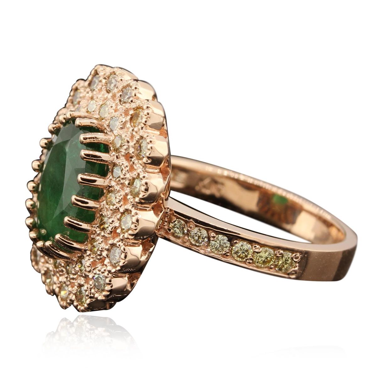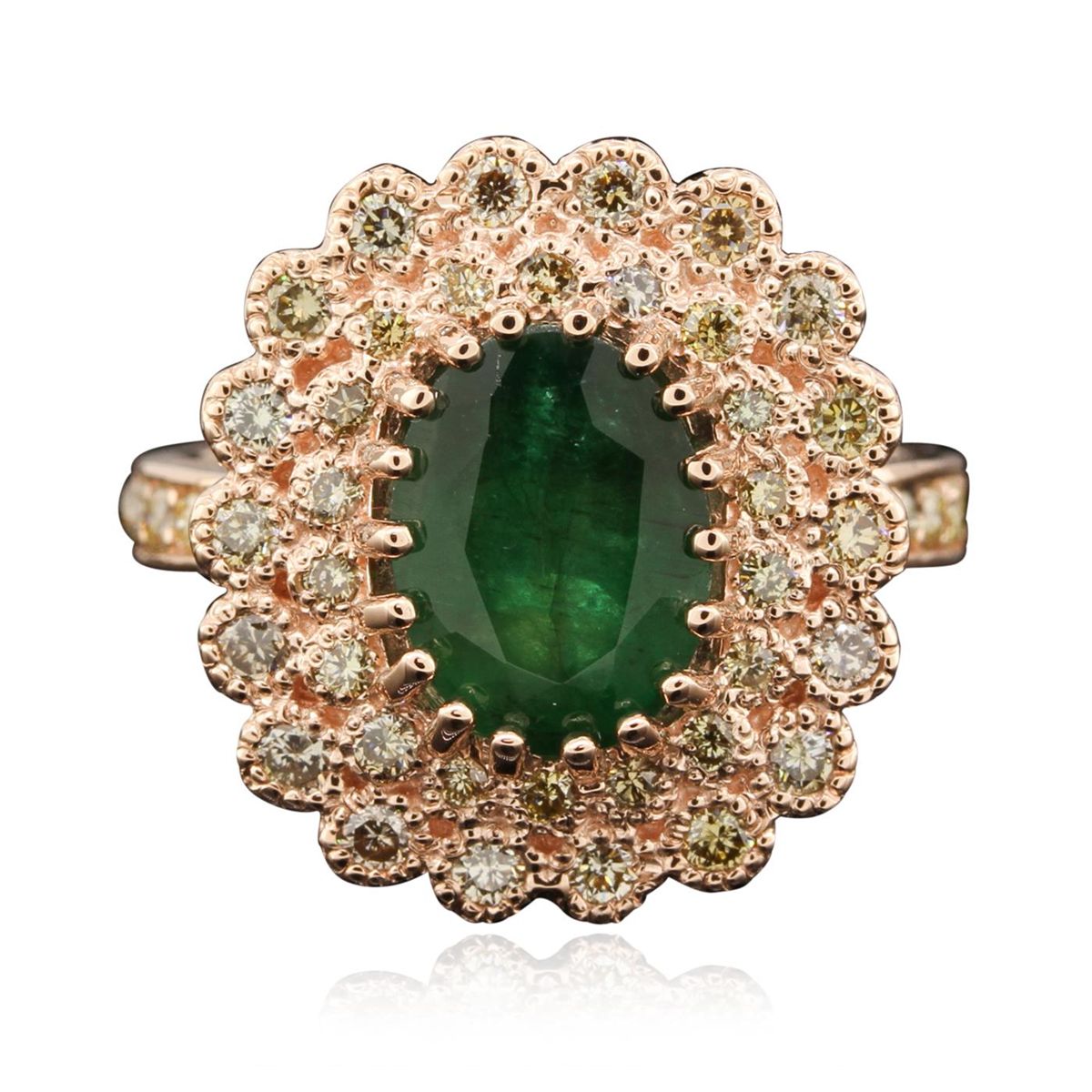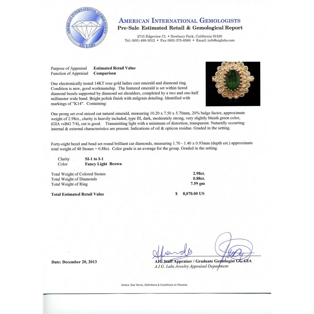 14KT rose gold 2.98ct Emerald and Diamond Ring A6615. One electronically tested 14KT rose gold ladies cast emerald and diamond ring. The featured emerald is set within tiered diamond bezels supported by diamond set shoulders, completed by a two and one-half millimeter wide band. Bright polish finish with milgrain detailing. Identified with markings of "K14". Condition is new, good workmanship. Containing: One prong set oval mixed cut natural emerald, measuring 10.20 x 7.50 x 5.70mm, 20%. bulge factor, approximate weight of 2.98ct., clarity is heavily included, type III, dark, moderately strong, very slightly bluish green color, (GIA vslbG 7/4), cut is good. Transmitting light with a minimum of distortion, transparent. Naturally occurring internal & external characteristics are present. Indications of oil & opticon residue. Graded in the setting.Forty-Eight bezel and bead set round brilliant cut diamonds, measuring 1.70 - 1.40 x 0.93mm (depth est.) approximate. Total Weight of 48 Stones = 0.88ct. Color grade is an average for the group. Graded in the setting. Clarity: SI-1 to I-1. Total Weight of Colored Stones 2.98ct. Total Weight of Diamonds 0.88ct. AIG Appraised at $8,070.00.