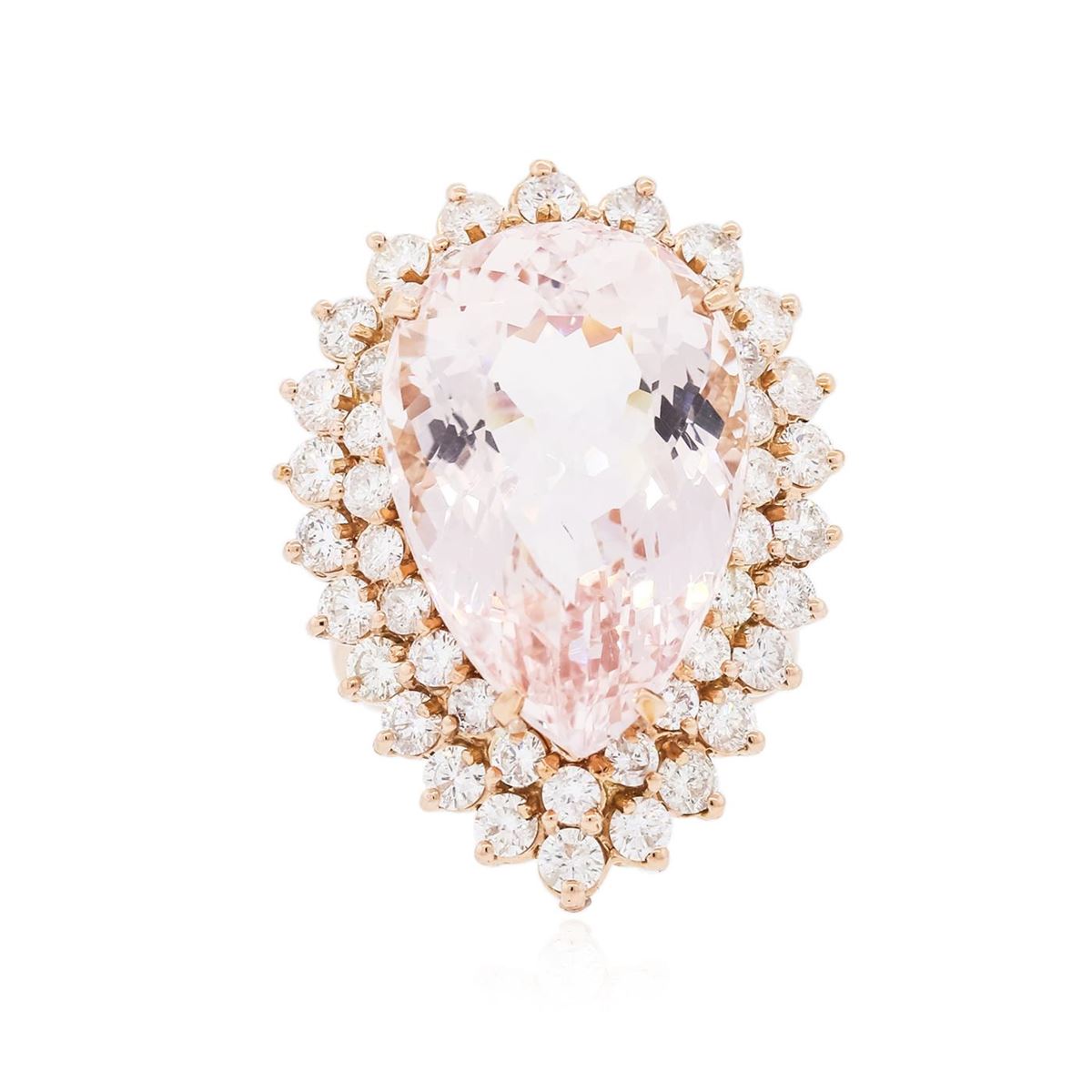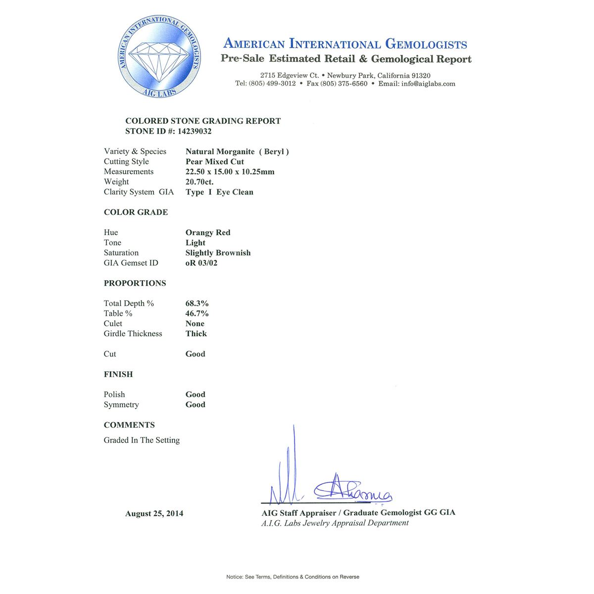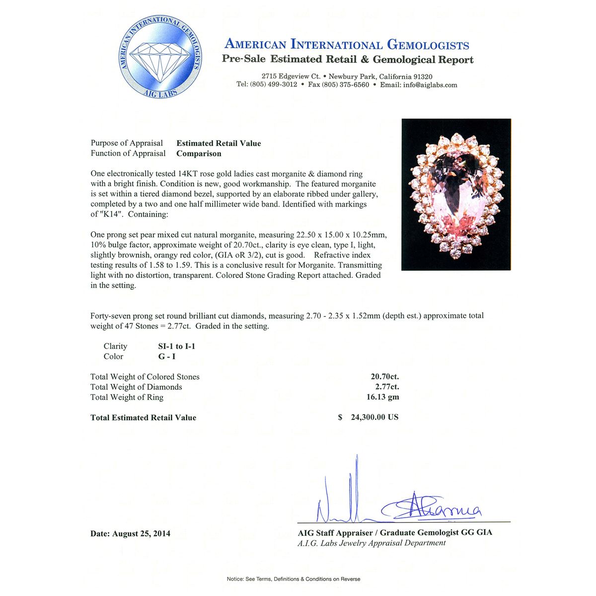 One electronically tested 14KT rose gold ladies cast morganite & diamond ring with a bright finish. The featured morganite is set within a tiered diamond bezel, supported by an elaborate ribbed under gallery, completed by a two and one half millimeter wide band. Identified with markings of "K14". Condition is new, good workmanship. Containing: One prong set pear mixed cut natural morganite, measuring 22.50 x 15.00 x 10.25mm, 10% bulge factor, approximate weight of 20.70ct., clarity is eye clean, type I, light, slightly brownish, orangy red color, (GIA oR 3/2), cut is good. Refractive index testing results of 1.58 to 1.59. This is a conclusive result for Morganite. Transmitting light with no distortion, transparent. Colored Stone Grading Report attached. Graded in the setting. Forty-Seven prong set round brilliant cut diamonds, measuring 2.70 - 2.35 x 1.52mm (depth est.) approximate total weight of 47 Stones = 2.77ct. Graded in the setting. Clarity: SI-1 to I-1. Color: G - I. Total Weight of Colored Stones 20.70ct. Total Weight of Diamonds 2.77ct. Total Weight of Ring 16.13 grams. AIG Appraised at $24,300.00.