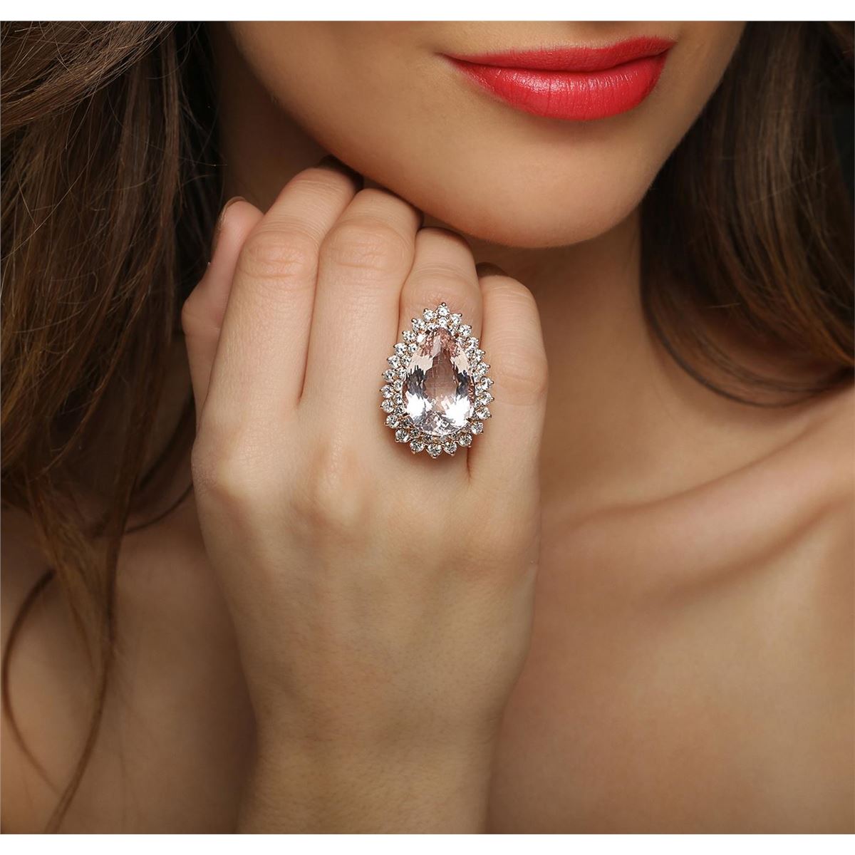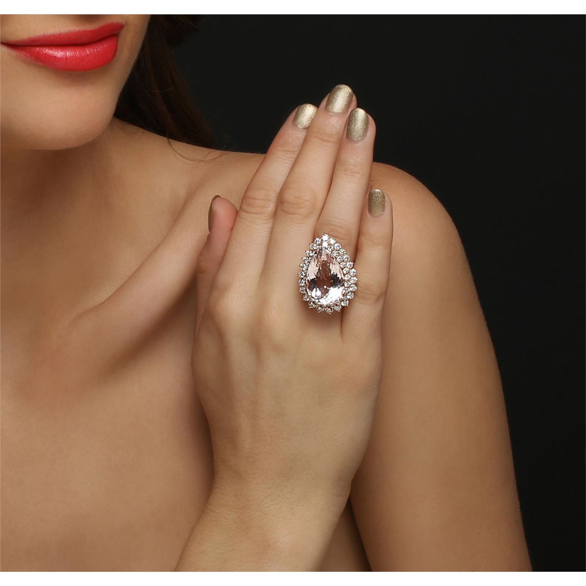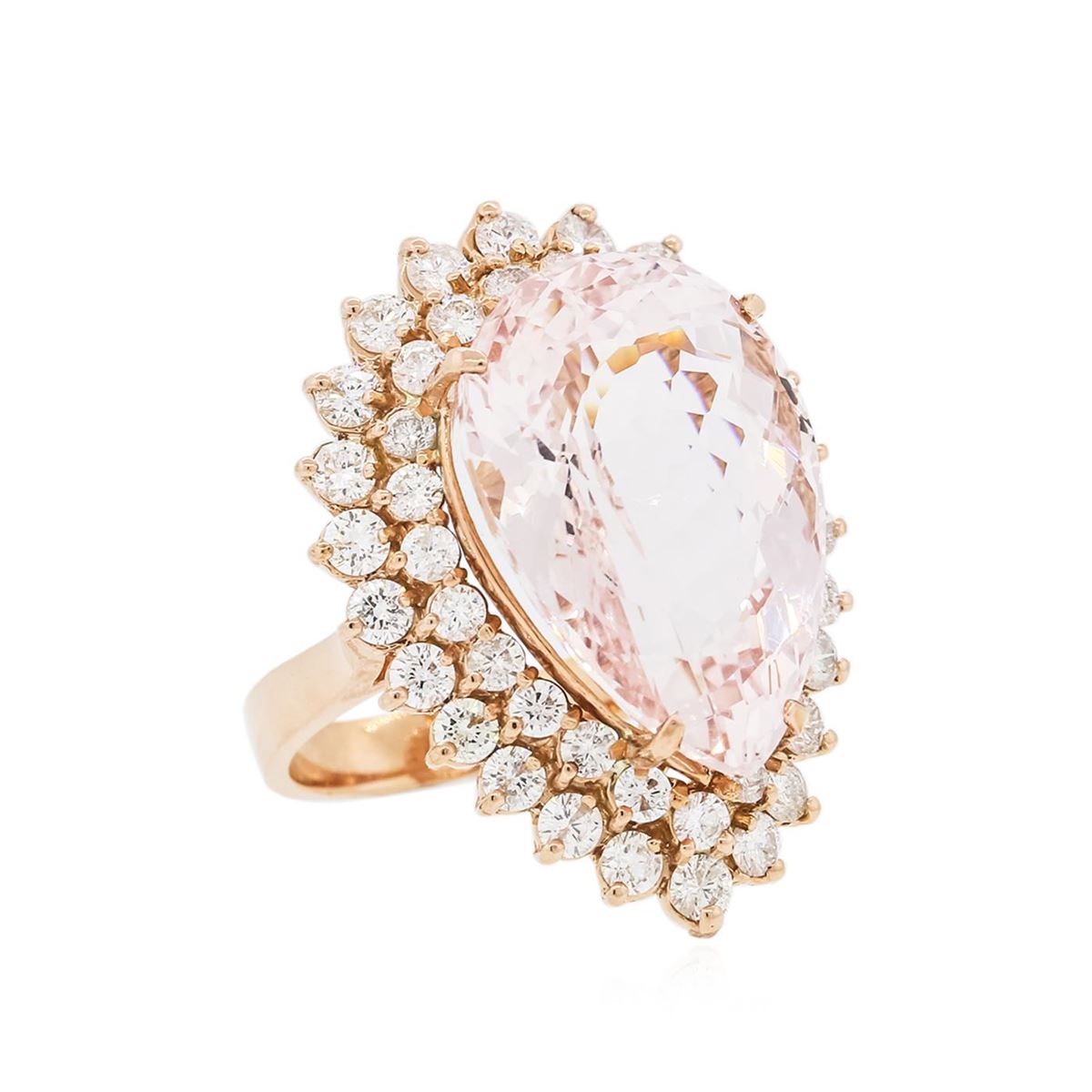 One electronically tested 14KT rose gold ladies cast morganite & diamond ring with a bright finish. The featured morganite is set within a tiered diamond bezel, supported by an elaborate ribbed under gallery, completed by a two and one half millimeter wide band. Identified with markings of "K14". Condition is new, good workmanship. Containing: One prong set pear mixed cut natural morganite, measuring 22.50 x 15.00 x 10.25mm, 10% bulge factor, approximate weight of 20.70ct., clarity is eye clean, type I, light, slightly brownish, orangy red color, (GIA oR 3/2), cut is good. Refractive index testing results of 1.58 to 1.59. This is a conclusive result for Morganite. Transmitting light with no distortion, transparent. Colored Stone Grading Report attached. Graded in the setting. Forty-Seven prong set round brilliant cut diamonds, measuring 2.70 - 2.35 x 1.52mm (depth est.) approximate total weight of 47 Stones = 2.77ct. Graded in the setting. Clarity: SI-1 to I-1. Color: G - I. Total Weight of Colored Stones 20.70ct. Total Weight of Diamonds 2.77ct. Total Weight of Ring 16.13 grams. AIG Appraised at $24,300.00.
