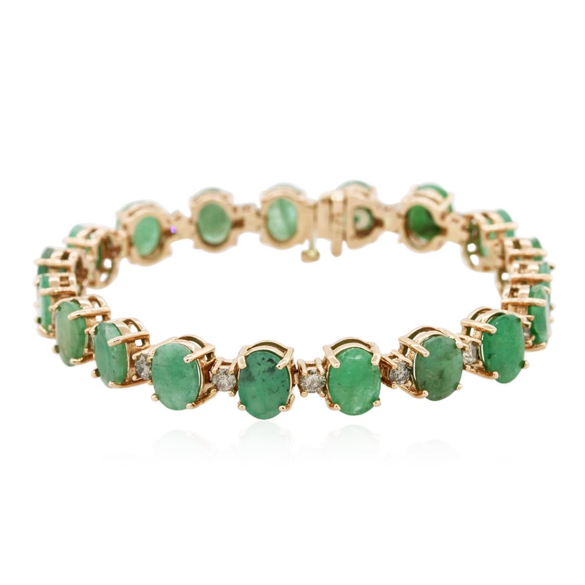 One electronically tested 14KT rose gold ladies cast & assembled emerald and diamond bracelet with a bright polish finish. Condition is new, good workmanship. Seven inch length bracelet features a flexible ribbon of emeralds alternated by diamonds terminating in a concealed clasp with safety bar. Identified with markings of "14K". Containing: Nineteen prong set oval mixed cut natural emeralds, measuring 8.00 x 6.00 x 3.90mm, 6%. bulge factor, approximate. Total Weight of 20.90ct., clarity is severely included, type III, medium, very slightly grayish, very slightly bluish green color, (GIA vslbG 5/3), cut is good. Transmitting light somewhat diffusely, translucent. Naturally occurring internal & external characteristics are present. Indications of oil residue. Measurements & the color grade are an average for the group. Graded in the setting. Nineteen prong set round brilliant cut diamonds, measuring 2.80 - 2.70 x 1.65mm (depth est.) approximate. Total Weight of 19 Stones = 1.54ct. Color grade is an average for the group. Graded in the setting. Clarity: I-1 to I-2. Total Weight of Colored Stones 20.90ct. Total Weight of Diamonds 1.54ct. Total Weight of Bracelet 20.40 grams. AIG Appraised at $9,950.00.