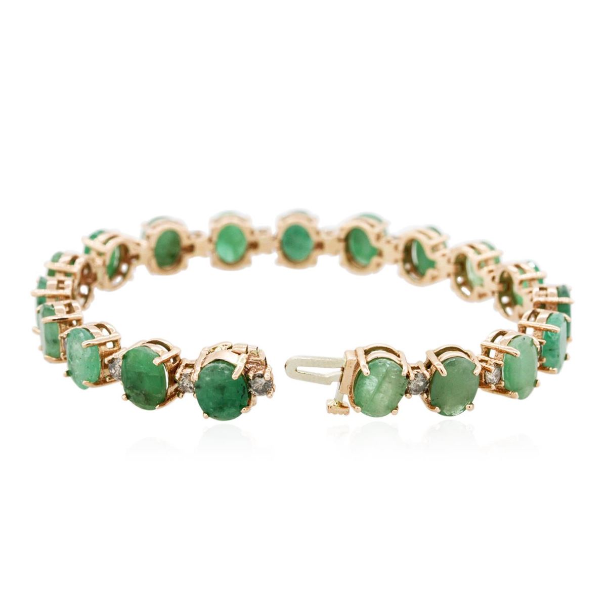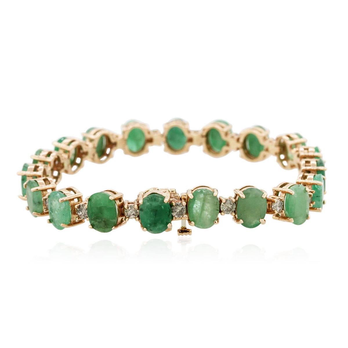 One electronically tested 14KT rose gold ladies cast & assembled emerald and diamond bracelet with a bright polish finish. Condition is new, good workmanship. Seven inch length bracelet features a flexible ribbon of emeralds alternated by diamonds terminating in a concealed clasp with safety bar. Identified with markings of "14K". Containing: Nineteen prong set oval mixed cut natural emeralds, measuring 8.00 x 6.00 x 3.90mm, 6%. bulge factor, approximate. Total Weight of 20.90ct., clarity is severely included, type III, medium, very slightly grayish, very slightly bluish green color, (GIA vslbG 5/3), cut is good. Transmitting light somewhat diffusely, translucent. Naturally occurring internal & external characteristics are present. Indications of oil residue. Measurements & the color grade are an average for the group. Graded in the setting. Nineteen prong set round brilliant cut diamonds, measuring 2.80 - 2.70 x 1.65mm (depth est.) approximate. Total Weight of 19 Stones = 1.54ct. Color grade is an average for the group. Graded in the setting. Clarity: I-1 to I-2. Total Weight of Colored Stones 20.90ct. Total Weight of Diamonds 1.54ct. Total Weight of Bracelet 20.40 grams. AIG Appraised at $9,950.00.
