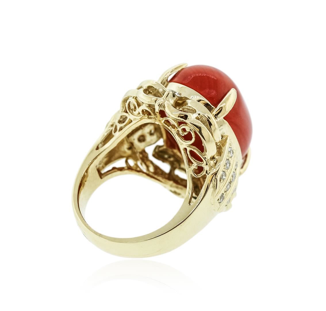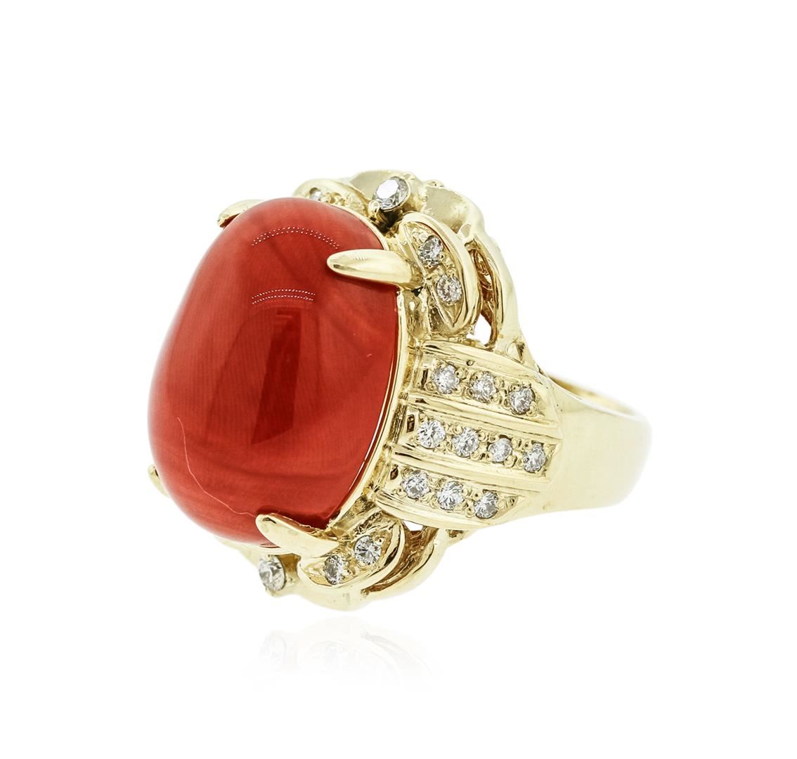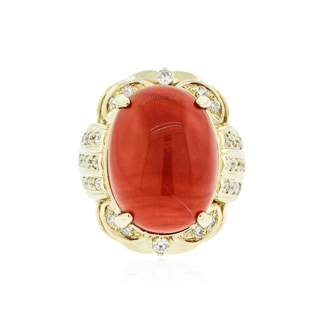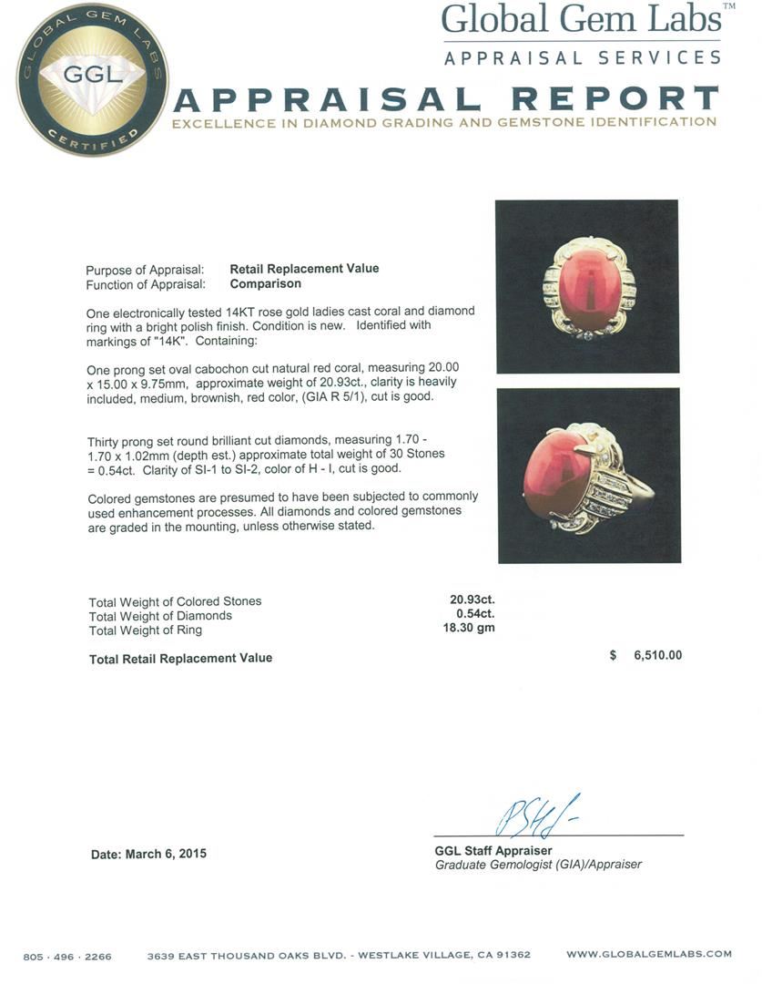 One electronically tested 14KT rose gold ladies cast coral and diamond ring with a bright polish finish. Identified with markings of "14K". Condition is new. Containing: One prong set oval cabochon cut natural red coral, measuring 20.00 x 15.00 x 9.75mm, approximate weight of 20.93ct., clarity is heavily included, medium, brownish, red color, (GIA R 5/1), cut is good. Thirty prong set round brilliant cut diamonds, measuring 1.70 - 1.70 x 1.02mm (depth est.) approximate total weight of 30 Stones = 0.54ct. . Clarity: SI-1 to SI-2. Color: H - I, Cut is Good. Colored gemstones are presumed to have been subjected to commonly used enhancement processes. All diamonds and colored gemstones are graded in the mounting, unless otherwise stated.. Total Weight of Colored Stones 20.93ct.. Total Weight of Diamonds 0.54ct.. Total Weight of Ring 18.30 grams. GGL Appraised at $6,510.00.