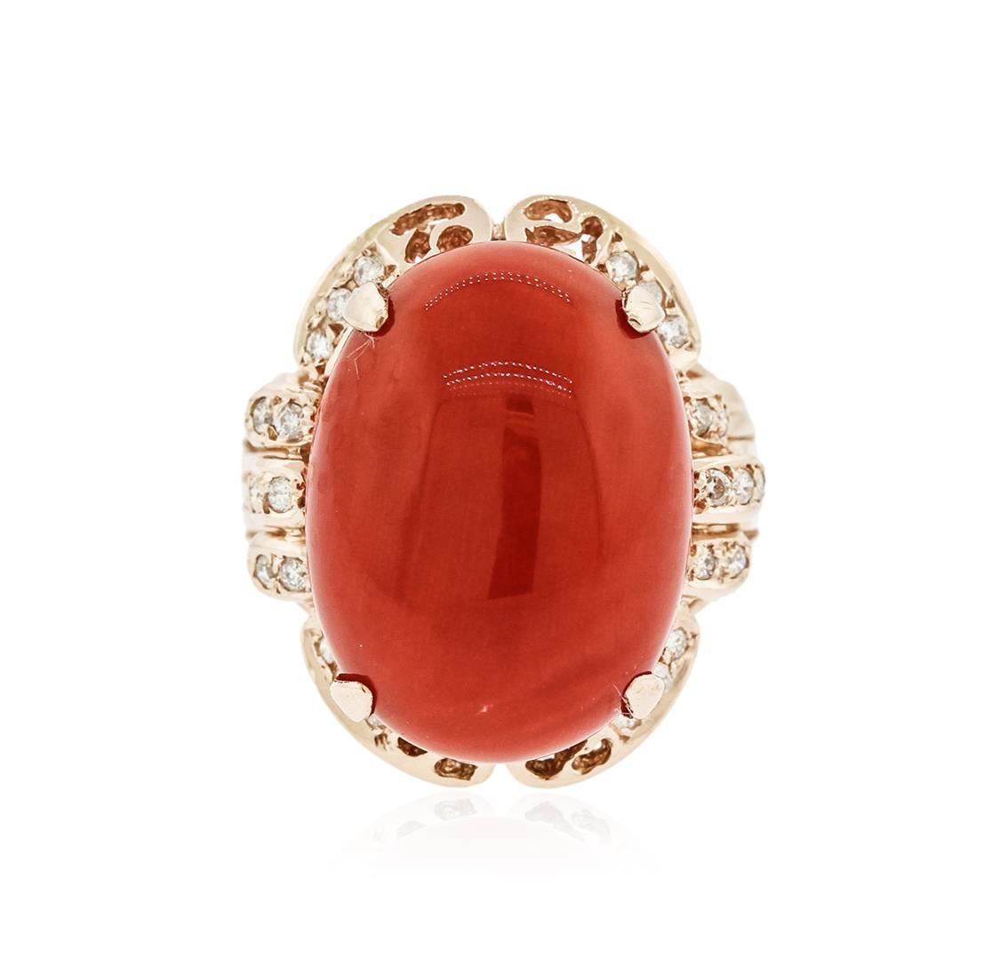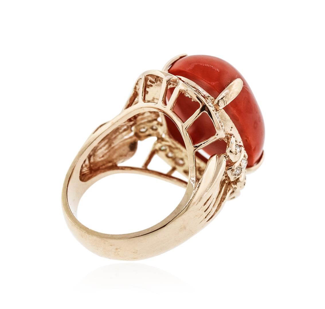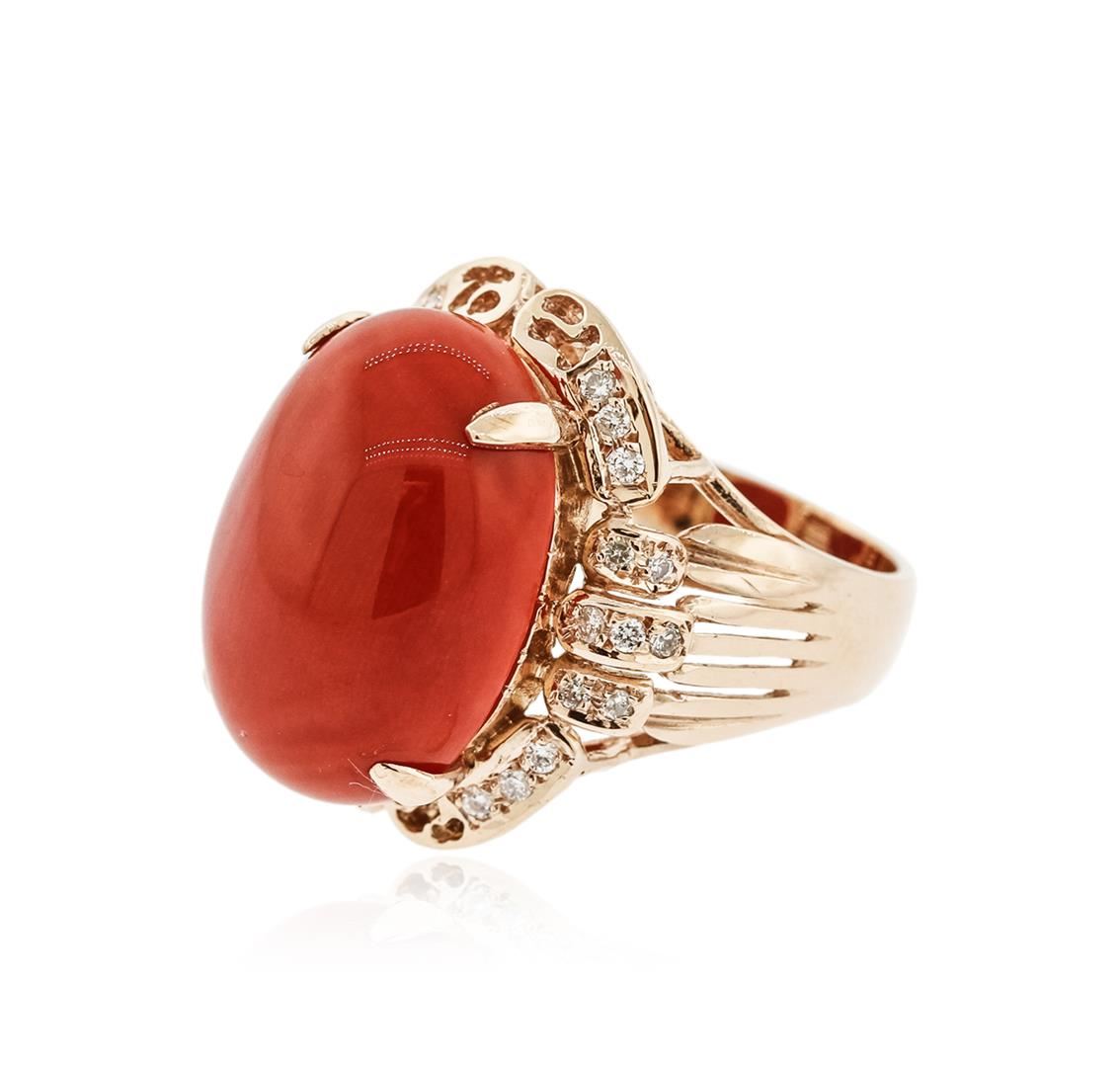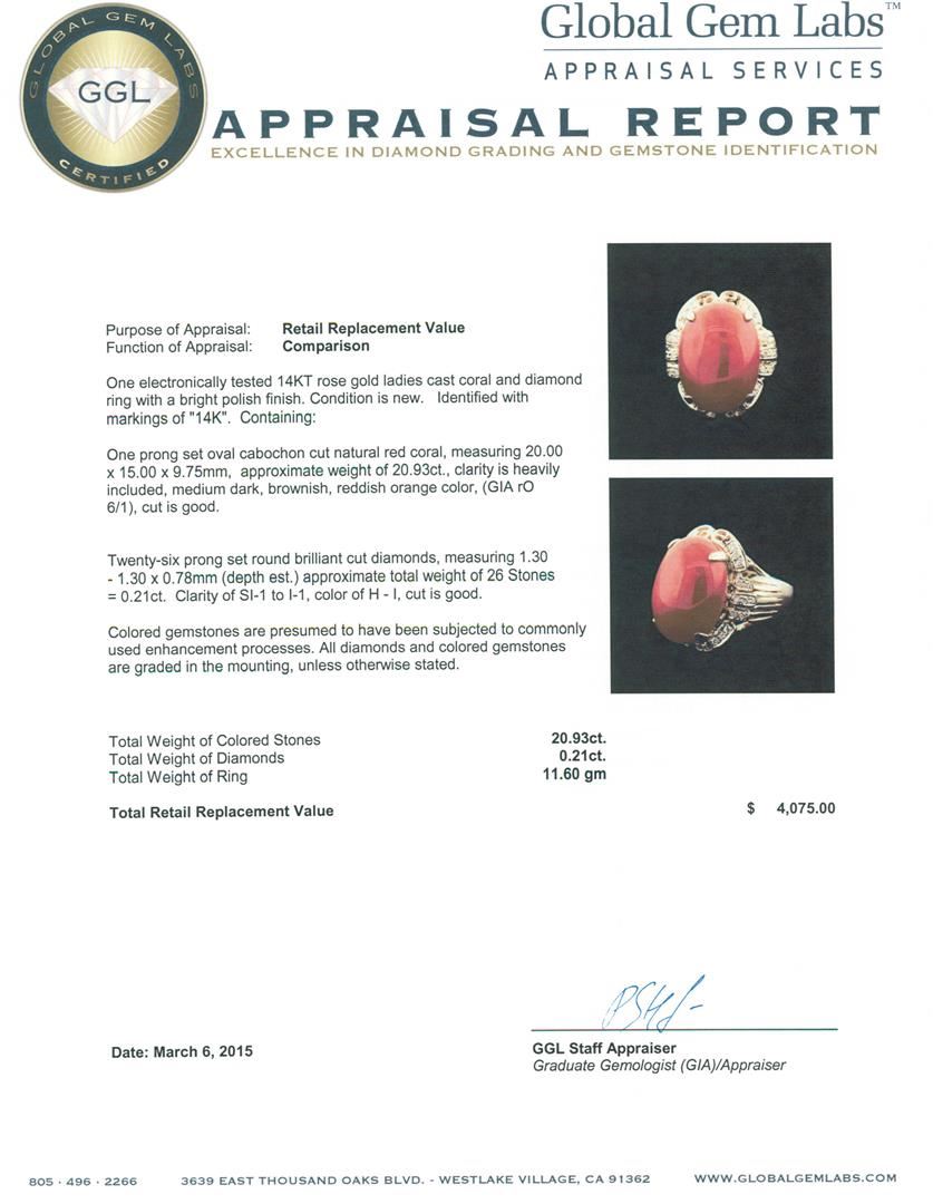 One electronically tested 14KT rose gold ladies cast coral and diamond ring with a bright polish finish. Identified with markings of "14K". Condition is new. Containing: One prong set oval cabochon cut natural red coral, measuring 20.00 x 15.00 x 9.75mm, approximate weight of 20.93ct., clarity is heavily included, medium dark, brownish, reddish orange color, (GIA rO 6/1), cut is good. Twenty-Six prong set round brilliant cut diamonds, measuring 1.30 - 1.30 x 0.78mm (depth est.) approximate total weight of 26 Stones = 0.21ct.. Clarity: SI-1 to I-1. Color: H - I, Cut is Good. Colored gemstones are presumed to have been subjected to commonly used enhancement processes. All diamonds and colored gemstones are graded in the mounting, unless otherwise stated.. Total Weight of Colored Stones 20.93ct.. Total Weight of Diamonds 0.21ct.. Total Weight of Ring 11.60 grams. GGL Appraised at $4,075.00.
