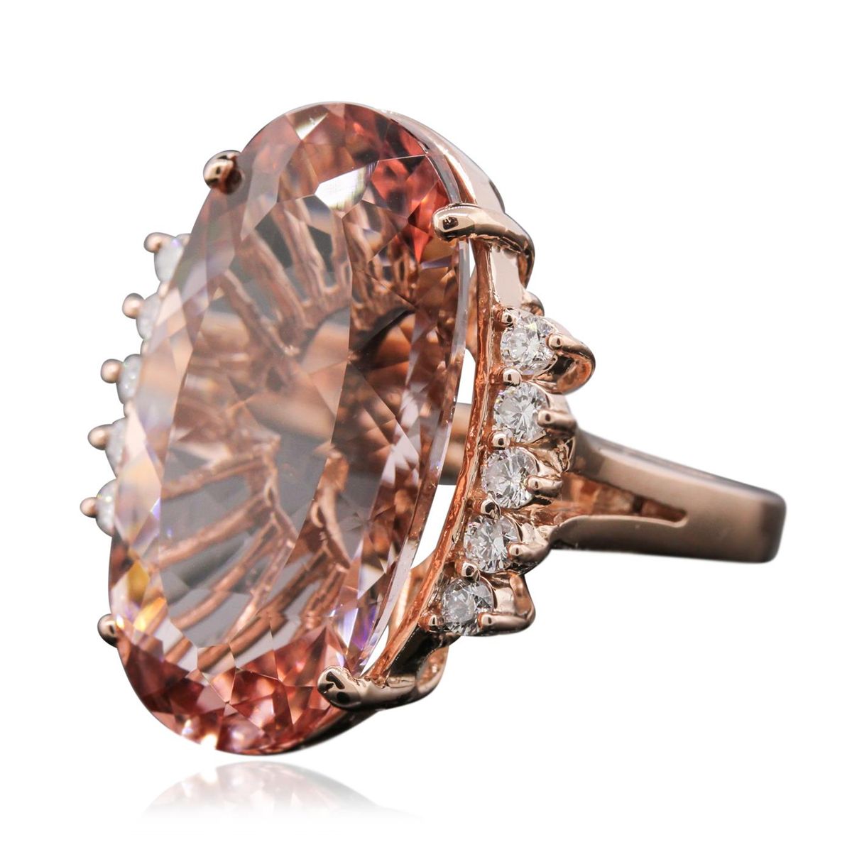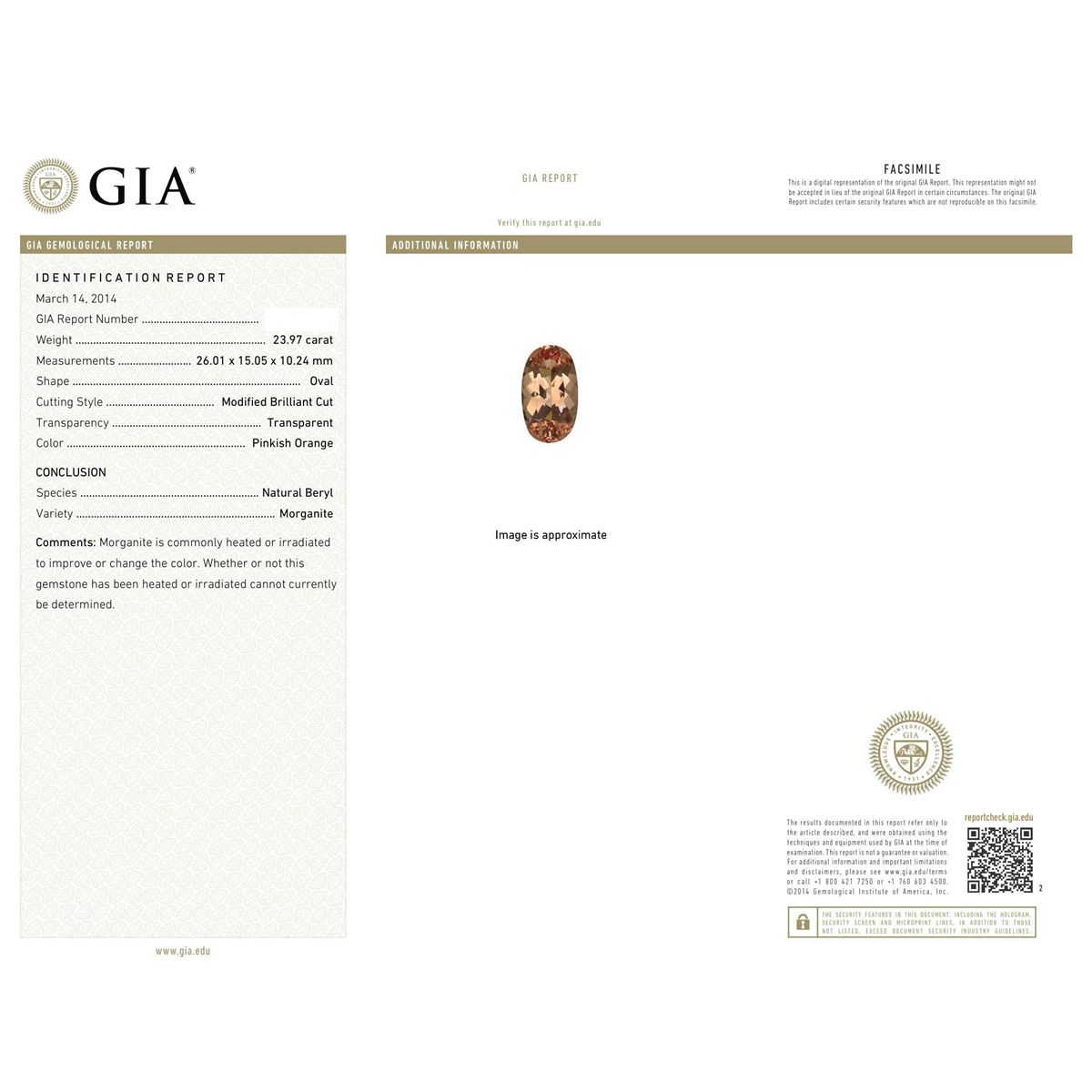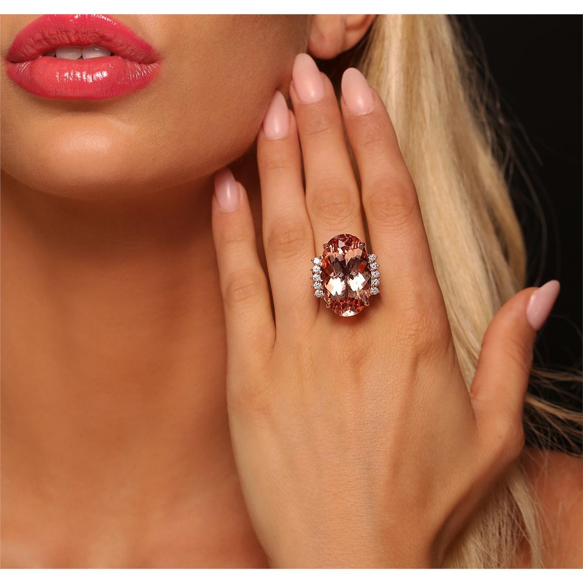 One electronically tested 14KT rose gold Ladies combination cast & assembled ring with a bright polish finish. Condition is new. Identified with markings of "K14". Containing: One prong set oval modified brilliant cut natural morganite, measuring 26.01 x 15.05 x 10.24mm, approximate weight of 23.97ct., clarity is eye clean, type I, light, brownish, reddish orange color, (GIA rO 3/1), cut is very good. GIA Report: 2151961114. Ten prong set round brilliant cut diamonds, measuring 2.40 - 2.40 x 1.44mm (depth est.) approximate. Total Weight of 10 Stones = 0.51ct. Clarity: I-1 to I-2. Color: I - J, Cut is Good. Total Weight of Colored Stones 23.97ct. Total Weight of Diamonds 0.51ct. Total Weight of Ring 13.70 grams. GGL Appraised at $18,180.00.