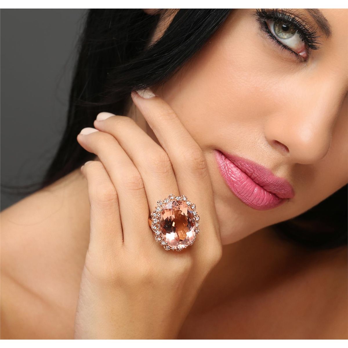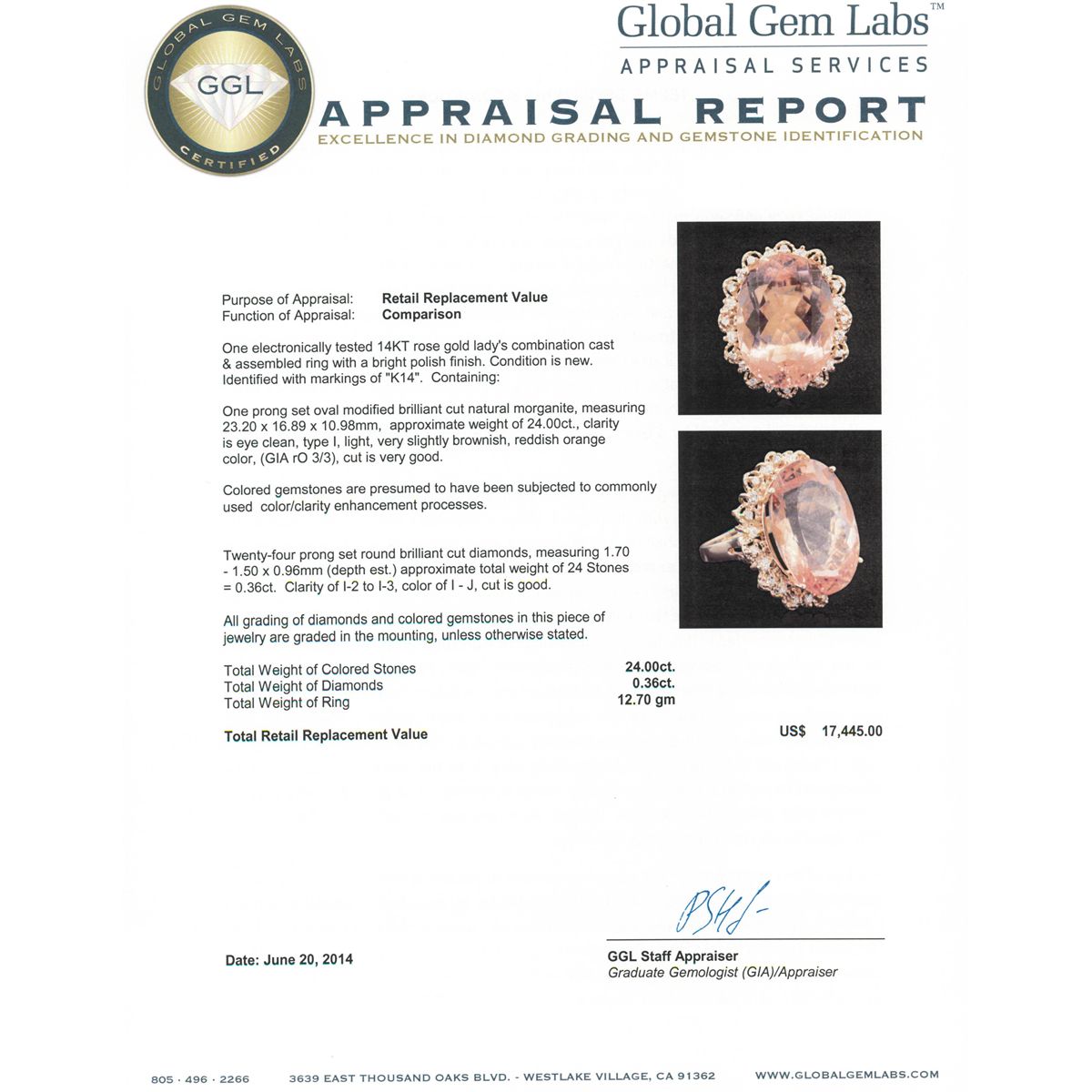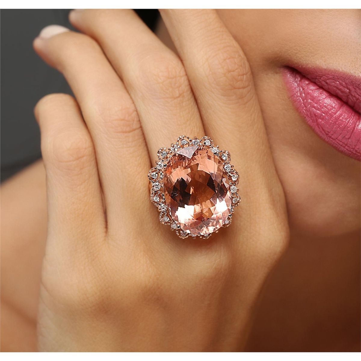 One electronically tested 14KT rose gold Ladies combination cast & assembled ring with a bright polish finish. Condition is new. Identified with markings of "K14". Containing: One prong set oval modified brilliant cut natural morganite, measuring 23.20 x 16.89 x 10.98mm, approximate weight of 24.00ct., clarity is eye clean, type I, light, very slightly brownish, reddish orange color, (GIA rO 3/3), cut is very good. Colored gemstones are presumed to have been subjected to commonly used color/clarity enhancement processes. Twenty-Four prong set round brilliant cut diamonds, measuring 1.70 - 1.50 x 0.96mm (depth est.) approximate. Total Weight of 24 Stones = 0.36ct. Clarity: I-2 to I-3. Color: I - J, Cut is Good. All grading of diamonds and colored gemstones in this piece of jewelry are graded in the mounting, unless otherwise stated. Total Weight of Colored Stones 24.00ct. Total Weight of Diamonds 0.36ct. Total Weight of Ring 12.70 grams. GGL Appraised at $17,445.00.