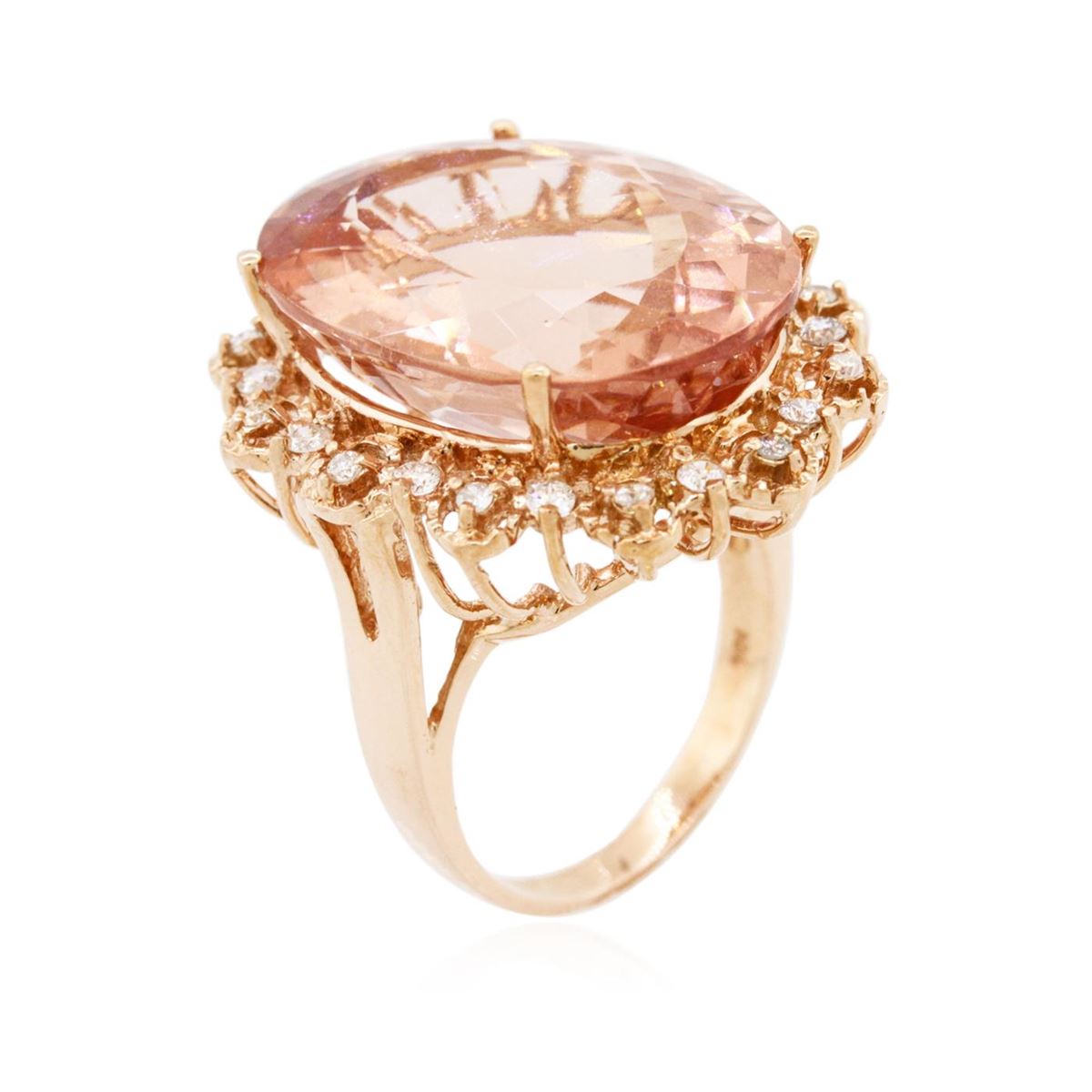 One electronically tested 14KT rose gold Ladies combination cast & assembled ring with a bright polish finish. Condition is new. Identified with markings of "K14". Containing: One prong set oval modified brilliant cut natural morganite, measuring 23.20 x 16.89 x 10.98mm, approximate weight of 24.00ct., clarity is eye clean, type I, light, very slightly brownish, reddish orange color, (GIA rO 3/3), cut is very good. Colored gemstones are presumed to have been subjected to commonly used color/clarity enhancement processes. Twenty-Four prong set round brilliant cut diamonds, measuring 1.70 - 1.50 x 0.96mm (depth est.) approximate. Total Weight of 24 Stones = 0.36ct. Clarity: I-2 to I-3. Color: I - J, Cut is Good. All grading of diamonds and colored gemstones in this piece of jewelry are graded in the mounting, unless otherwise stated. Total Weight of Colored Stones 24.00ct. Total Weight of Diamonds 0.36ct. Total Weight of Ring 12.70 grams. GGL Appraised at $17,445.00.
