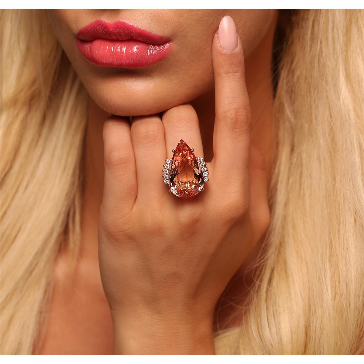 One electronically tested 14KT rose gold ladies cast morganite and diamond ring with a bright polish finish. Condition is new, good workmanship. The featured morganite is framed by mirroring ribbons of diamonds, supported by split shoulders and completed by a three millimeter wide band. Identified with markings of "K14". Containing: One prong set pear modified brilliant cut natural morganite, measuring 28.25 x 16.97 x 8.81mm, exact weight 24.03ct., type I, light Clarity is eye clean, medium, very slightly brownish, pinkish orange color, (GIA piO 5/3), cut is good. Transmitting light with no distortion, transparent. GIA Gemological Report attached. Graded loose prior to setting in the GIA Laboratory, Report #2151961040.Ten prong set round brilliant cut diamonds, measuring 2.30 - 2.20 x 1.35mm (depth est.) approximate. Total Weight of 10 Stones = 0.51ct. Graded in the setting. Clarity: SI-2 to I-1. Color: G - I. Total Weight of Colored Stones 24.03ct. Total Weight of Diamonds 0.51ct. Total Weight of Ring 12.70 grams. AIG Appraised at $21,755.00.