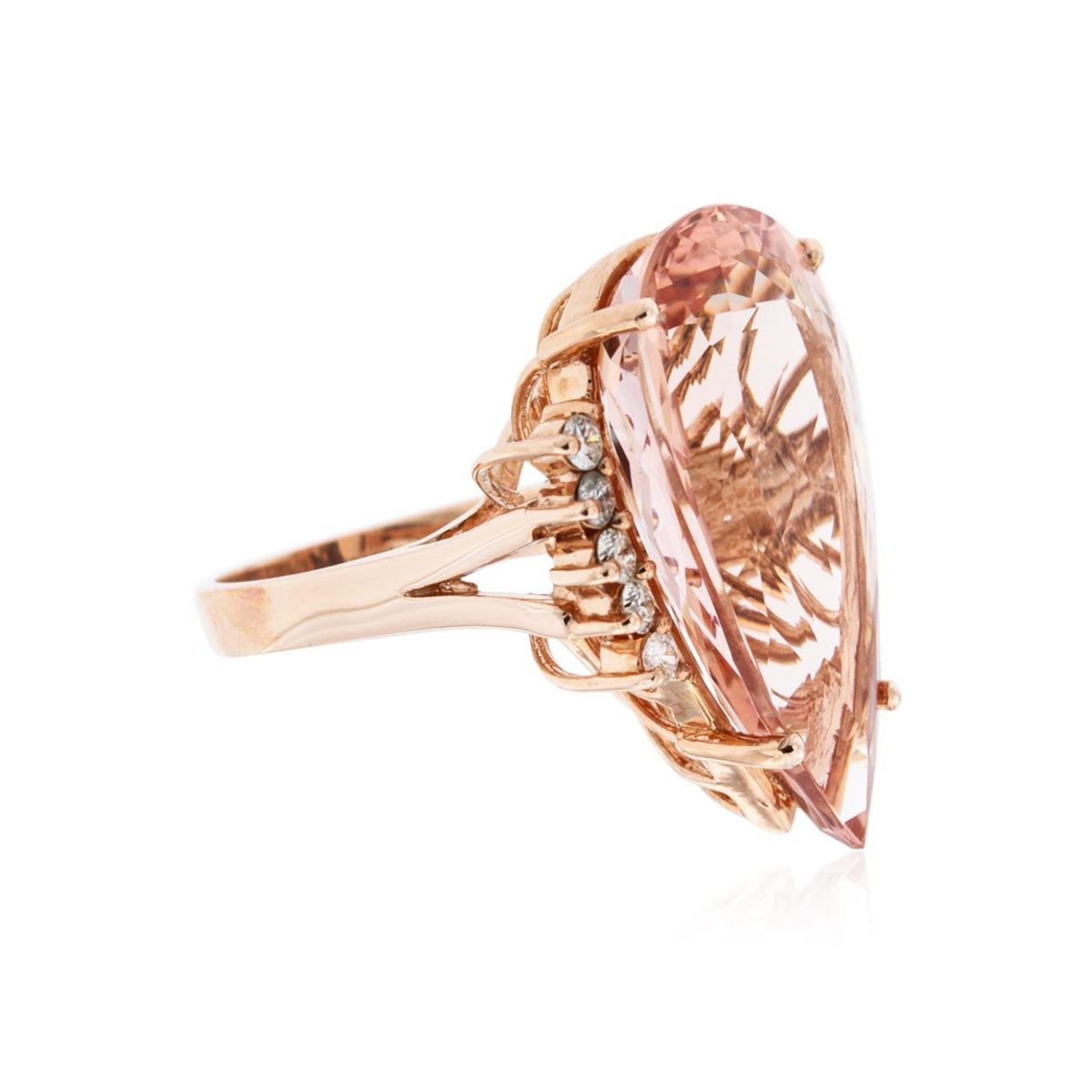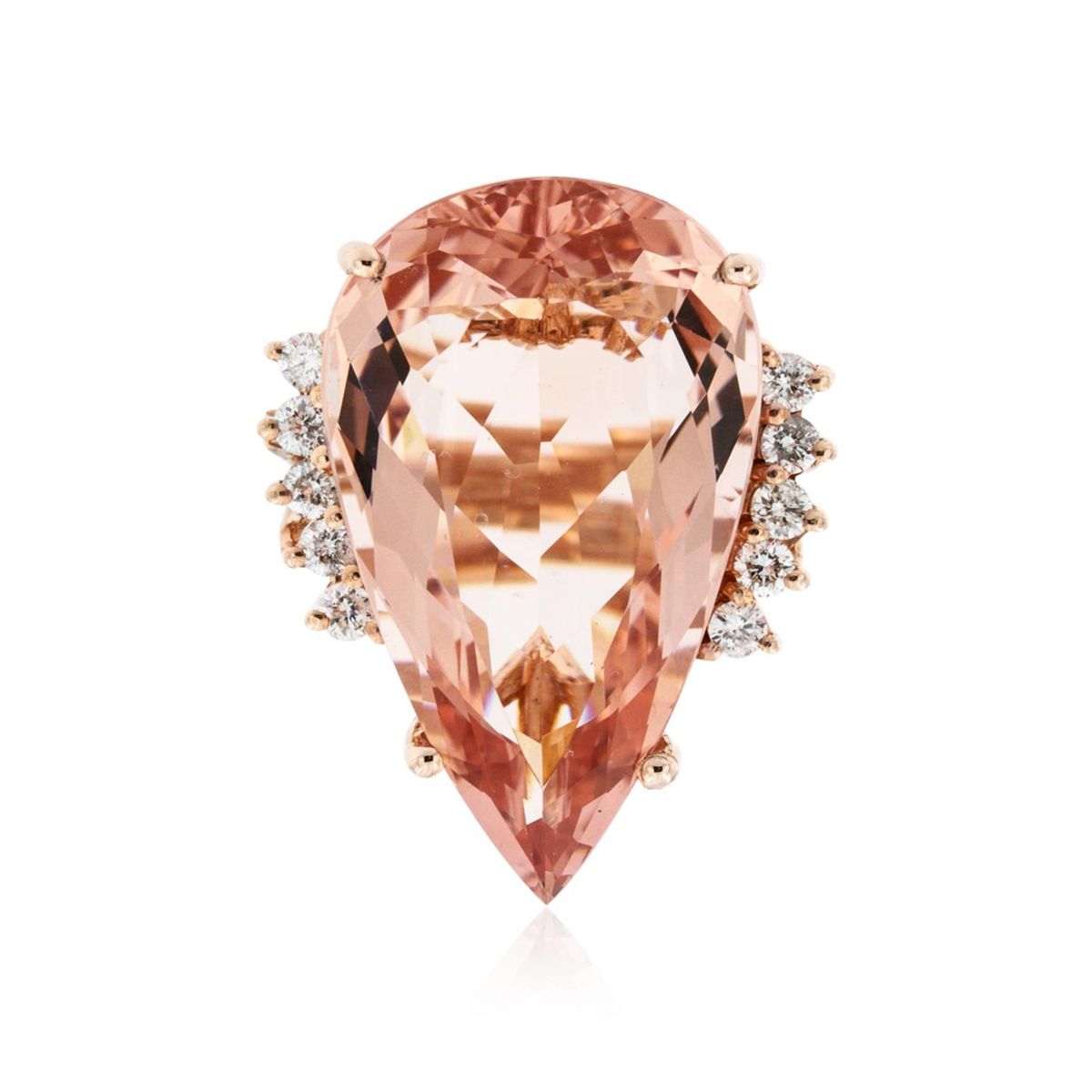 One electronically tested 14KT rose gold ladies cast morganite and diamond ring with a bright polish finish. Condition is new, good workmanship. The featured morganite is framed by mirroring ribbons of diamonds, supported by split shoulders and completed by a three millimeter wide band. Identified with markings of "K14". Containing: One prong set pear modified brilliant cut natural morganite, measuring 28.25 x 16.97 x 8.81mm, exact weight 24.03ct., type I, light Clarity is eye clean, medium, very slightly brownish, pinkish orange color, (GIA piO 5/3), cut is good. Transmitting light with no distortion, transparent. GIA Gemological Report attached. Graded loose prior to setting in the GIA Laboratory, Report #2151961040.Ten prong set round brilliant cut diamonds, measuring 2.30 - 2.20 x 1.35mm (depth est.) approximate. Total Weight of 10 Stones = 0.51ct. Graded in the setting. Clarity: SI-2 to I-1. Color: G - I. Total Weight of Colored Stones 24.03ct. Total Weight of Diamonds 0.51ct. Total Weight of Ring 12.70 grams. AIG Appraised at $21,755.00.