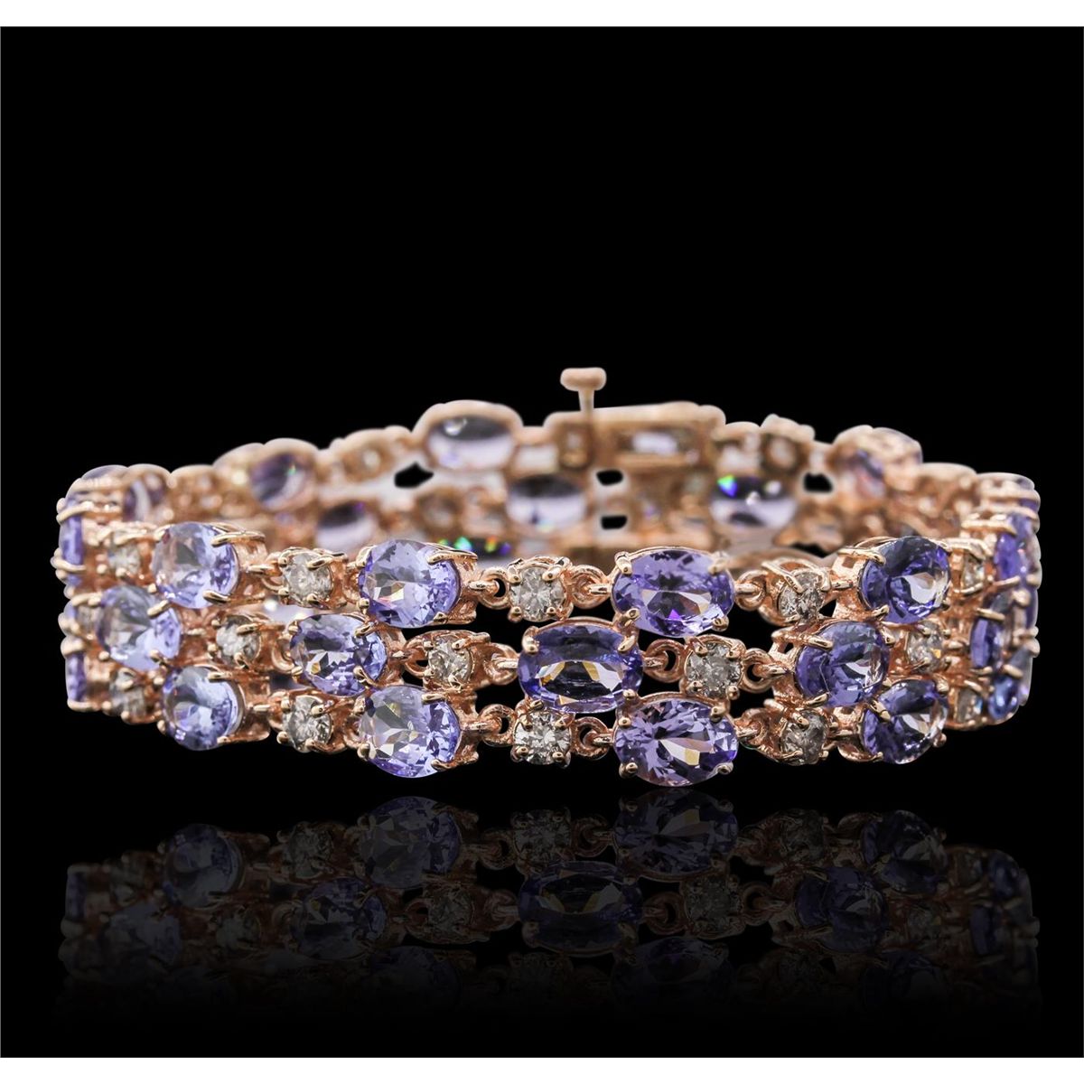 One electronically tested 14KT rose gold Ladies combination cast & assembled bracelet with a hidden box clasp with a bright polish finish. Condition is new. Measurements: 7" in length. Containing: Thirty-six prong set oval modified brilliant cut natural tanzanites, measuring 6.84 x 5.10 x 2.81mm, approximate. Total Weight of 24.17ct., clarity is eye clean, type I, medium light, very slightly grayish, violet color, (GIA V 4/3), cut is very good. Colored gemstones are presumed to have been subjected to commonly used color/clarity enhancement processes. Thirty-Six prong set round brilliant cut diamonds, measuring 3.00 - 3.00 x 1.80mm (depth est.) approximate. Total Weight of 36 Stones = 4.22ct. Clarity: I-1 to I-3. Color: H - I, Cut is Good. Total Weight of Colored Stones 24.17ct. Total Weight of Diamonds 4.22ct. Total Weight of Bracelet 24.70 grams. GGL Appraised at $38,715.00.