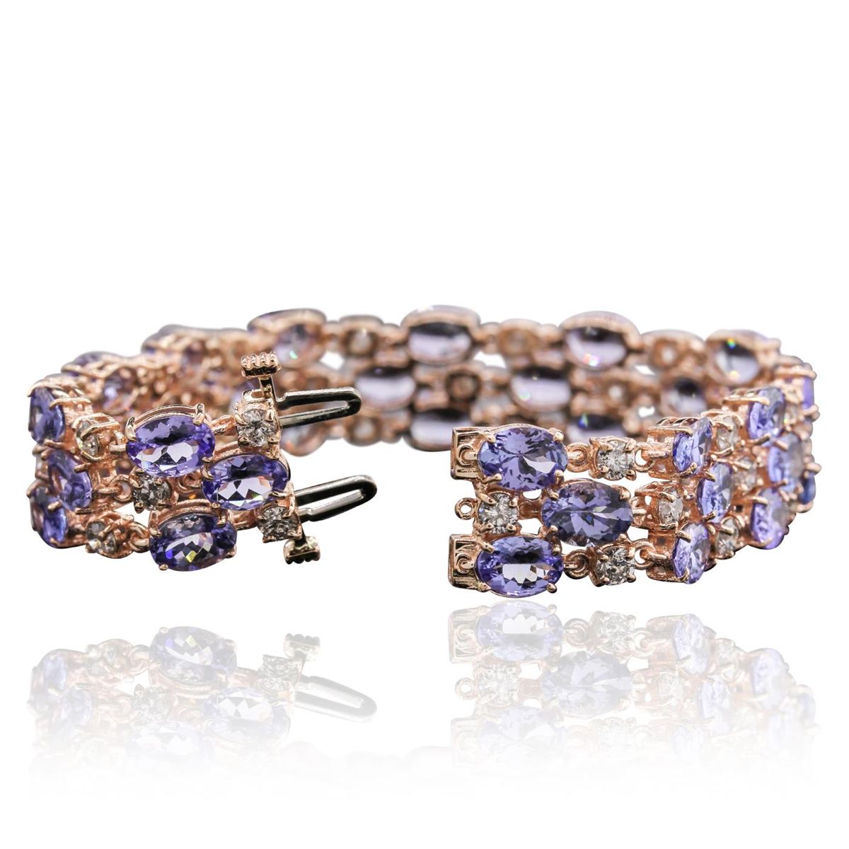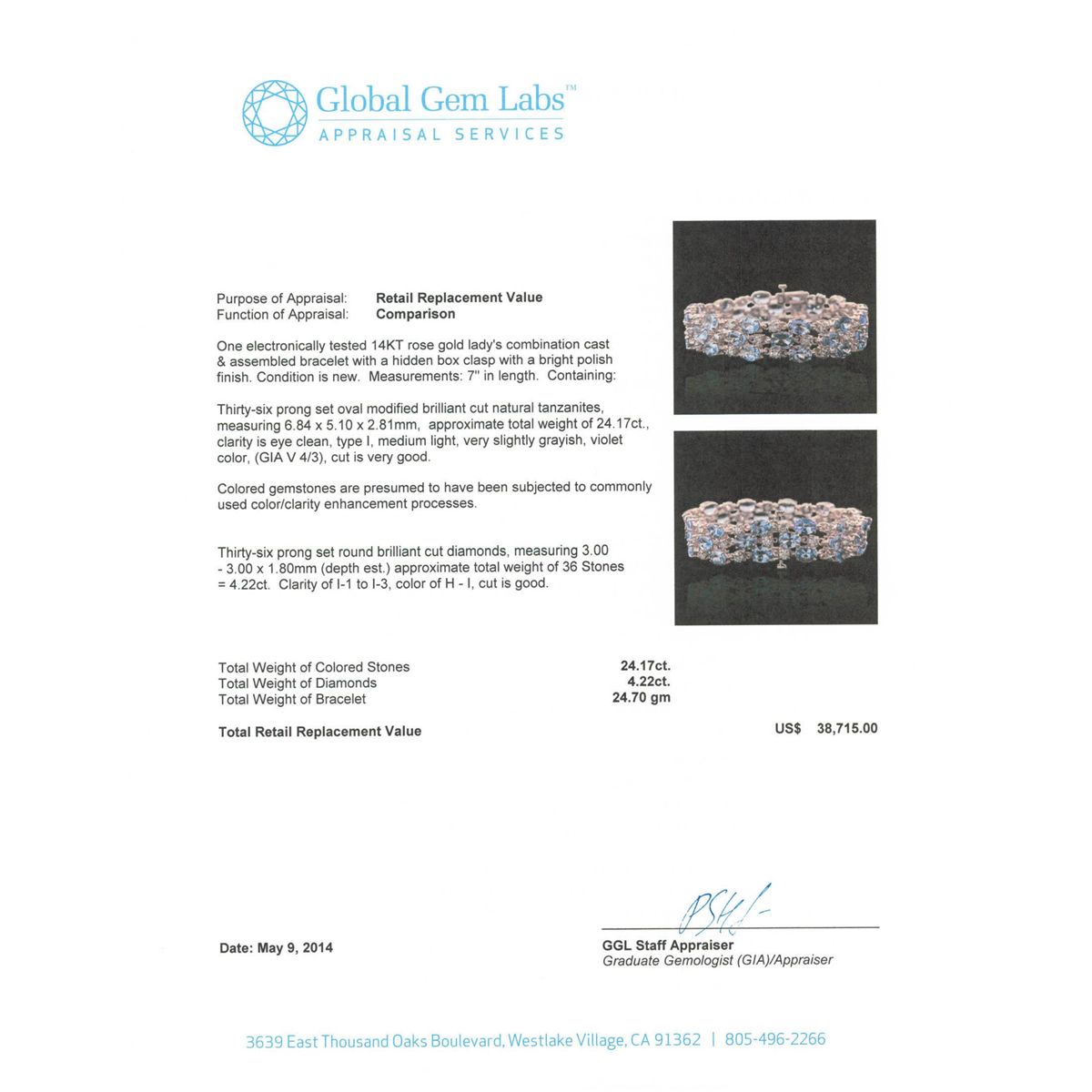 One electronically tested 14KT rose gold Ladies combination cast & assembled bracelet with a hidden box clasp with a bright polish finish. Condition is new. Measurements: 7" in length. Containing: Thirty-six prong set oval modified brilliant cut natural tanzanites, measuring 6.84 x 5.10 x 2.81mm, approximate. Total Weight of 24.17ct., clarity is eye clean, type I, medium light, very slightly grayish, violet color, (GIA V 4/3), cut is very good. Colored gemstones are presumed to have been subjected to commonly used color/clarity enhancement processes. Thirty-Six prong set round brilliant cut diamonds, measuring 3.00 - 3.00 x 1.80mm (depth est.) approximate. Total Weight of 36 Stones = 4.22ct. Clarity: I-1 to I-3. Color: H - I, Cut is Good. Total Weight of Colored Stones 24.17ct. Total Weight of Diamonds 4.22ct. Total Weight of Bracelet 24.70 grams. GGL Appraised at $38,715.00.