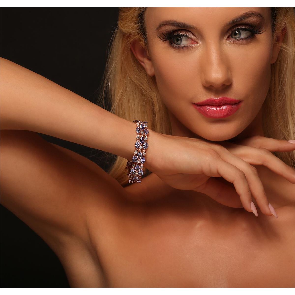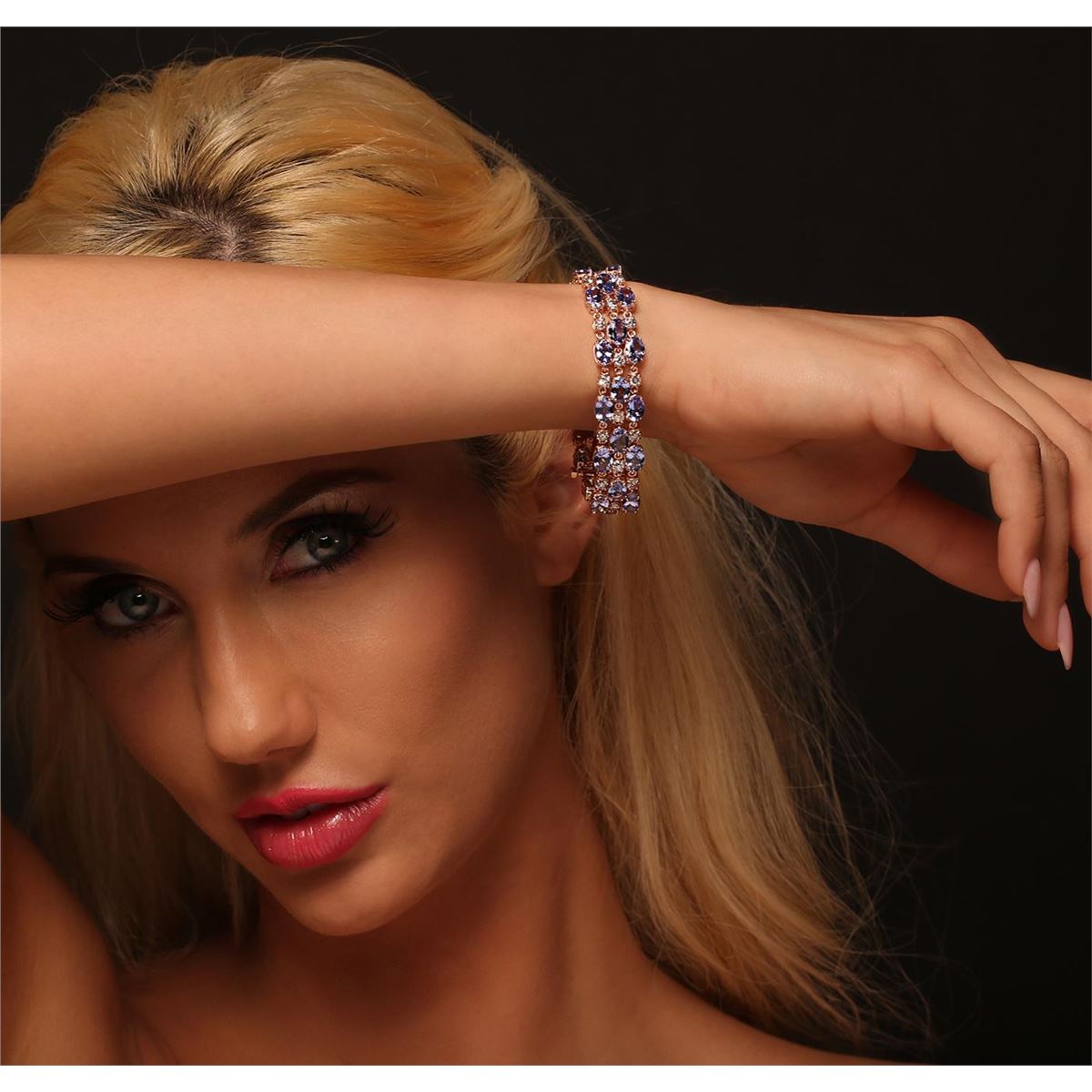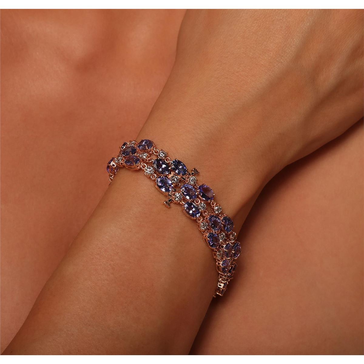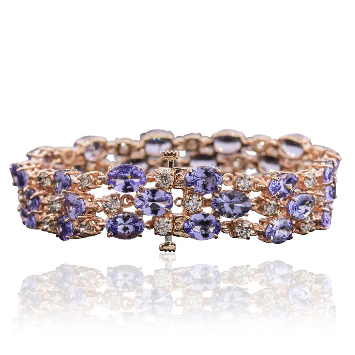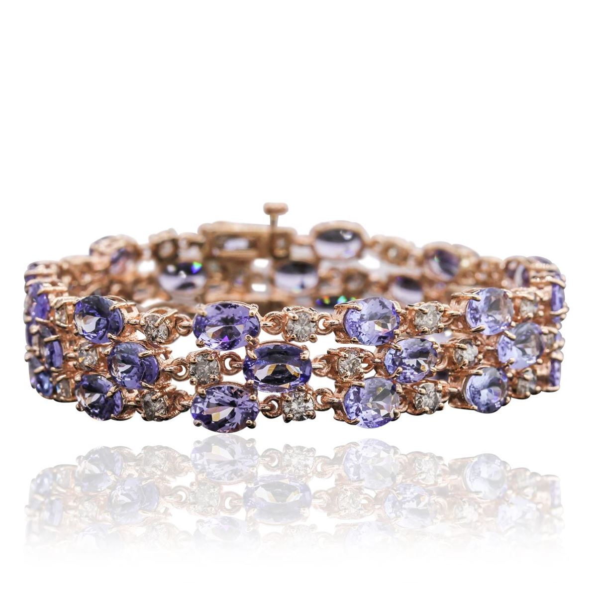 One electronically tested 14KT rose gold Ladies combination cast & assembled bracelet with a hidden box clasp with a bright polish finish. Condition is new. Measurements: 7" in length. Containing: Thirty-six prong set oval modified brilliant cut natural tanzanites, measuring 6.84 x 5.10 x 2.81mm, approximate. Total Weight of 24.17ct., clarity is eye clean, type I, medium light, very slightly grayish, violet color, (GIA V 4/3), cut is very good. Colored gemstones are presumed to have been subjected to commonly used color/clarity enhancement processes. Thirty-Six prong set round brilliant cut diamonds, measuring 3.00 - 3.00 x 1.80mm (depth est.) approximate. Total Weight of 36 Stones = 4.22ct. Clarity: I-1 to I-3. Color: H - I, Cut is Good. Total Weight of Colored Stones 24.17ct. Total Weight of Diamonds 4.22ct. Total Weight of Bracelet 24.70 grams. GGL Appraised at $38,715.00.