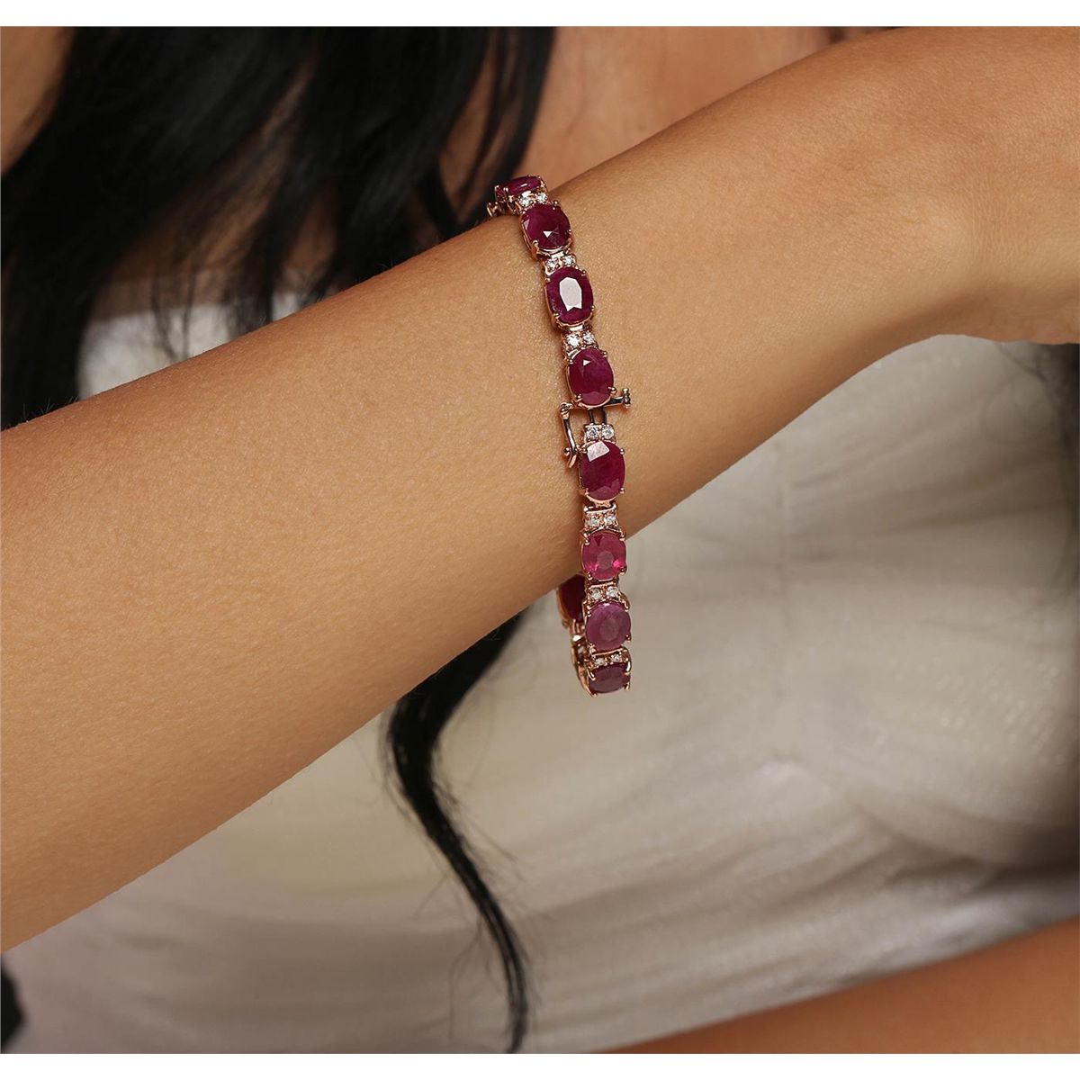 14KT Rose Gold 24.30ctw Ruby and Diamond Bracelet. One electronically tested 14KT rose gold ladies combination cast & assembled bracelet with a hidden box clasp with a bright polish finish. Measurements: 7.25" in length. Identified with markings of "14K". Condition is new. Containing: Fifteen prong set oval modified brilliant cut natural rubies, measuring 8.90 x 7.00 x 3.20mm, approximate total weight of 24.30ct., clarity is heavily included, type II, medium dark, moderately strong, strongly purplish red color, (GIA stpR 6/4), cut is good. Thirty prong set round brilliant cut diamonds, measuring 1.70 - 1.70 x 1.02mm (depth est.) approximate total weight of 30 Stones = 0.54ct. Clarity: I-1 to I-2. Color: I - J, Cut is Good. Colored gemstones are presumed to have been subjected to commonly used enhancement processes. All diamonds and colored gemstones are graded in the mounting, unless otherwise stated. Total Weight of Colored Stones 24.30ct. Total Weight of Diamonds 0.54ct. Total Weight of Bracelet 20.10 grams. GGL Appraised at $15,170.00.