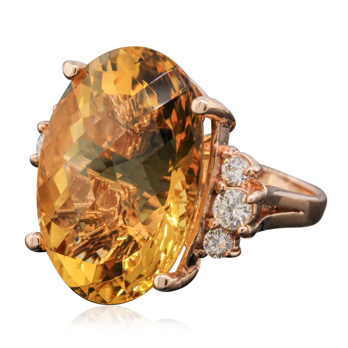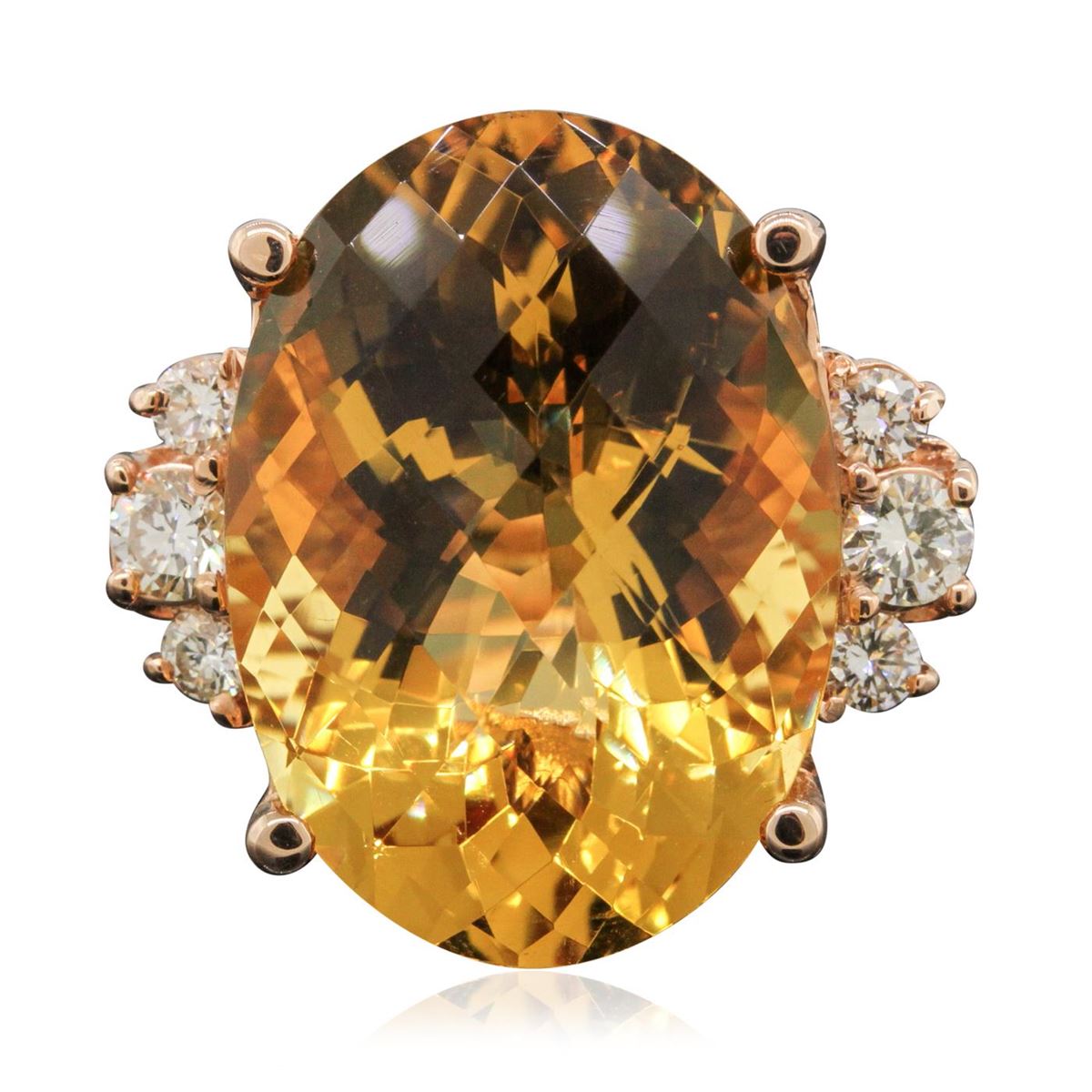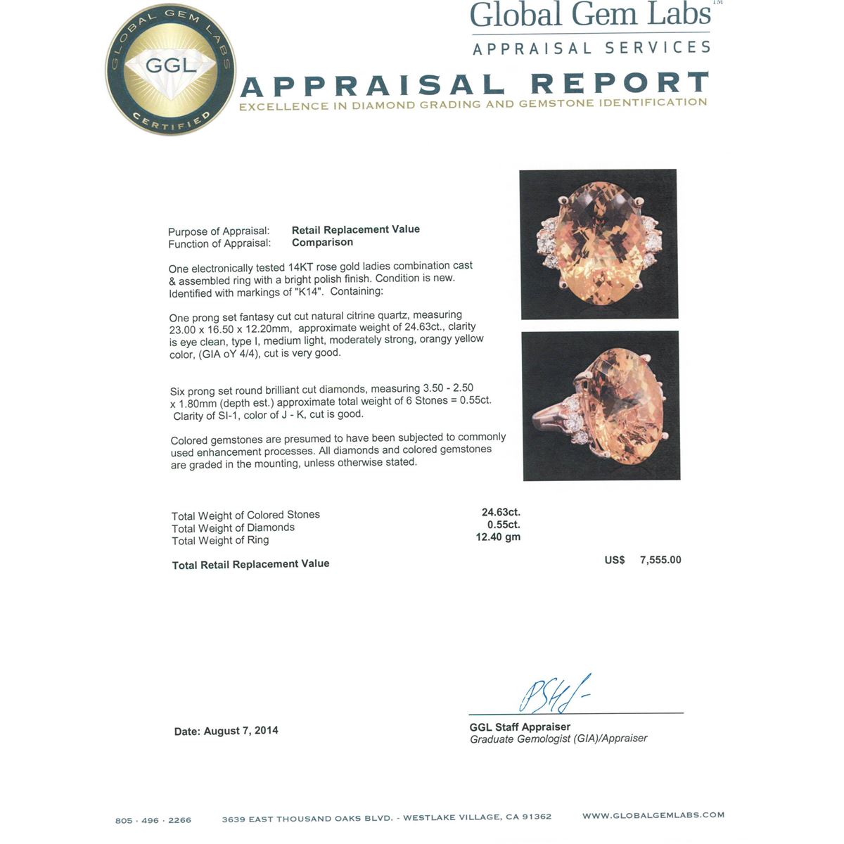 One electronically tested 14KT rose gold ladies combination cast & assembled ring with a bright polish finish. Identified with markings of "K14". Condition is new. Containing: One prong set fantasy cut cut natural citrine quartz, measuring 23.00 x 16.50 x 12.20mm, approximate weight of 24.63ct., clarity is eye clean, type I, medium light, moderately strong, orangy yellow color, (GIA oY 4/4), cut is very good. Six prong set round brilliant cut diamonds, measuring 3.50 - 2.50 x 1.80mm (depth est.) approximate total weight of 6 Stones = 0.55ct. Clarity: SI-1. Color: J - K, Cut is Good. Colored gemstones are presumed to have been subjected to commonly used enhancement processes. All diamonds and colored gemstones are graded in the mounting, unless otherwise stated. Total Weight of Colored Stones 24.63ct. Total Weight of Diamonds 0.55ct. Total Weight of Ring 12.40 grams. GGL Appraised at $7,555.00.