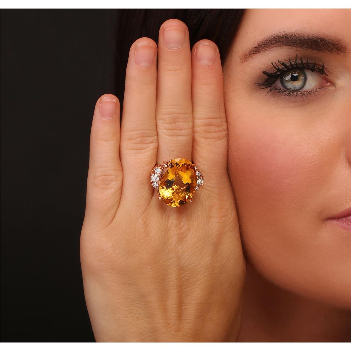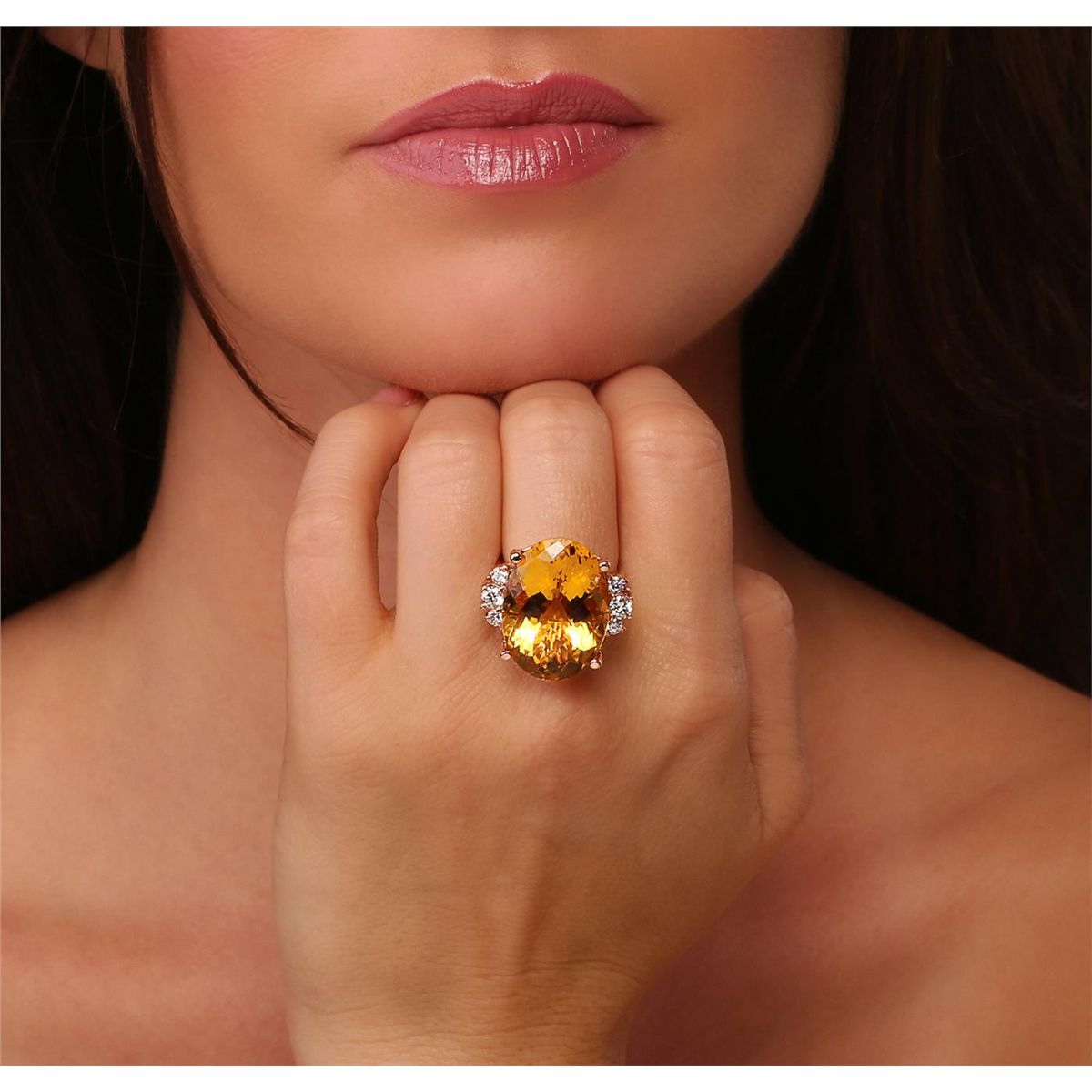 One electronically tested 14KT rose gold ladies combination cast & assembled ring with a bright polish finish. Identified with markings of "K14". Condition is new. Containing: One prong set fantasy cut cut natural citrine quartz, measuring 23.00 x 16.50 x 12.20mm, approximate weight of 24.63ct., clarity is eye clean, type I, medium light, moderately strong, orangy yellow color, (GIA oY 4/4), cut is very good. Six prong set round brilliant cut diamonds, measuring 3.50 - 2.50 x 1.80mm (depth est.) approximate total weight of 6 Stones = 0.55ct. Clarity: SI-1. Color: J - K, Cut is Good. Colored gemstones are presumed to have been subjected to commonly used enhancement processes. All diamonds and colored gemstones are graded in the mounting, unless otherwise stated. Total Weight of Colored Stones 24.63ct. Total Weight of Diamonds 0.55ct. Total Weight of Ring 12.40 grams. GGL Appraised at $7,555.00.