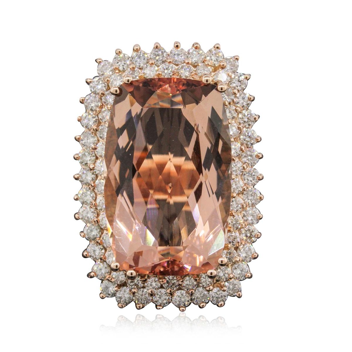 One electronically tested 14KT rose gold ladies combination cast & assembled ring with a bright polish finish. Condition is new. Identified with markings of "K14". Containing: One prong set rectangular cushion modified brilliant cut natural morganite, measuring 25.12 x 16.20 x 9.58mm, approximate weight of 24.92ct., clarity is eye clean, type I, light, brownish, reddish orange color, (GIA rO 3/1), cut is good. Seventy-Two prong set round brilliant cut diamonds, measuring 2.20 - 1.90 x 1.23mm (depth est.) approximate. Total Weight of 72 Stones = 2.27ct. Clarity: SI-1 to SI-2. Color: K - L, Cut is Good. Colored gemstones are presumed to have been subjected to commonly used enhancement processes. All diamonds and colored gemstones are graded in the mounting, unless otherwise stated. Total Weight of Colored Stones 24.92ct. Total Weight of Diamonds 2.27ct. Total Weight of Ring 25.10 grams. GGL Appraised at $25,795.00.