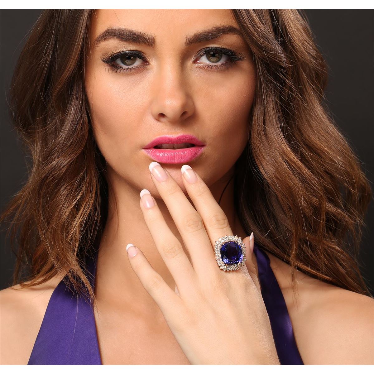 One electronically tested 14KT rose gold ladies cast tanzanite and diamond ring with a bright polish finish. Condition is new, good workmanship. The featured tanzanite is set within two tiered diamond bezels, completed by a two millimeter wide band. Area measurements 26.00 x 23.00mm. Ring size 7.25. Identified with markings of "K14". Containing: One prong set cushion modified brilliant cut natural tanzanite, measuring 16.14 x 15.72 x 11.00mm, exact weight 25.52ct., clarity is eye clean, type I, medium dark, moderately strong, violetish blue color, (GIA vB 6/4), cut is good. Transmitting light with no distortion, transparent. GIA Colored Stone Grading Report attached. Graded loose prior to setting in the GIA Laboratory, Report #2151636312. Tanzanite is a very rare gemstone that is only found in the country of Tanzania. Originally discovered in 1967. Tiffany & Company, named the stone Tanzanite. It is found in the Usumburu Mountains that border the Umba Valley of northern Tanzania. Tanzanite occurs in gray, brown, violet, blue, reddish-purple, & green. The gem is interesting because of its exceptional pleochroism. Rotated in different directions a tanzanite will exhibit multiple changes of color. Tanzanite has a low tolerance to ultrasonic cleaning, and should not be cleaned using this method. Sixty prong set round brilliant cut diamonds, measuring 2.30 - 2.10 x 1.32mm (depth est.) approximate total weight of 60 Stones = 2.42ct. Color grade is an average for the group. Graded in the setting. Clarity SI-1 to I-1. Color Light Brown. Total Weight of Colored Stones 25.52ct. Total Weight of Diamonds 2.42ct. Total Weight of Ring 16.43gm. AIG Appraised at $75,425.00.