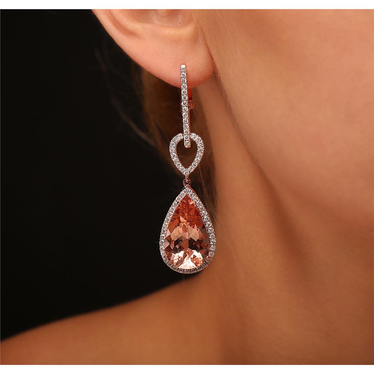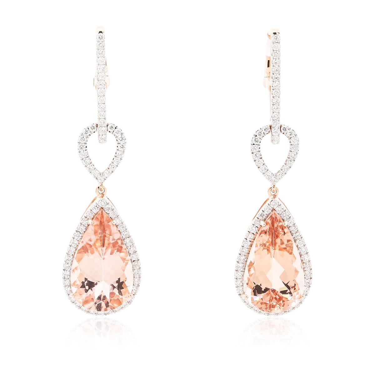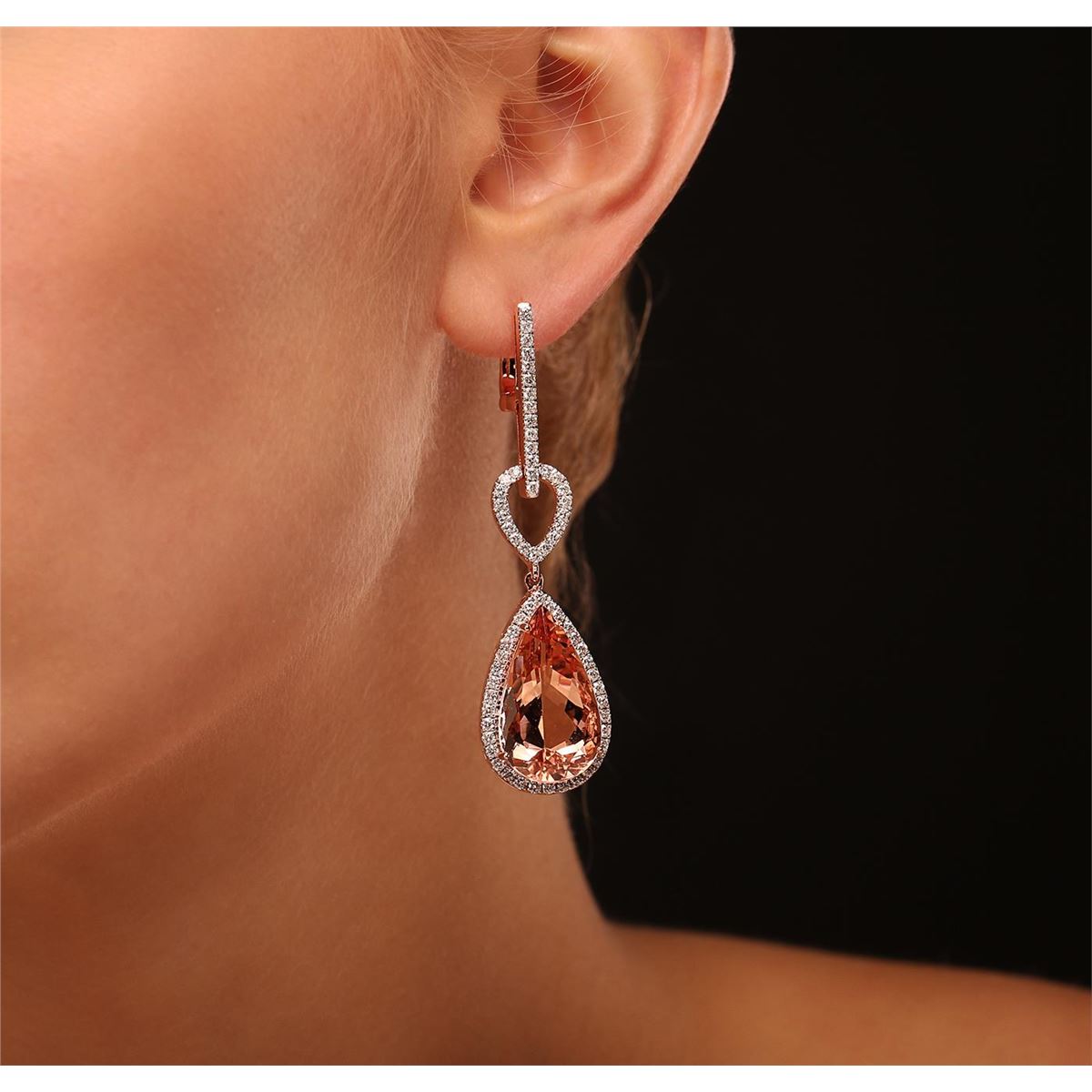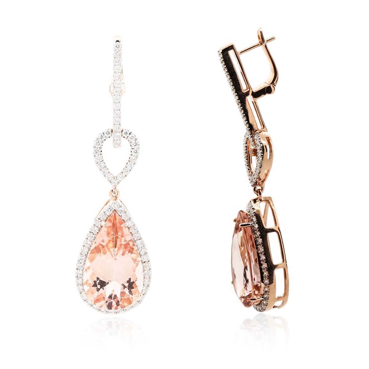 One pair electronically tested 14KT rose gold Ladies combination cast & assembled bee earrings with friction posts with a bright polish finish. Condition is new. Identified with markings of "14K". Containing: Two prong set pear modified brilliant cut natural morganites, measuring 21.00 x 13.00 x 8.80mm, approximate. Total Weight of 26.14ct., clarity is eye clean, type I, light, brownish, reddish orange color, (GIA rO 3/1), cut is good. Colored gemstones are presumed to have been subjected to commonly used color/clarity enhancement processes. One Hundred Thirty prong set round brilliant cut diamonds, measuring 1.60 - 1.60 x 0.96mm (depth est.) approximate. Total Weight of 130 Stones = 1.94ct. Clarity: I-1 to I-2. Color: H - I, Cut is Good. Total Weight of Colored Stones 26.14ct. Total Weight of Diamonds 1.94ct. Total Weight of Earrings 20.90 grams. GGL Appraised at $15,230.00.