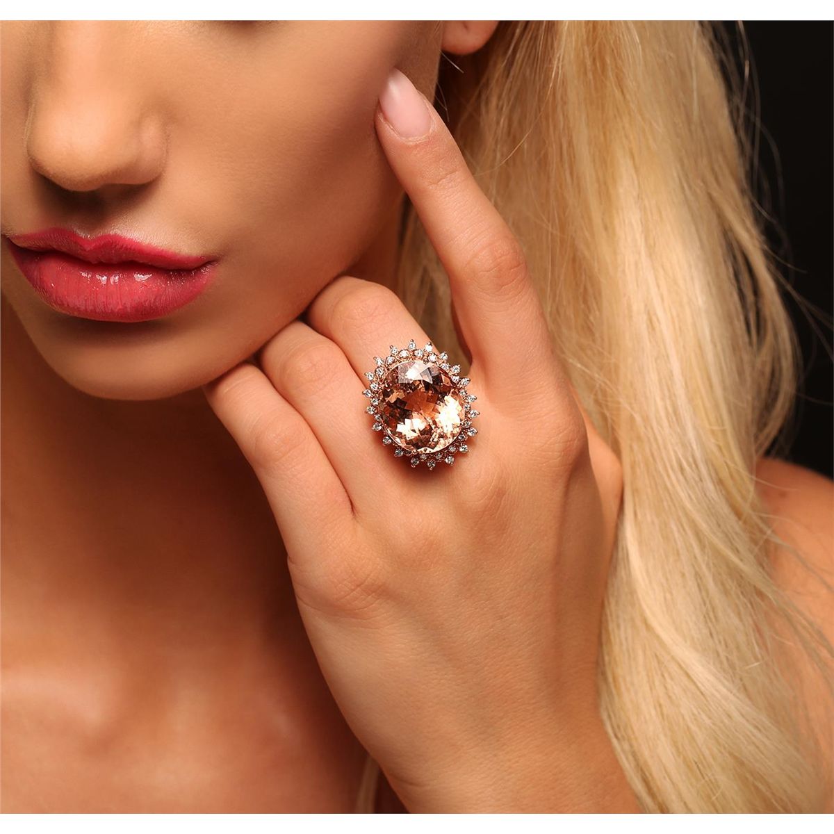 One electronically tested 14KT rose gold ladies cast morganite and diamond ring. Condition is new, good workmanship. The featured morganite is set within a stylized diamond floret bezel supported by tapering shoulders, completed by a two millimeter wide band. Bright polish finish with milgrain detailing. Identified with markings of "K14". Containing: One prong set oval modified brilliant cut natural morganite, measuring 20.67 x 18.40 x 11.72mm, approximate weight of 26.21ct., type I Clarity is eye clean, medium, very slightly brownish, pinkish orange color, (GIA piO 5/3), cut is good. Transmitting light with no distortion, transparent. GIA Gemological Report attached. Graded loose prior to setting in the GIA Laboratory, Report #2151962594.Forty prong set round brilliant cut diamonds, measuring 1.80 - 1.60 x 1.02mm (depth est.) approximate. Total Weight of 40 Stones = 0.81ct. Graded in the setting. Clarity: SI-1 to I-1. Color: G - I. Total Weight of Colored Stones 26.21ct. Total Weight of Diamonds 0.81ct. Total Weight of Ring 11.51 grams. AIG Appraised at $23,980.00.