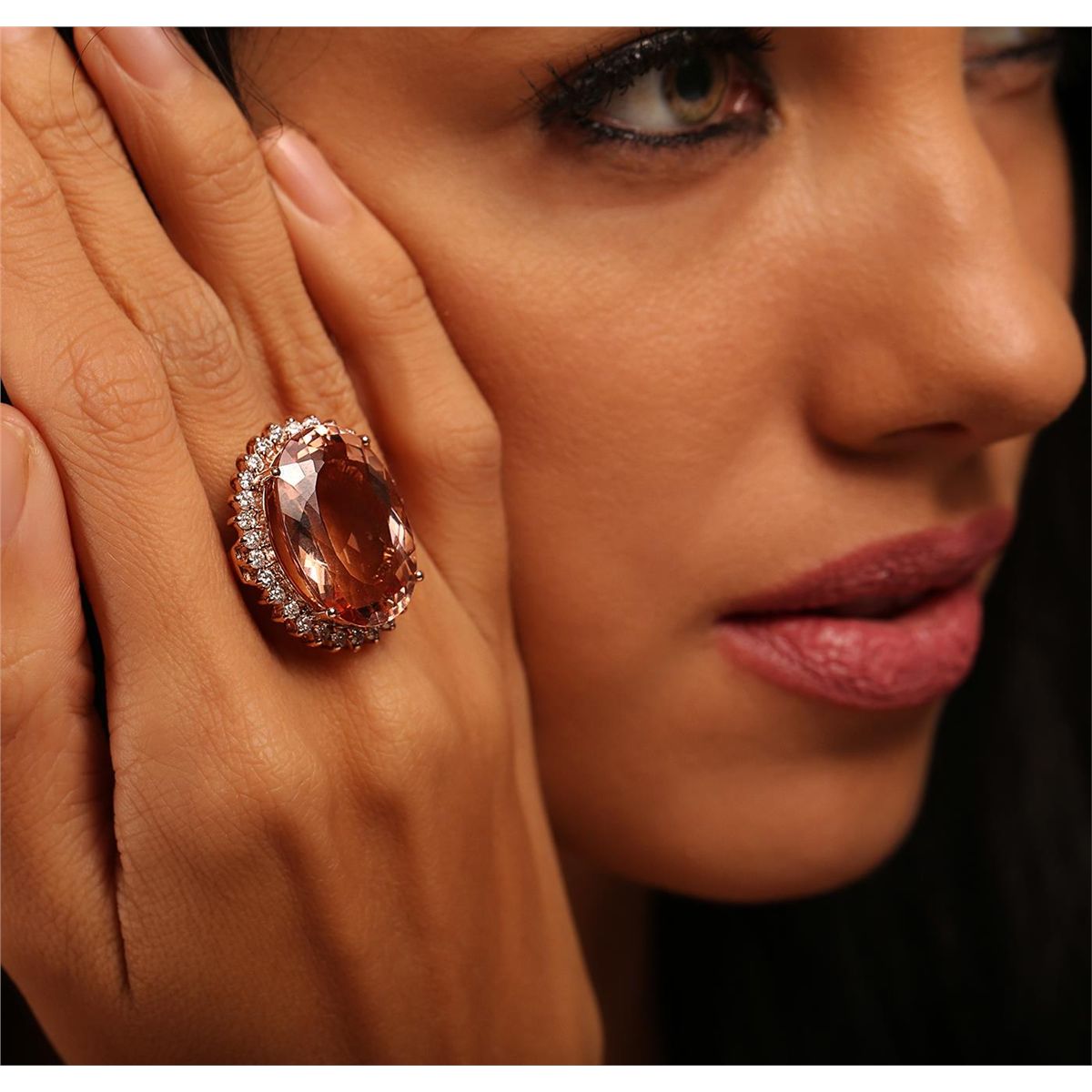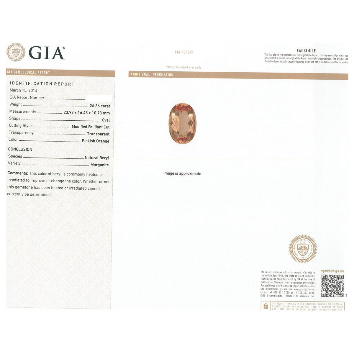 One electronically tested 14KT rose gold ladies cast morganite and diamond ring with a bright polish finish. Condition is new, good workmanship. The featured morganite is set within a diamond bezel supported by tapering shoulders, completed by a two and one-half millimeter wide band. Identified with markings of "K14". Containing: One prong set oval modified brilliant cut natural morganite, measuring 23.92 x 16.43 x 10.73mm, exact weight 26.36ct., type I Clarity is eye clean, medium, very slightly brownish, pinkish orange color, (GIA piO 5/3), cut is good. Transmitting light with no distortion, transparent. GIA Gemological Report attached. Graded loose prior to setting in the GIA Laboratory, Report #2151962020.Thirty prong set round brilliant cut diamonds, measuring 2.30 - 2.20 x 1.35mm (depth est.) approximate. Total Weight of 30 Stones = 1.35ct. Graded in the setting. Clarity: SI-1 to I-1. Color: G - I. Total Weight of Colored Stones 26.36ct. Total Weight of Diamonds 1.35ct. Total Weight of Ring 14.07 grams. AIG Appraised at $26,175.00.
