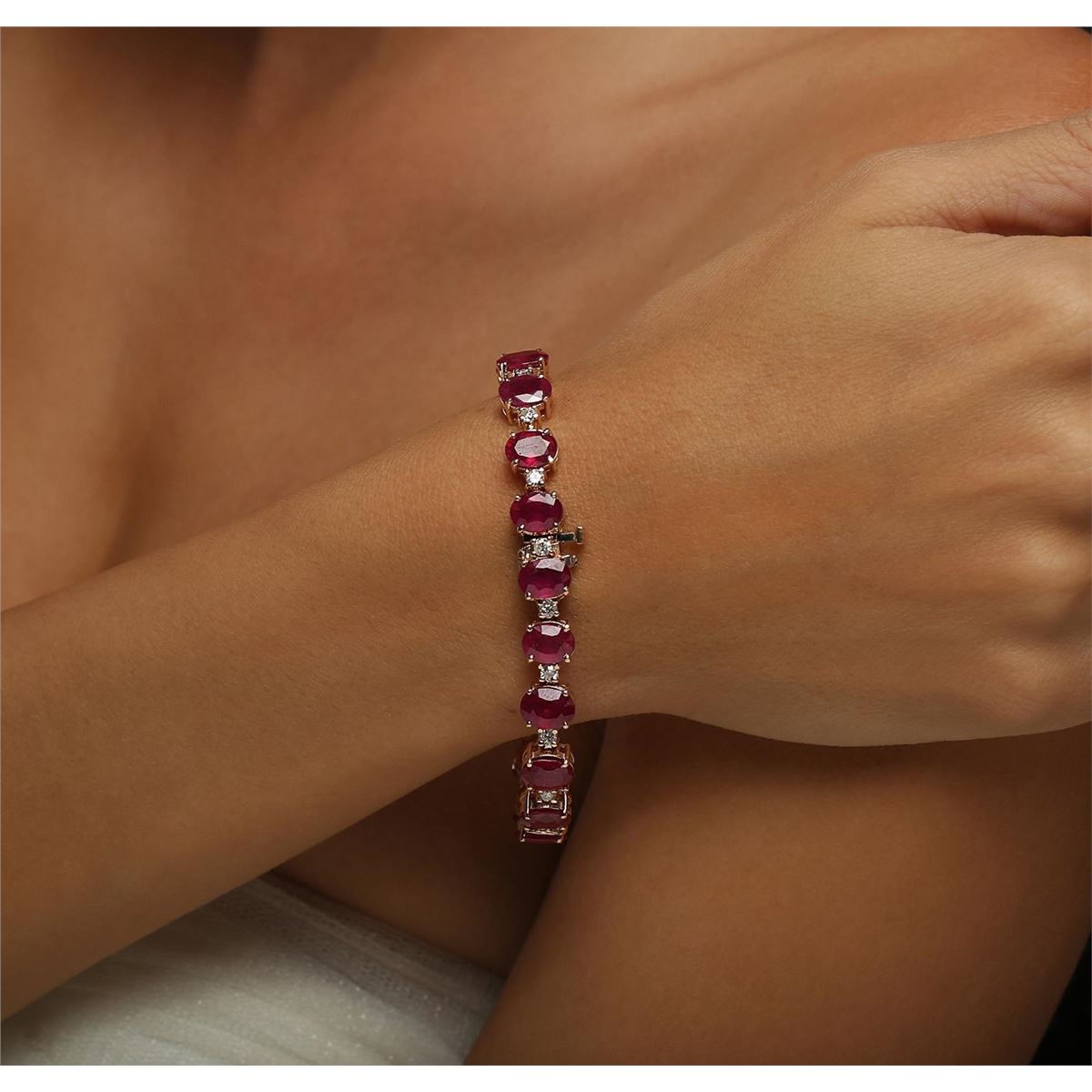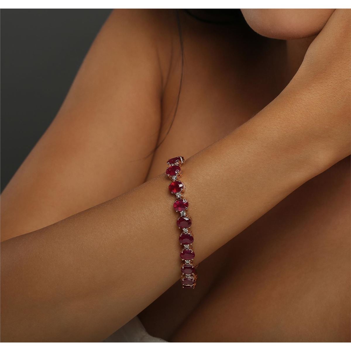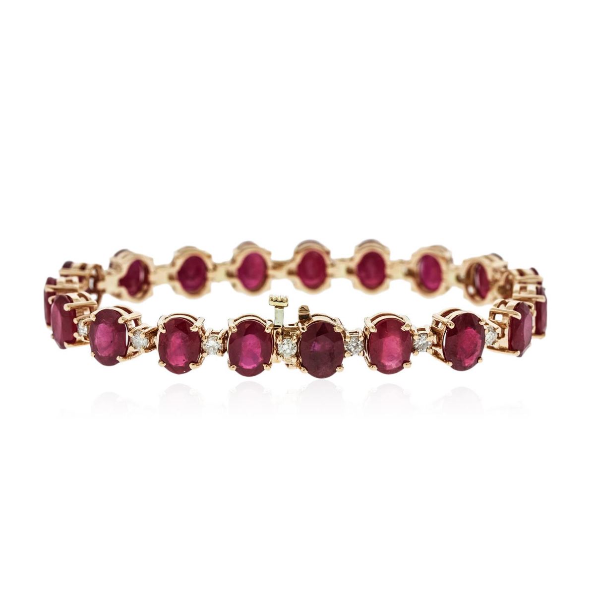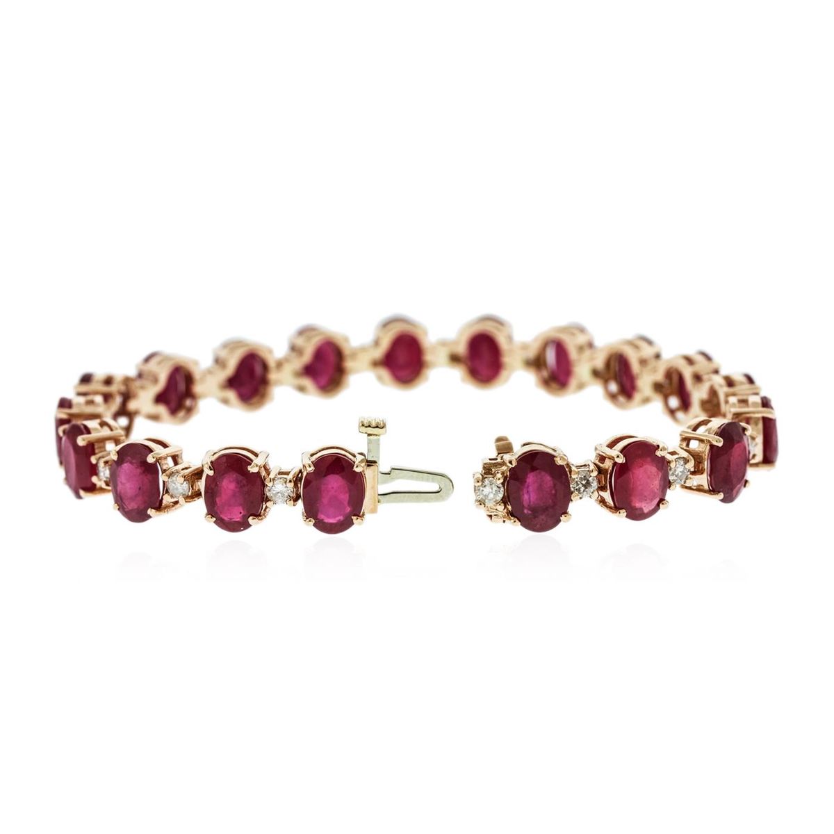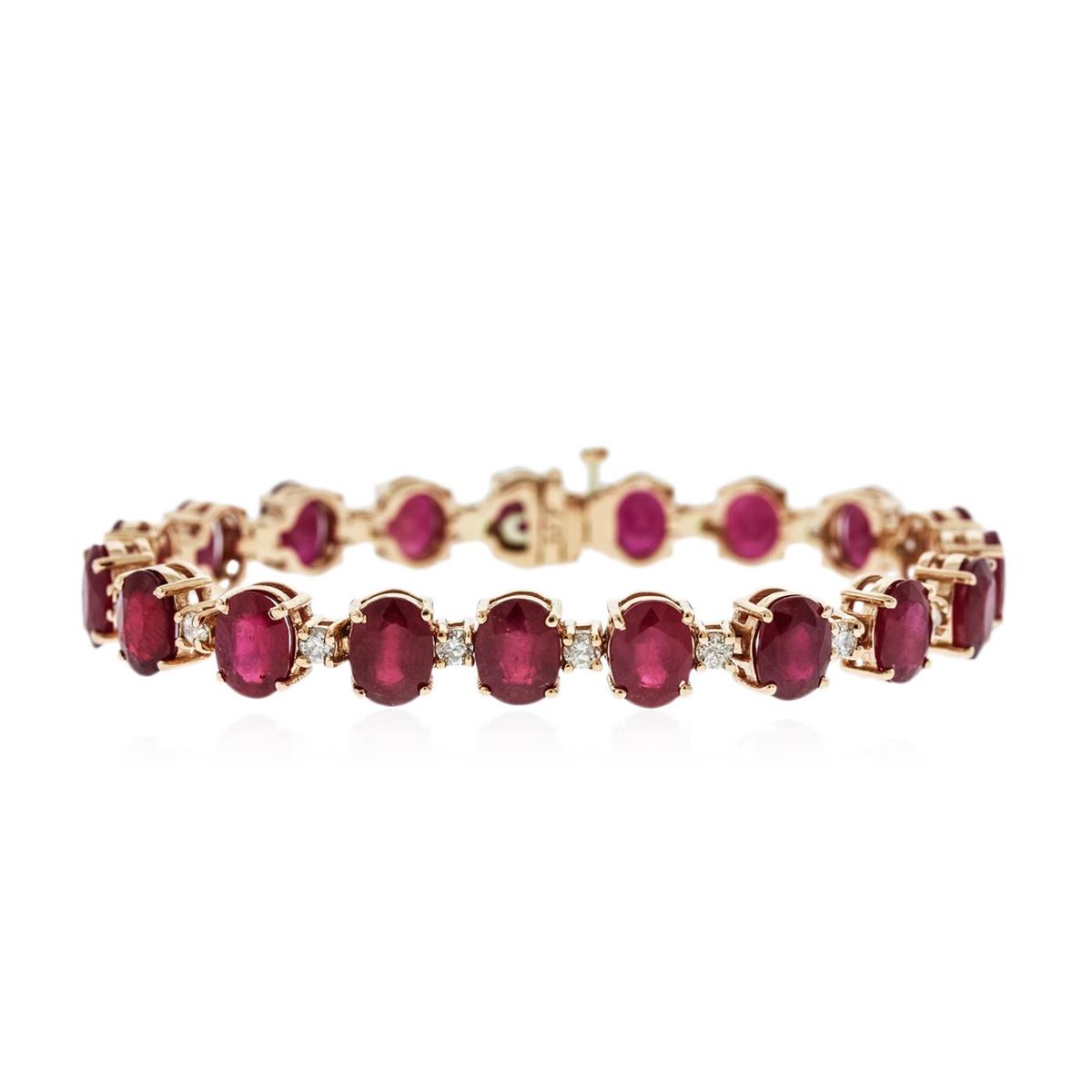 One electronically tested 14KT rose gold ladies combination cast & assembled bracelet with a hidden box clasp with a bright polish finish. Measurements: 6.85" in length. Identified with markings of "14K". Condition is new. Containing: Nineteen prong set oval modified brilliant cut natural rubies, measuring 8.00 x 6.00 x 3.75mm, approximate total weight of 28.72ct., clarity is heavily included, medium dark, moderately strong, strongly purplish red color, (GIA stpR 6/4), cut is good. Nineteen prong set round brilliant cut diamonds, measuring 2.50 - 2.50 x 1.50mm (depth est.) approximate total weight of 19 Stones = 1.09ct. Clarity: I-1 to I-2. Color: K - L, Cut is Good. Colored gemstones are presumed to have been subjected to commonly used enhancement processes. All diamonds and colored gemstones are graded in the mounting, unless otherwise stated. Total Weight of Colored Stones 28.72ct. Total Weight of Diamonds 1.09ct. Total Weight of Bracelet 22.70 grams. GGL Appraised at $14,120.00.
