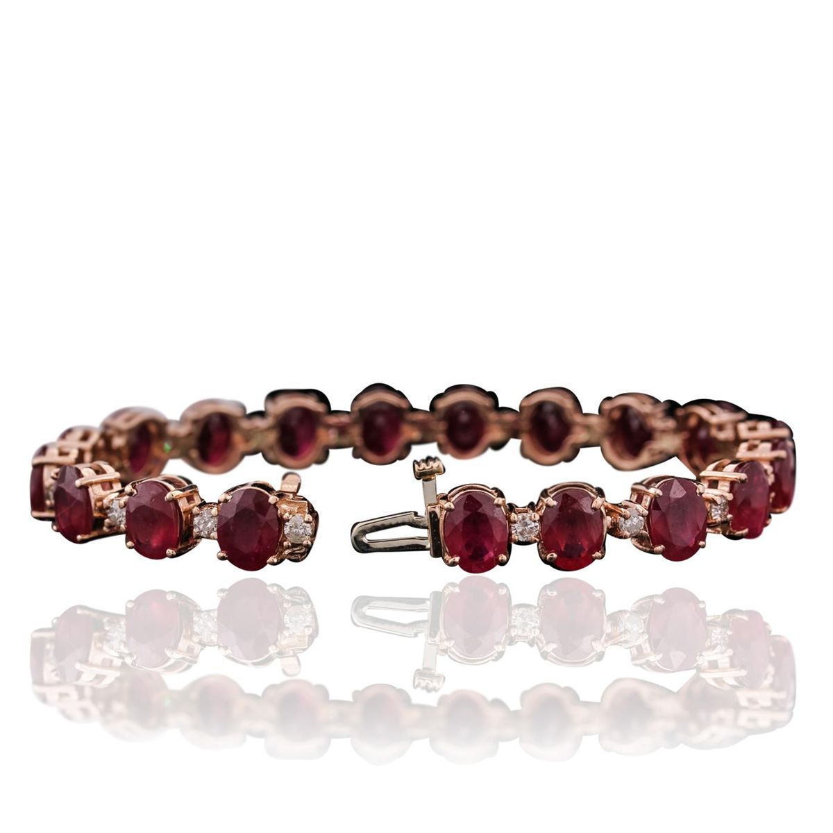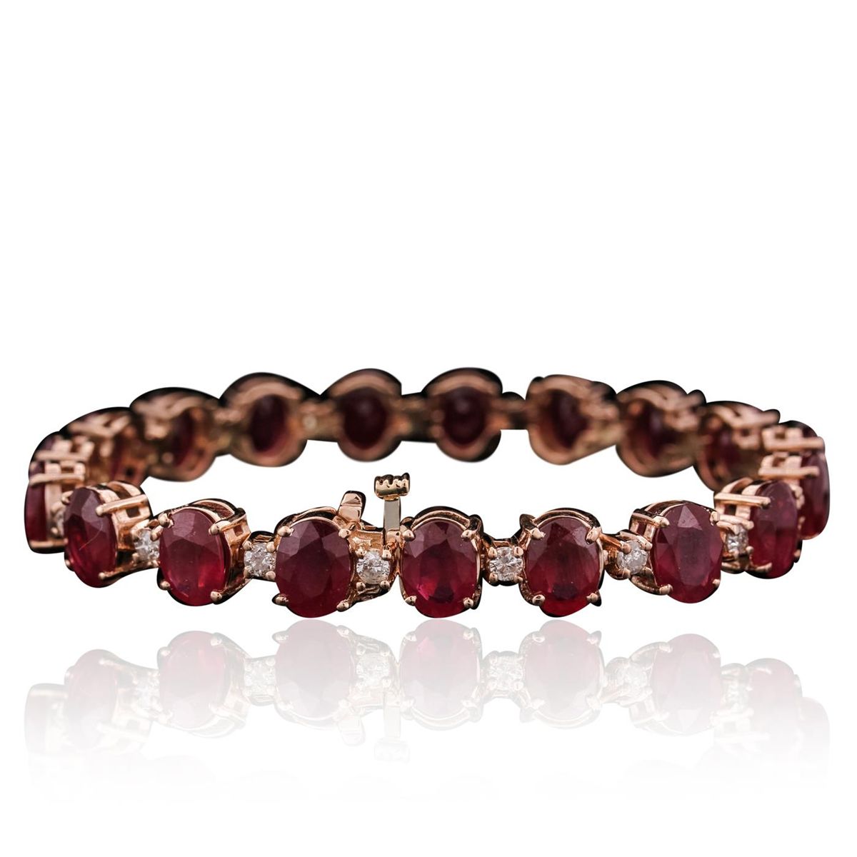 One electronically tested 14KT rose gold ladies combination cast & assembled bracelet with a hidden box clasp with a bright polish finish. Measurements: 6.85" in length. Identified with markings of "14K". Condition is new. Containing: Nineteen prong set oval modified brilliant cut natural rubies, measuring 8.00 x 6.00 x 3.75mm, approximate total weight of 28.72ct., clarity is heavily included, medium dark, moderately strong, strongly purplish red color, (GIA stpR 6/4), cut is good. Nineteen prong set round brilliant cut diamonds, measuring 2.50 - 2.50 x 1.50mm (depth est.) approximate total weight of 19 Stones = 1.09ct. Clarity: I-1 to I-2. Color: K - L, Cut is Good. Colored gemstones are presumed to have been subjected to commonly used enhancement processes. All diamonds and colored gemstones are graded in the mounting, unless otherwise stated. Total Weight of Colored Stones 28.72ct. Total Weight of Diamonds 1.09ct. Total Weight of Bracelet 22.70 grams. GGL Appraised at $14,120.00.