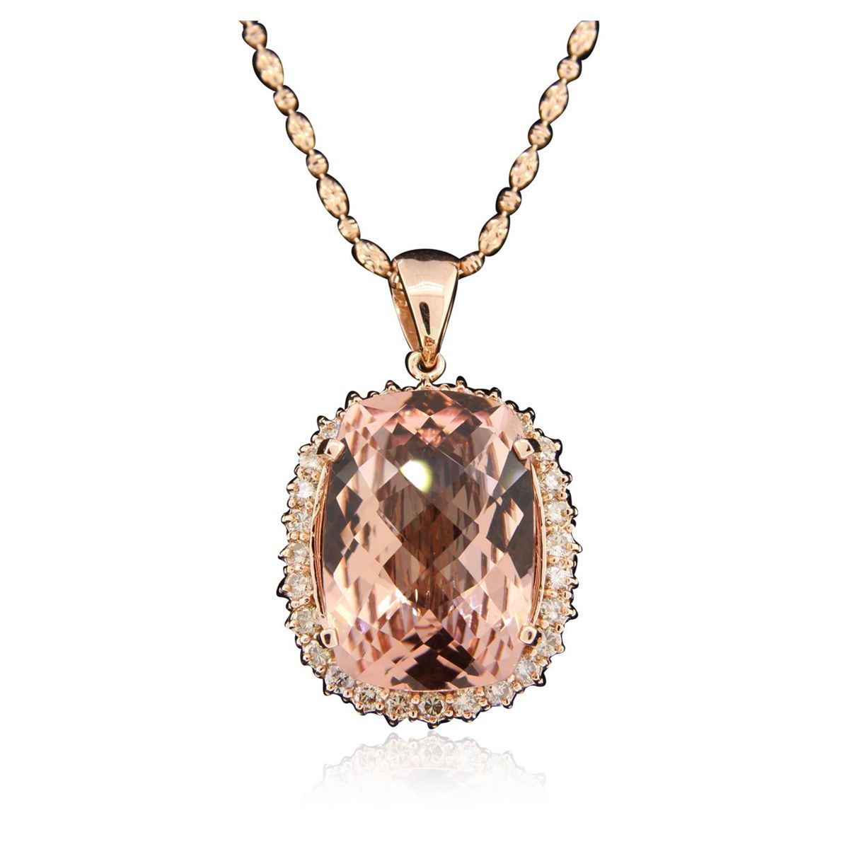 One electronically tested 14KT rose gold ladies cast & assembled morganite and diamond pendant with chain. The pendant features a morganite set within a diamond bezel, completed by a rose gold bail. The pendant is supported by an elaborate eighteen inch length designer style bright cut beaded chain terminating in a lobster claw clasp. Bright polish finish. Identified with markings of "K14". Condition is new, good workmanship. Containing: One prong set rectangular cushion modified mixed cut natural morganite, measuring 25.88 x 18.05 x 10.29mm, exact weight 29.85ct., type I Clarity is eye clean, medium, very slightly brownish, Pink-Orange color, (GIA PiO 5/3), cut is good. Transmitting light with no distortion, transparent. GIA Colored Stone Grading Report attached. Graded loose prior to setting in the GIA Laboratory, Report # 6157736139.Twenty-Eight prong set round brilliant cut diamonds, measuring 2.70 - 2.50 x 1.56mm (depth est.) approximate. Total Weight of 28 Stones = 1.93ct. Faint secondary color throughout. Graded in the setting. Clarity: SI-1 to I-1 . Color: K - M. Total Weight of Colored Stones 29.85ct.. Total Weight of Diamonds 1.93ct. AIG Appraised at $27,470.00.