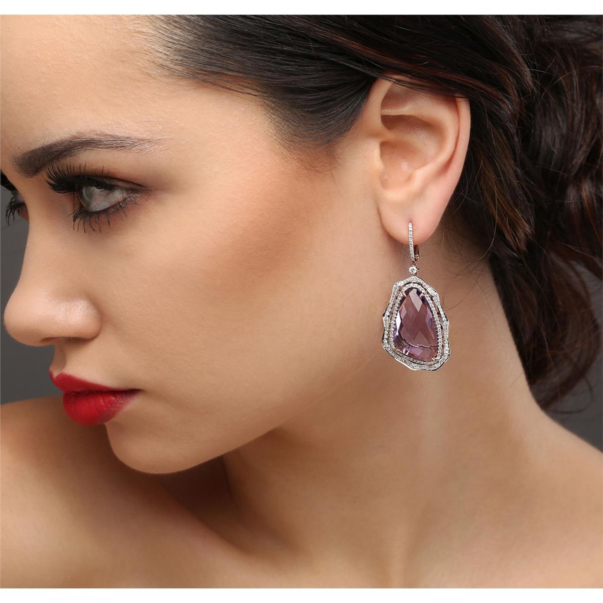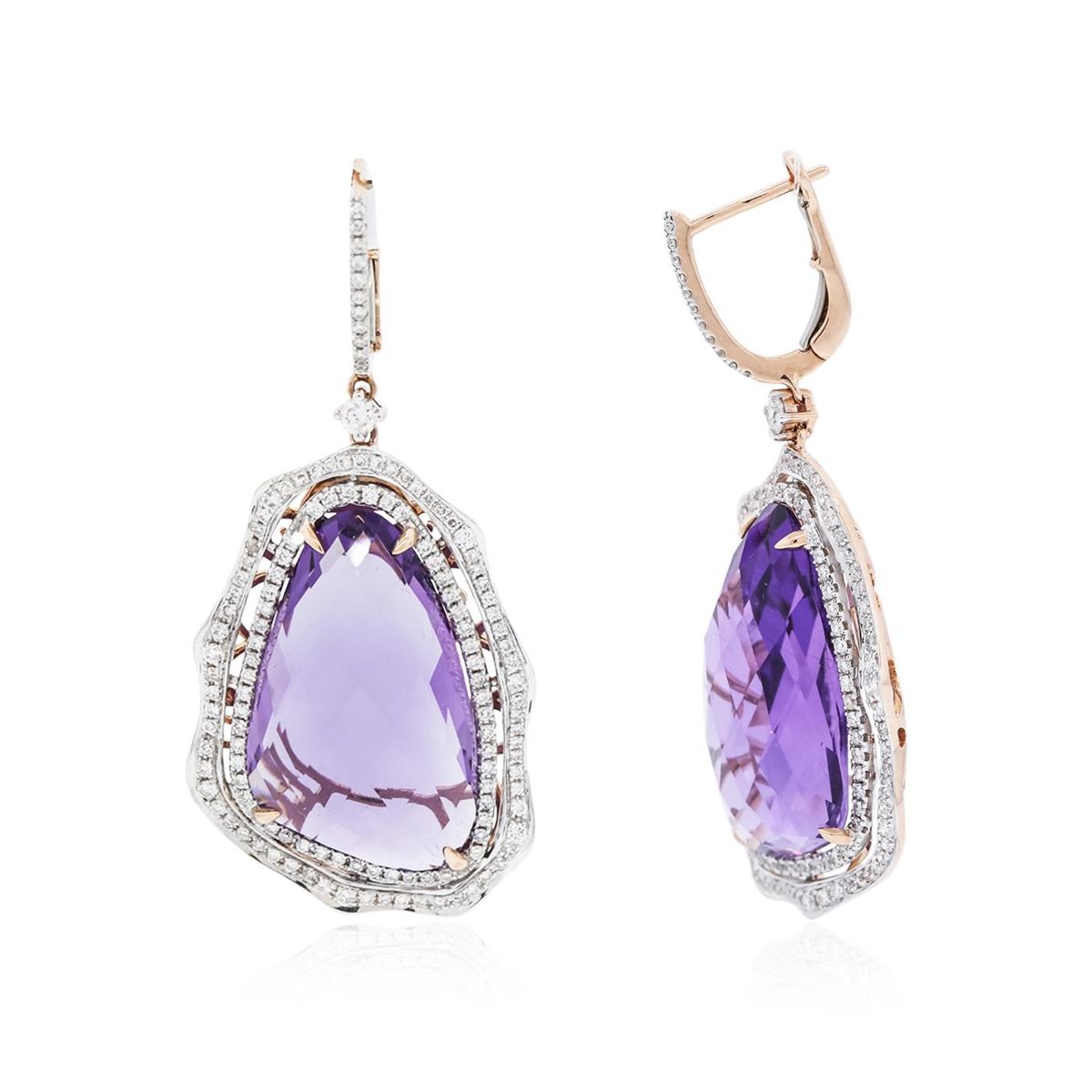 One polished, stamped, and tested pair of 14KT rose gold "Michael Christoff" designer earrings mounted with: 2 genuine amethyst center stones weighing 29.95ct, and 264 genuine round diamonds weighing 1.48ct. This item weighs 16.30 grams. Condition is new, excellent workmanship. AIGL Appraised at $15,744.00.