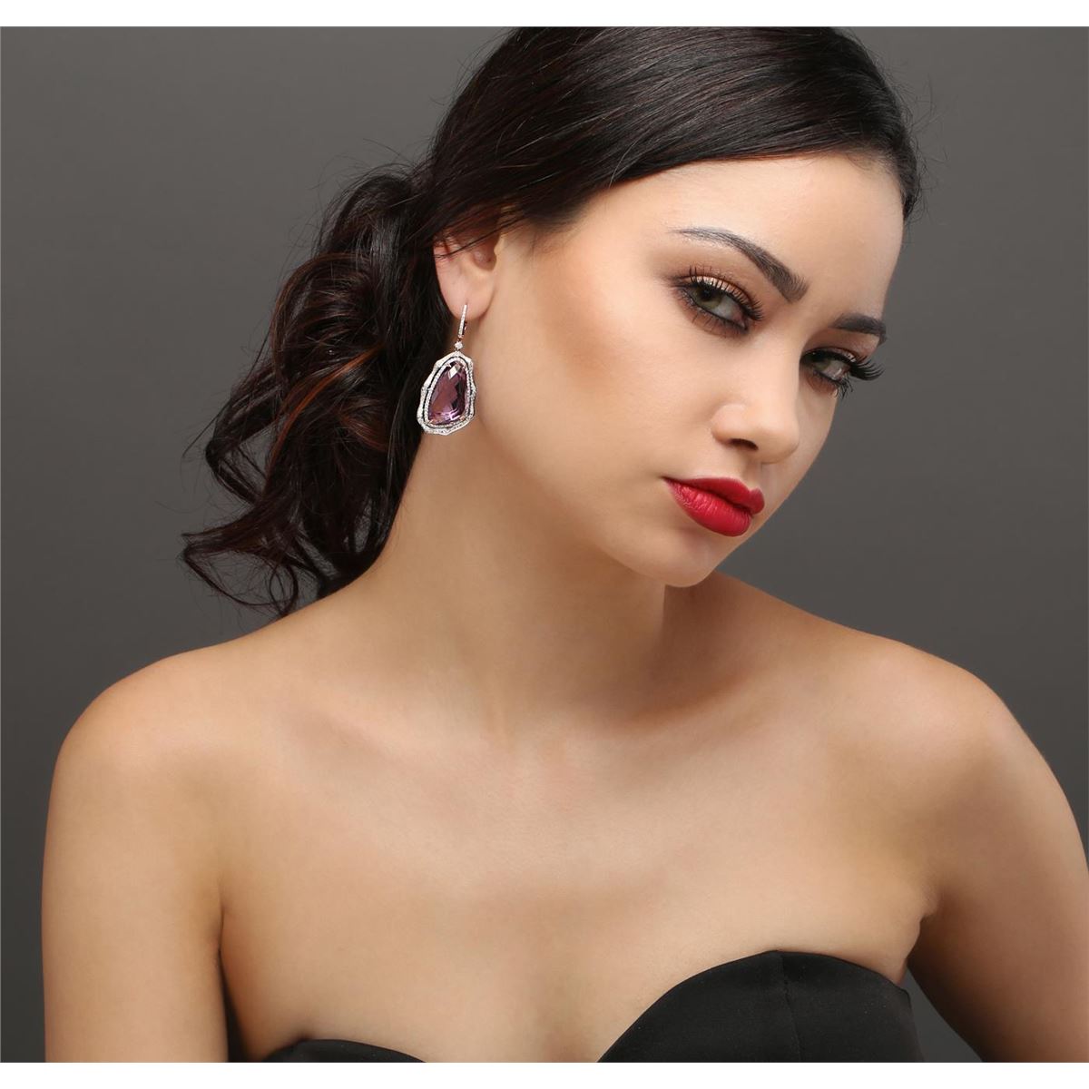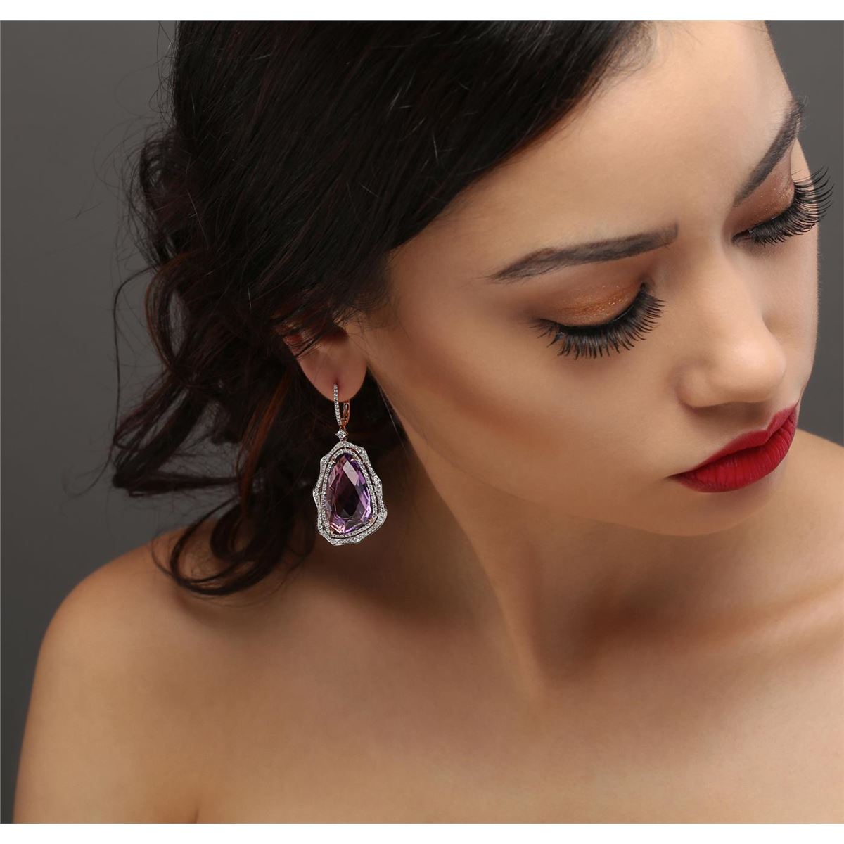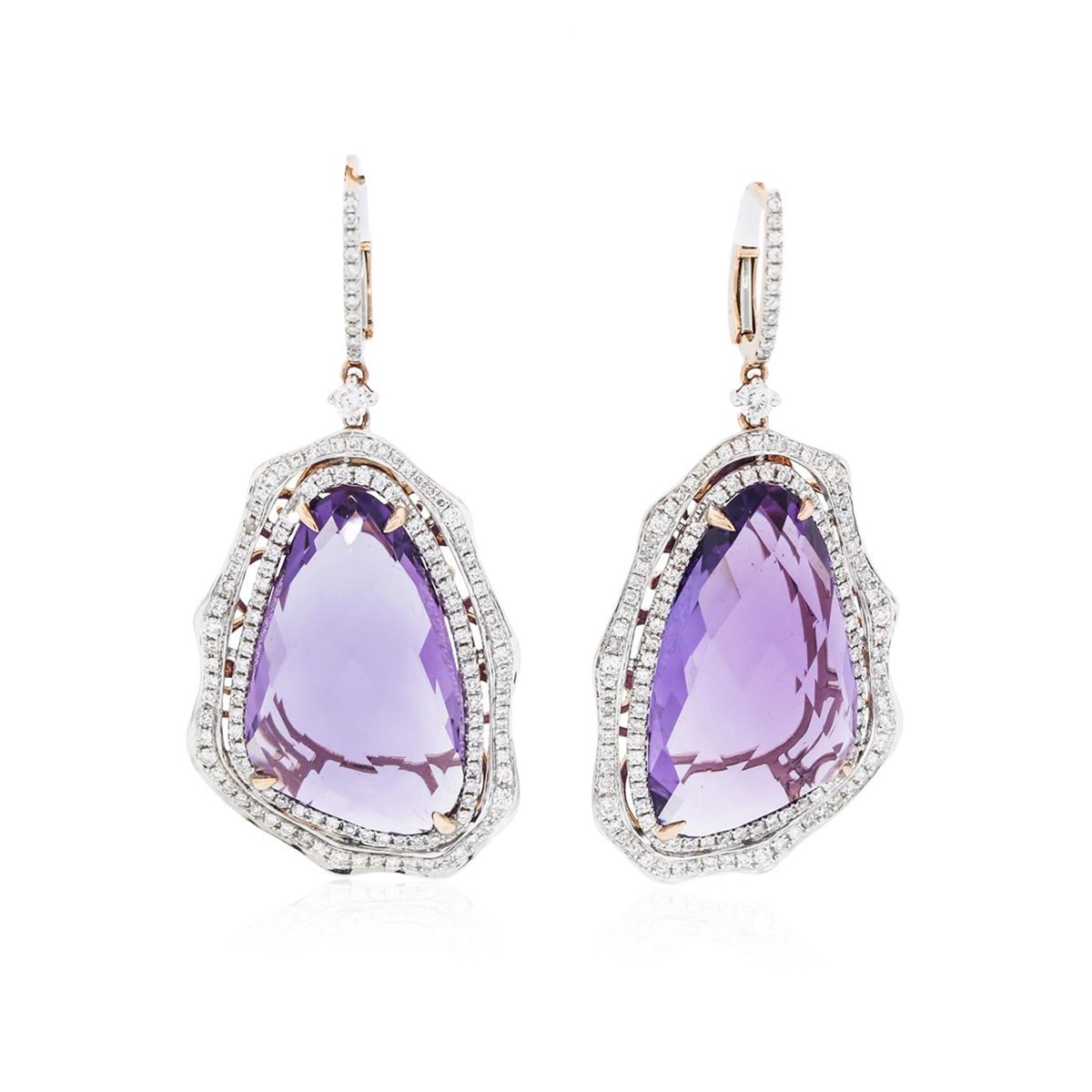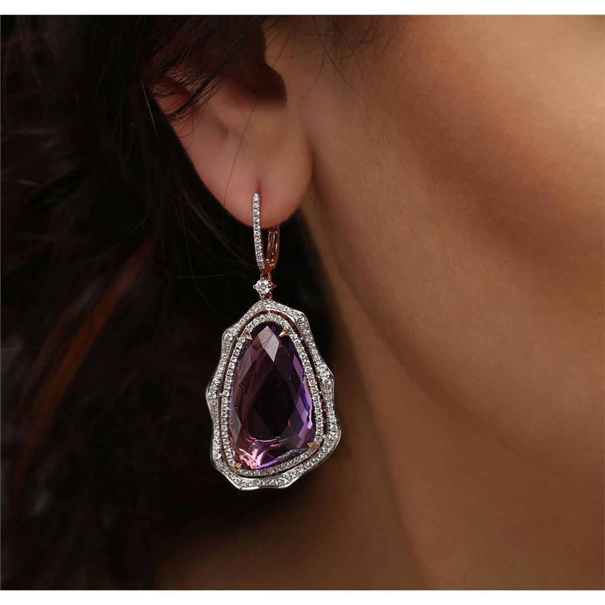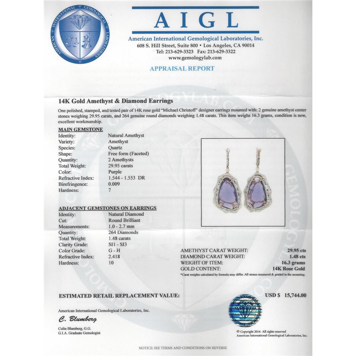 One polished, stamped, and tested pair of 14KT rose gold "Michael Christoff" designer earrings mounted with: 2 genuine amethyst center stones weighing 29.95ct, and 264 genuine round diamonds weighing 1.48ct. This item weighs 16.30 grams. Condition is new, excellent workmanship. AIGL Appraised at $15,744.00.