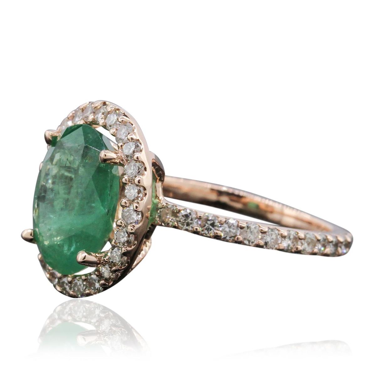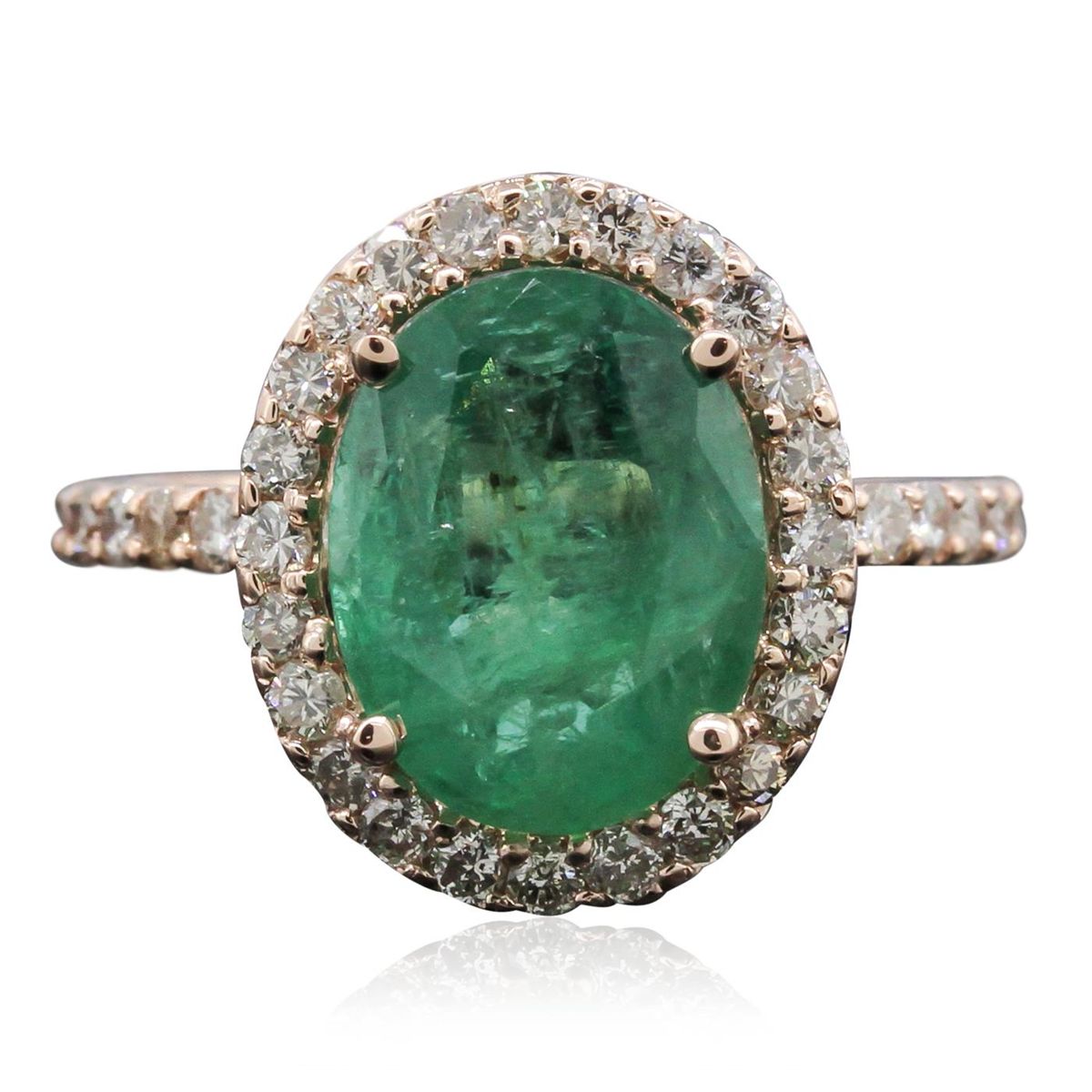 One electronically tested 14KT rose gold Ladies combination cast & assembled fancy ring with a high polish finish. Condition is new. Identified with markings of "14K". Containing: One prong set oval modified brilliant cut natural emerald, measuring 11.60 x 8.90 x 5.20mm, approximate weight of 3.01ct., clarity is heavily included, type III, medium light, very slightly grayish, green color, (GIA G 4/3), cut is good. Colored gemstones are presumed to have been subjected to commonly used and possible undetectable color/clarity enhancement processes. Forty-Eight bead set round brilliant cut diamonds, measuring 1.50 - 1.50 x 1.00mm (depth est.) approximate total weight of 48 Stones = 0.66ct. Clarity of SI-2 to I-2, Color of L - M, Cut is Good. Total Weight of Colored Stones 3.01ct. Total Weight of Diamonds 0.66ct. Total Weight of Ring 3.70 grams. GGL Appraised at $8,270.00.