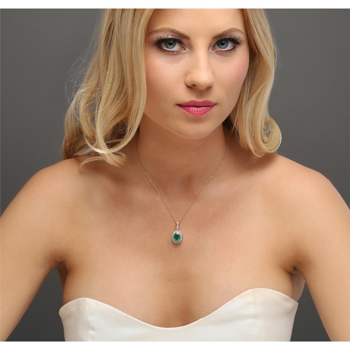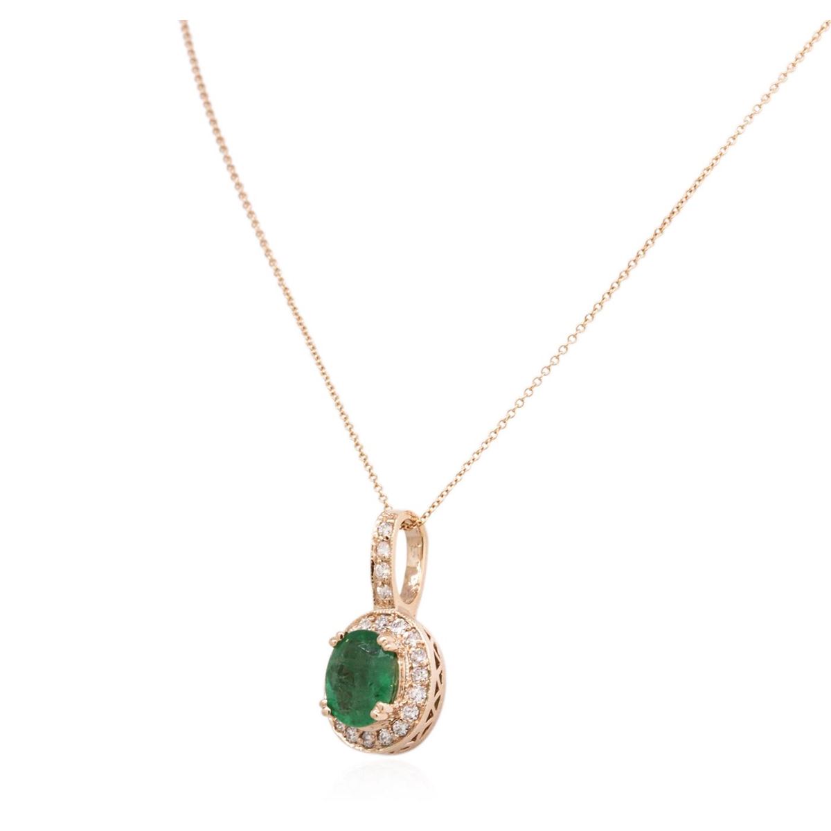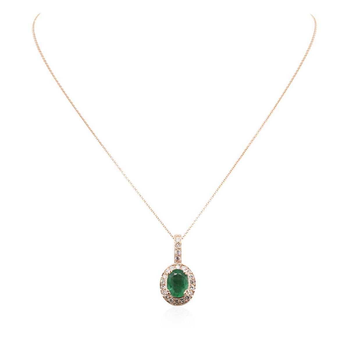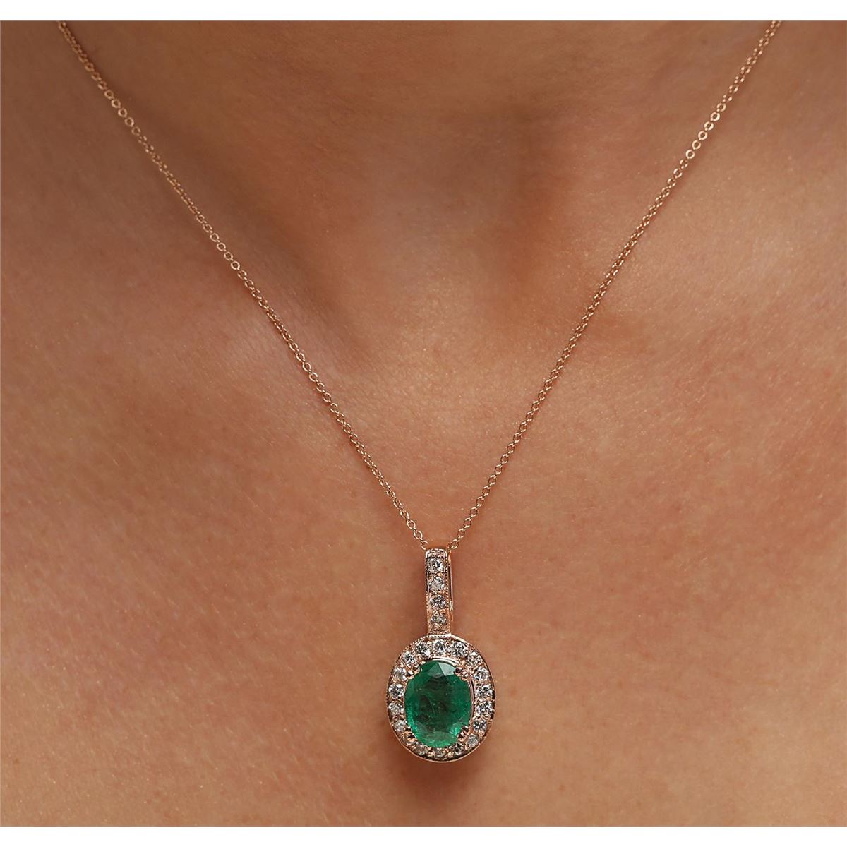 One pendant with chain featuring: 14KT rose gold weighing 5.30 grams containing one emerald with a total weight of 3.05ct and round diamonds with a total weight of 0.53cts.