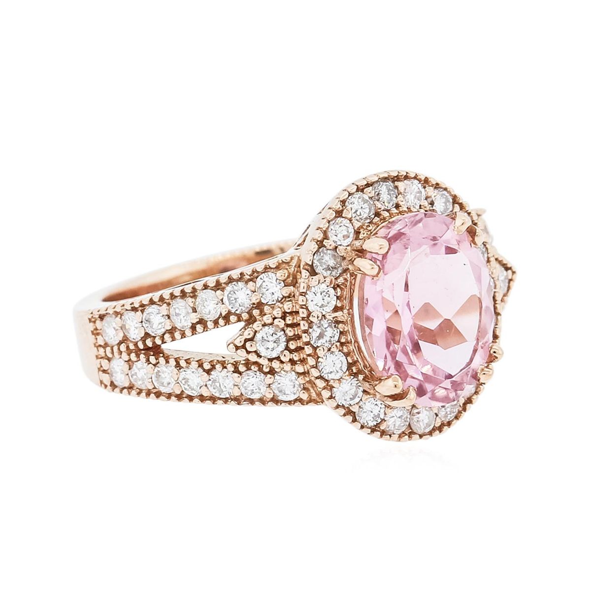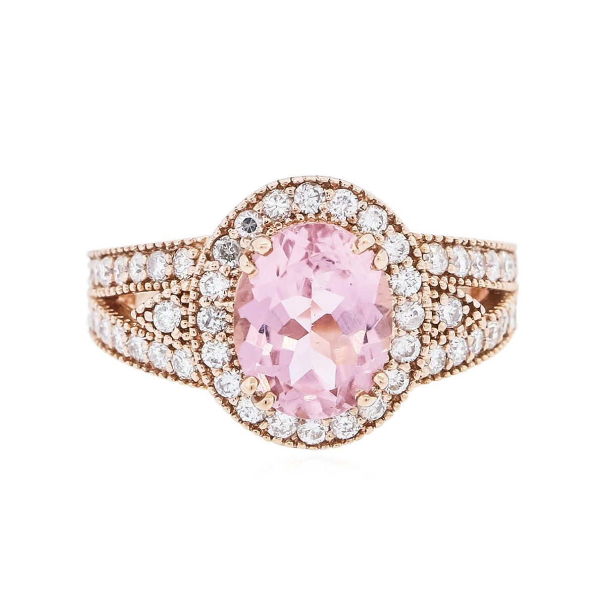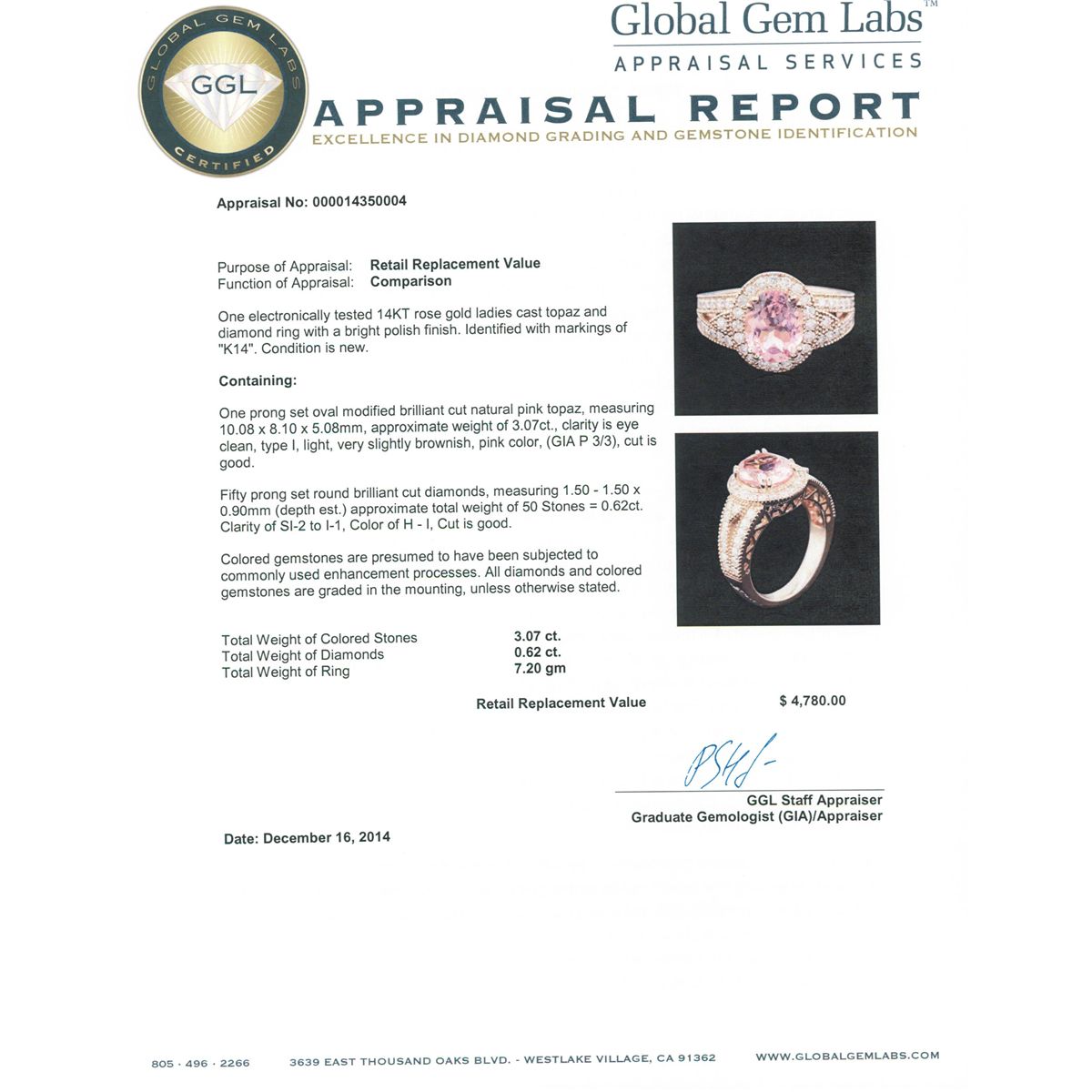 One electronically tested 14KT rose gold ladies cast topaz and diamond ring with a bright polish finish. Identified with markings of "K14". Condition is new. Containing: One prong set oval modified brilliant cut natural pink topaz, measuring 10.08 x 8.10 x 5.08mm, approximate weight of 3.07ct., clarity is eye clean, type I, light, very slightly brownish, slightly purplish pink color, (GIA slpR 3/3), cut is good. Fifty prong set round brilliant cut diamonds, measuring 1.50 - 1.50 x 0.90mm (depth est.) approximate total weight of 50 Stones = 0.62ct. Clarity: SI-2 to I-1. Color: H - I, Cut is Good. Colored gemstones are presumed to have been subjected to commonly used enhancement processes. All diamonds and colored gemstones are graded in the mounting, unless otherwise stated. Total Weight of Colored Stones 3.07ct. Total Weight of Diamonds 0.62ct. Total Weight of Ring 7.20 grams. GGL Appraised at $4,780.00.