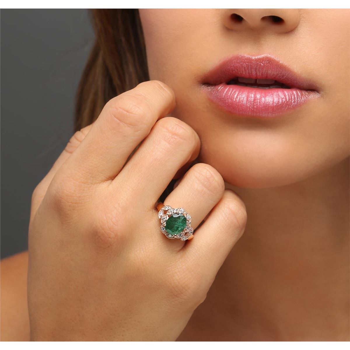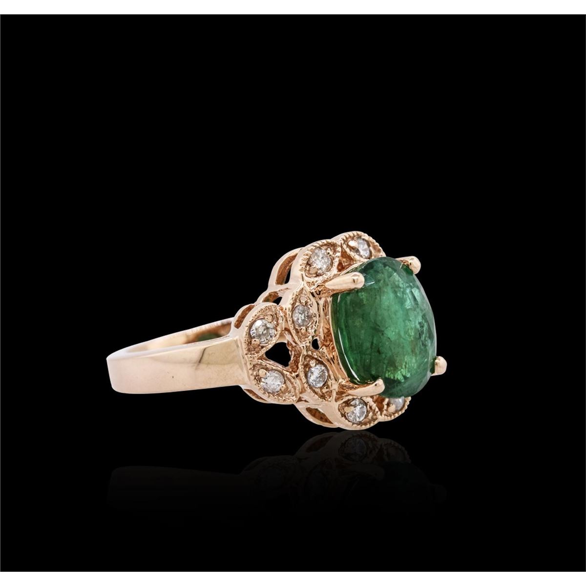 One ring featuring: 14KT rose gold weighing 5.90 grams containing one prong set oval cut emerald with a total weight of 3.08ct and pave set round cut diamonds with a total weight of 0.25cts.