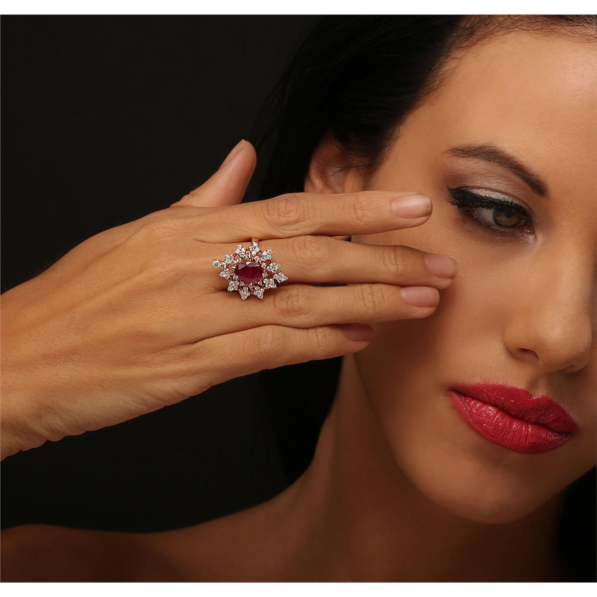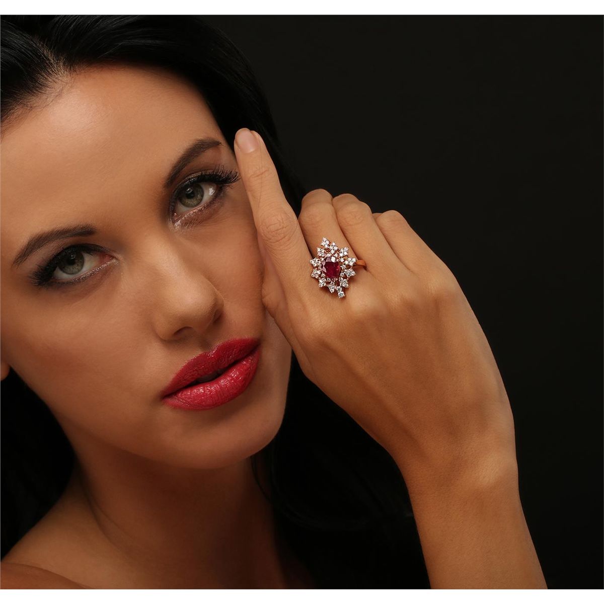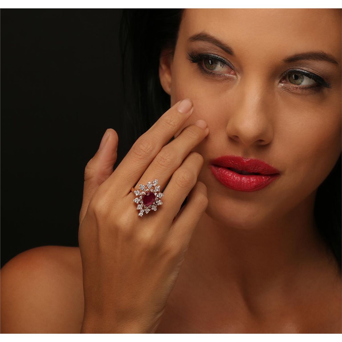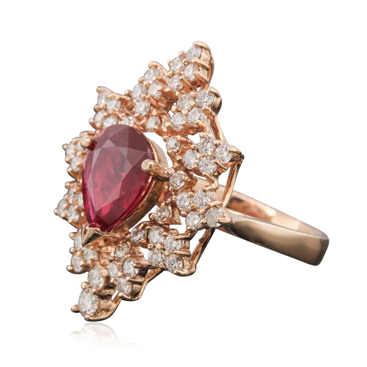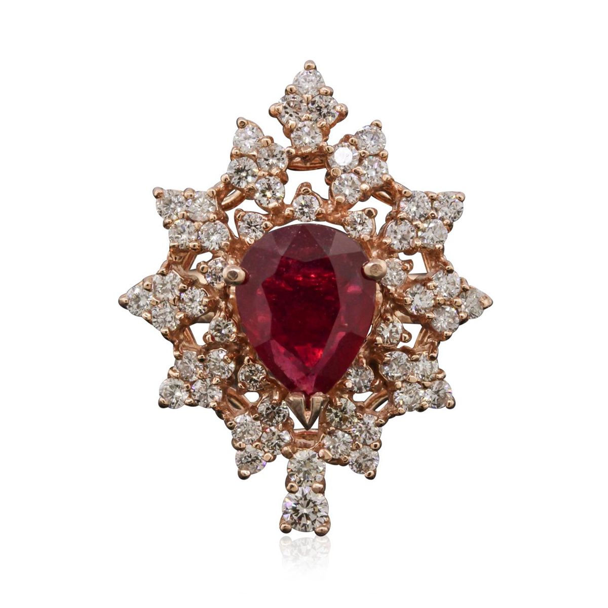 One electronically tested 14KT rose gold Ladies combination cast & assembled ring with a bright polish finish. Condition is new. Identified with markings of "K14". Containing: One prong set pear modified brilliant cut natural ruby, measuring 10.50 x 7.80 x 4.80mm, approximate. Total Weight of 3.14ct., clarity is heavily included, type II, medium dark, moderately strong, strongly purplish red color, (GIA stpR 6/4), cut is good. Fifty-Five prong set round brilliant cut diamonds, measuring 1.60 - 1.60 x 0.96mm (depth est.) approximate. Total Weight of 55 Stones = 0.82ct. Clarity: I-1 to I-2. Color: J - K, Cut is Good. Colored gemstones are presumed to have been subjected to commonly used enhancement processes. All diamonds and colored gemstones are graded in the mounting, unless otherwise stated. Total Weight of Colored Stones 3.14ct. Total Weight of Diamonds 0.82ct. Total Weight of Ring 7.20 grams. GGL Appraised at $4,285.00.