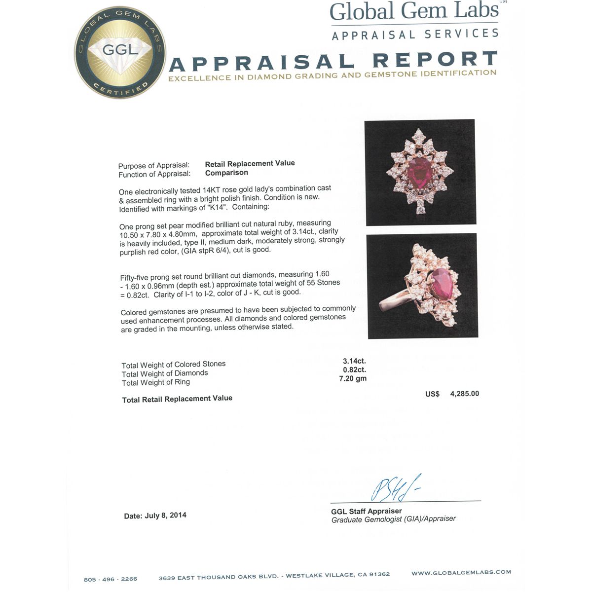 One electronically tested 14KT rose gold Ladies combination cast & assembled ring with a bright polish finish. Condition is new. Identified with markings of "K14". Containing: One prong set pear modified brilliant cut natural ruby, measuring 10.50 x 7.80 x 4.80mm, approximate. Total Weight of 3.14ct., clarity is heavily included, type II, medium dark, moderately strong, strongly purplish red color, (GIA stpR 6/4), cut is good. Fifty-Five prong set round brilliant cut diamonds, measuring 1.60 - 1.60 x 0.96mm (depth est.) approximate. Total Weight of 55 Stones = 0.82ct. Clarity: I-1 to I-2. Color: J - K, Cut is Good. Colored gemstones are presumed to have been subjected to commonly used enhancement processes. All diamonds and colored gemstones are graded in the mounting, unless otherwise stated. Total Weight of Colored Stones 3.14ct. Total Weight of Diamonds 0.82ct. Total Weight of Ring 7.20 grams. GGL Appraised at $4,285.00.