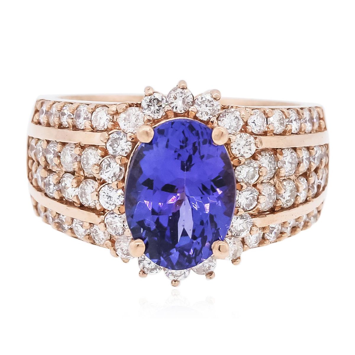 One electronically tested 14KT rose gold ladies combination cast & assembled tanzanite and diamond ring with a flat shank with a bright polish finish. Identified with markings of "K14". Condition is new. Containing: One prong set oval modified brilliant cut natural tanzanite, measuring 10.71 x 7.80 x 5.51mm, approximate weight of 3.16ct., clarity is eye clean, type I, medium, moderately strong, bluish violet color, (GIA bV 5/4), cut is good. Fifty-Eight prong set round brilliant cut diamonds, measuring 2.00 - 1.80 x 1.14mm (depth est.) approximate total weight of 58 Stones = 1.46ct. Clarity: SI-1 to I-1. Color: J - K, Cut is Good. Colored gemstones are presumed to have been subjected to commonly used enhancement processes. All diamonds and colored gemstones are graded in the mounting, unless otherwise stated. Total Weight of Colored Stones 3.16ct. Total Weight of Diamonds 1.46ct. Total Weight of Ring 10.50 grams. GGL Appraised at $10,235.00.