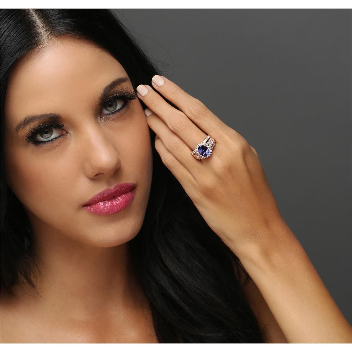 One electronically tested 14KT rose gold ladies combination cast & assembled tanzanite and diamond ring with a flat shank with a bright polish finish. Identified with markings of "K14". Condition is new. Containing: One prong set oval modified brilliant cut natural tanzanite, measuring 10.71 x 7.80 x 5.51mm, approximate weight of 3.16ct., clarity is eye clean, type I, medium, moderately strong, bluish violet color, (GIA bV 5/4), cut is good. Fifty-Eight prong set round brilliant cut diamonds, measuring 2.00 - 1.80 x 1.14mm (depth est.) approximate total weight of 58 Stones = 1.46ct. Clarity: SI-1 to I-1. Color: J - K, Cut is Good. Colored gemstones are presumed to have been subjected to commonly used enhancement processes. All diamonds and colored gemstones are graded in the mounting, unless otherwise stated. Total Weight of Colored Stones 3.16ct. Total Weight of Diamonds 1.46ct. Total Weight of Ring 10.50 grams. GGL Appraised at $10,235.00.