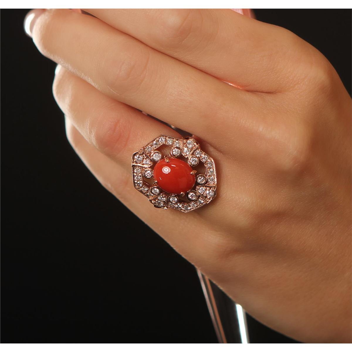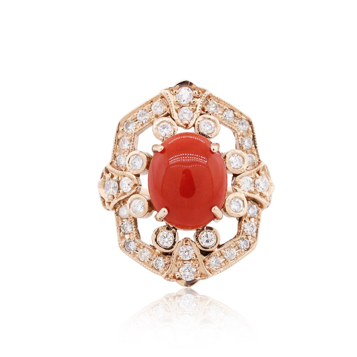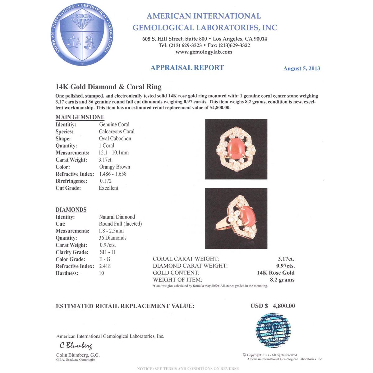 One polished, stamped, and electronically tested solid 14K rose gold ring mounted with: 1 genuine coral center stone weighing 3.17 carats and 36 genuine round full cut diamonds weighing 0.97 carats. This item weighs 8.2 grams, condition is new, excellent workmanship. AIGL Appraised at $4,800.00.