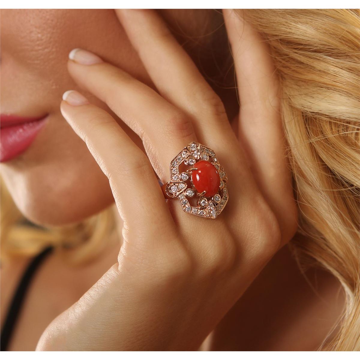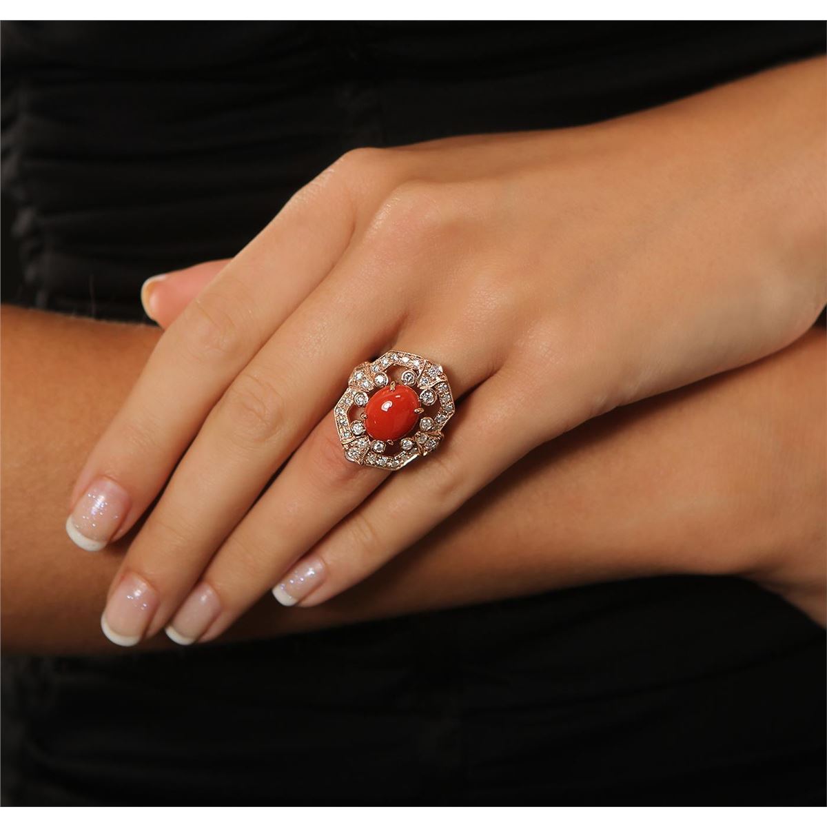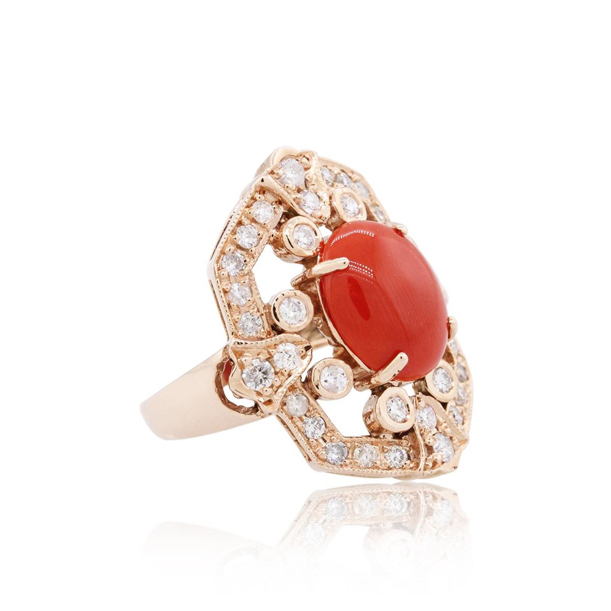 One polished, stamped, and electronically tested solid 14K rose gold ring mounted with: 1 genuine coral center stone weighing 3.17 carats and 36 genuine round full cut diamonds weighing 0.97 carats. This item weighs 8.2 grams, condition is new, excellent workmanship. AIGL Appraised at $4,800.00.