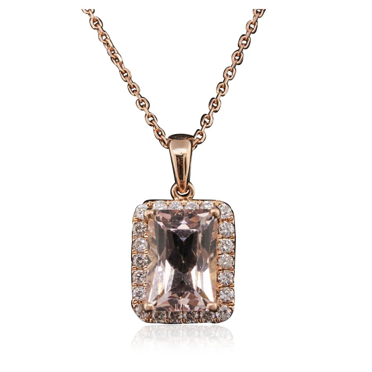 One electronically tested 14KT rose gold ladies cast & assembled morganite and diamond pendant with chain. Condition is new, good workmanship. The pendant features a morganite set within a diamond bezel, completed by a rose gold bail. The pendant is supported by an eighteen inch length 14KT rose gold designer style chain, terminating in a spring ring clasp. Bright polish finish. Identified with markings of "14K". Containing: One prong set rectangular mixed cut natural morganite, measuring 10.00 x 6.80 x 5.30mm, 8%. bulge factor, approximate weight of 3.18ct., clarity is slightly included, type I, light, very slightly brownish, orangy red color, (GIA oR 3/3), cut is good. Transmitting light with a minimum of distortion, transparent. Naturally occurring internal & external characteristics are present. Refractive index testing results of 1.57 to 1.58. This is a conclusive result for beryl (morganite). Graded in the setting. Twenty-Two prong set round brilliant cut diamonds, measuring 1.60 - 1.50 x 0.93mm (depth est.) approximate. Total Weight of 22 Stones = 0.40ct. Graded in the setting. Clarity: SI-1 to I-1. Color: G - I. Total Weight of Colored Stones 3.18ct. Total Weight of Diamonds 0.40ct. Total Weight of Pendant With Chain 3.81 grams. AIG Appraised at $4,025.00.