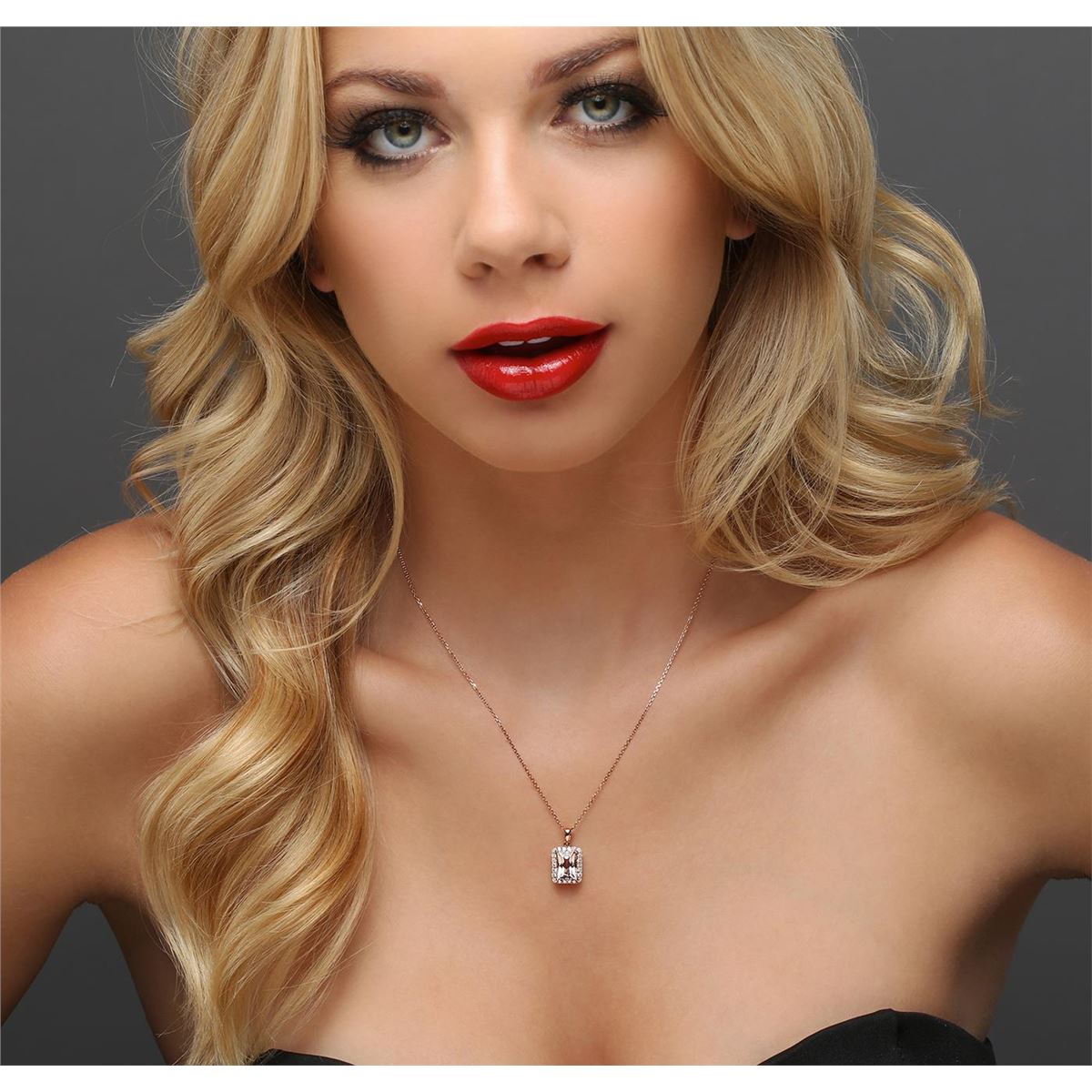 One electronically tested 14KT rose gold ladies cast & assembled morganite and diamond pendant with chain. Condition is new, good workmanship. The pendant features a morganite set within a diamond bezel, completed by a rose gold bail. The pendant is supported by an eighteen inch length 14KT rose gold designer style chain, terminating in a spring ring clasp. Bright polish finish. Identified with markings of "14K". Containing: One prong set rectangular mixed cut natural morganite, measuring 10.00 x 6.80 x 5.30mm, 8%. bulge factor, approximate weight of 3.18ct., clarity is slightly included, type I, light, very slightly brownish, orangy red color, (GIA oR 3/3), cut is good. Transmitting light with a minimum of distortion, transparent. Naturally occurring internal & external characteristics are present. Refractive index testing results of 1.57 to 1.58. This is a conclusive result for beryl (morganite). Graded in the setting. Twenty-Two prong set round brilliant cut diamonds, measuring 1.60 - 1.50 x 0.93mm (depth est.) approximate. Total Weight of 22 Stones = 0.40ct. Graded in the setting. Clarity: SI-1 to I-1. Color: G - I. Total Weight of Colored Stones 3.18ct. Total Weight of Diamonds 0.40ct. Total Weight of Pendant With Chain 3.81 grams. AIG Appraised at $4,025.00.