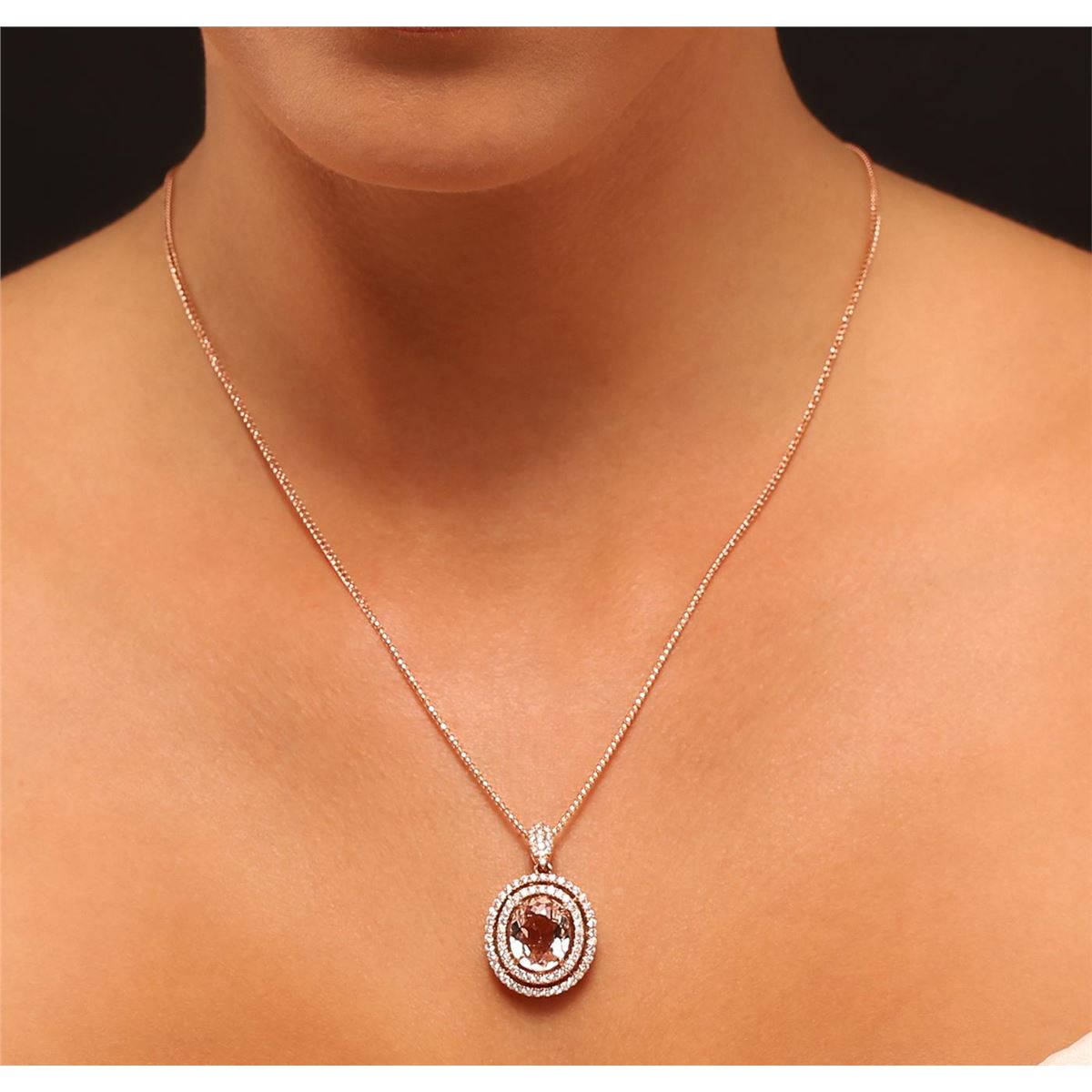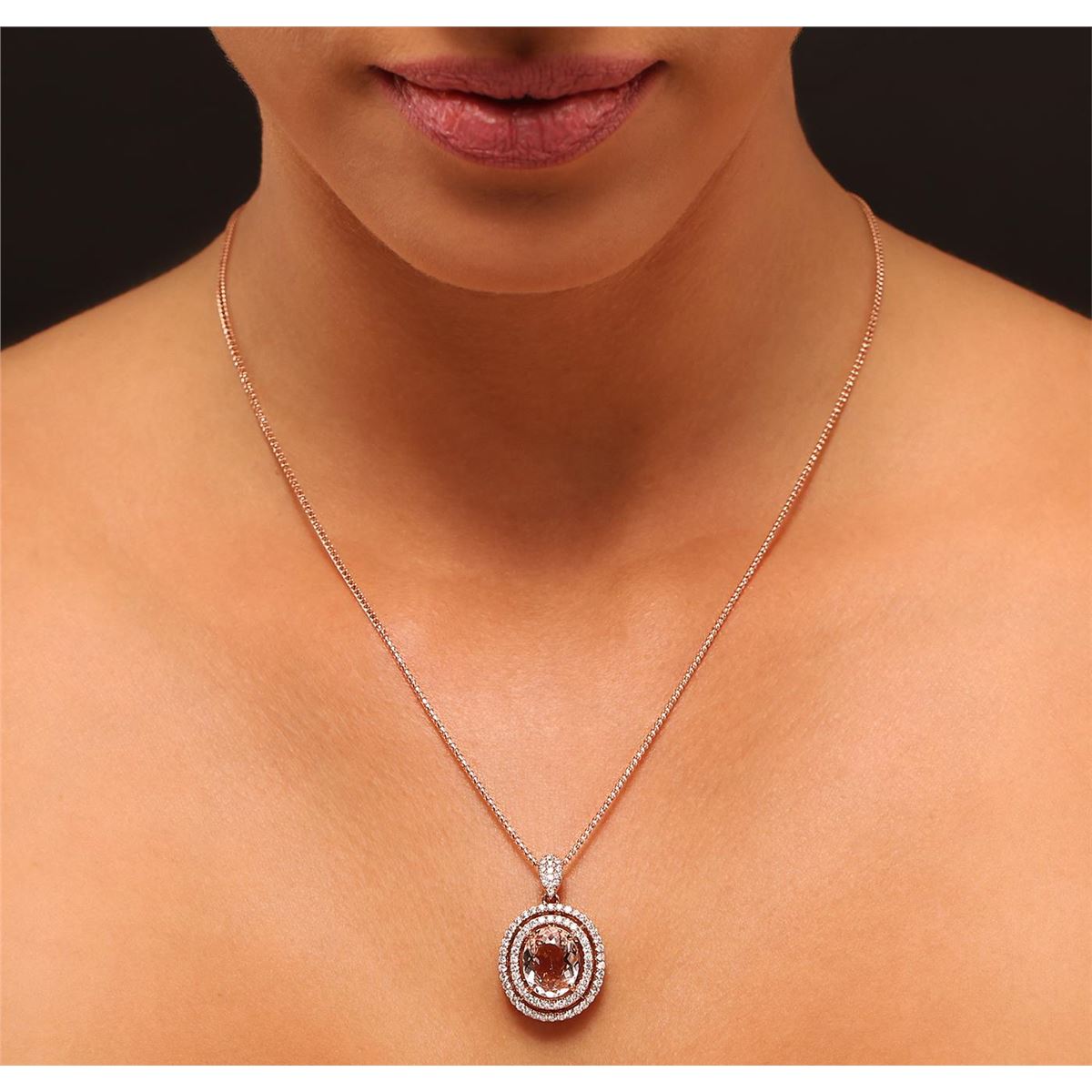 One electronically tested 14KT rose gold Ladies combination cast & assembled pendant & chain 17.5" long, medium open cable link with a lobster claw clasp with a bright polish finish. Condition is new. Identified with markings of "14K". Containing: Eighty-Two prong set round brilliant cut diamonds, measuring 1.30 - 1.30 x 0.01mm (depth est.) approximate. Total Weight of 82 Stones = 0.97ct. Clarity: I-1. Color: G - H, Cut is Good. One prong set oval modified brilliant cut natural morganite, measuring 12.00 x 10.00 x 4.90mm, approximate weight of 3.30ct., clarity is eye clean, light, very slightly grayish, pink color, (GIA Pk 3/3), cut is very good. Colored gemstones are presumed to have been subjected to commonly used color/clarity enhancement processes. Total Weight of Colored Stones 3.30ct. Total Weight of Diamonds 0.97ct. Total Weight of Pendant & Chain 7.60 grams. GGL Appraised at $6,730.00.