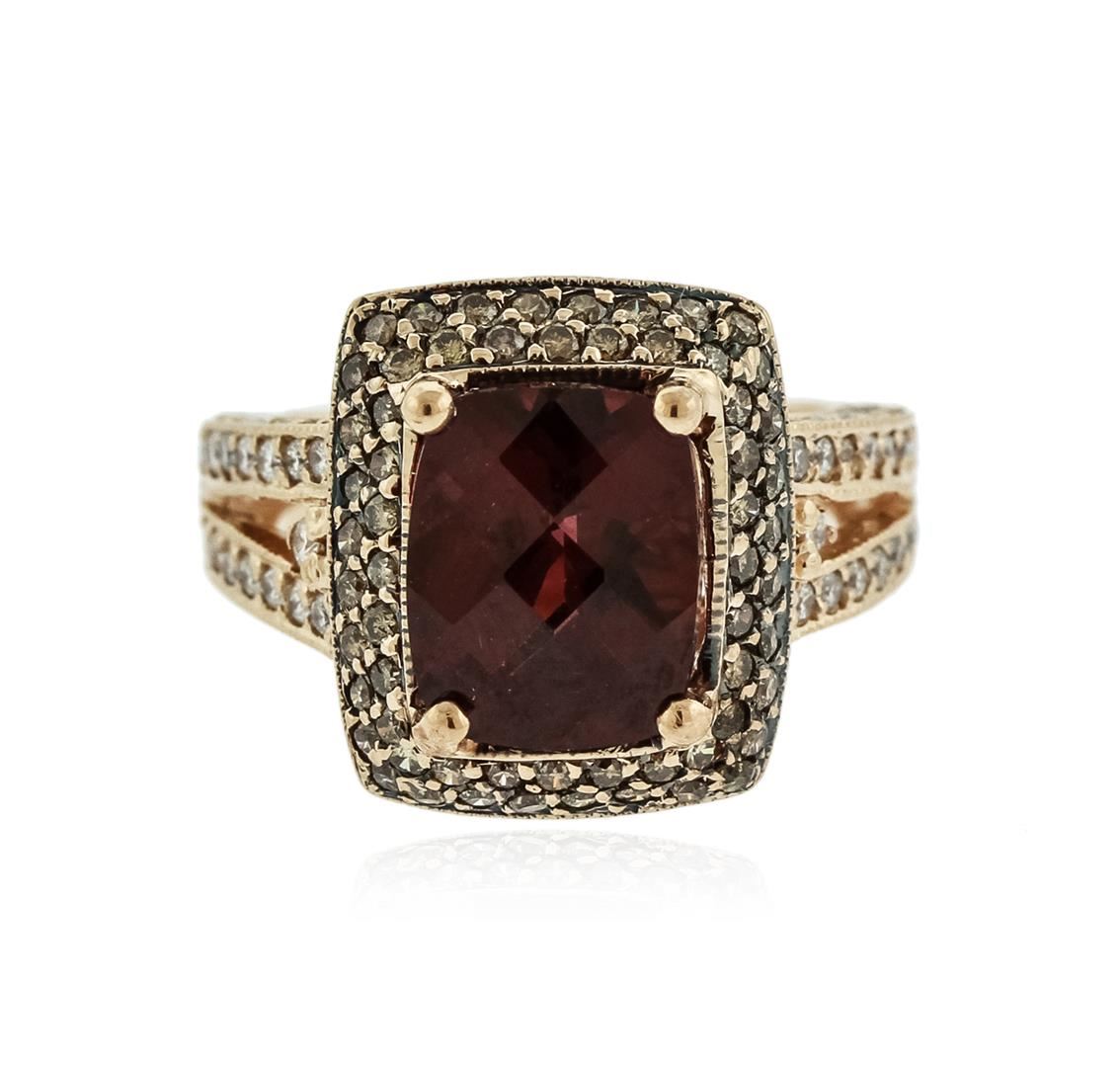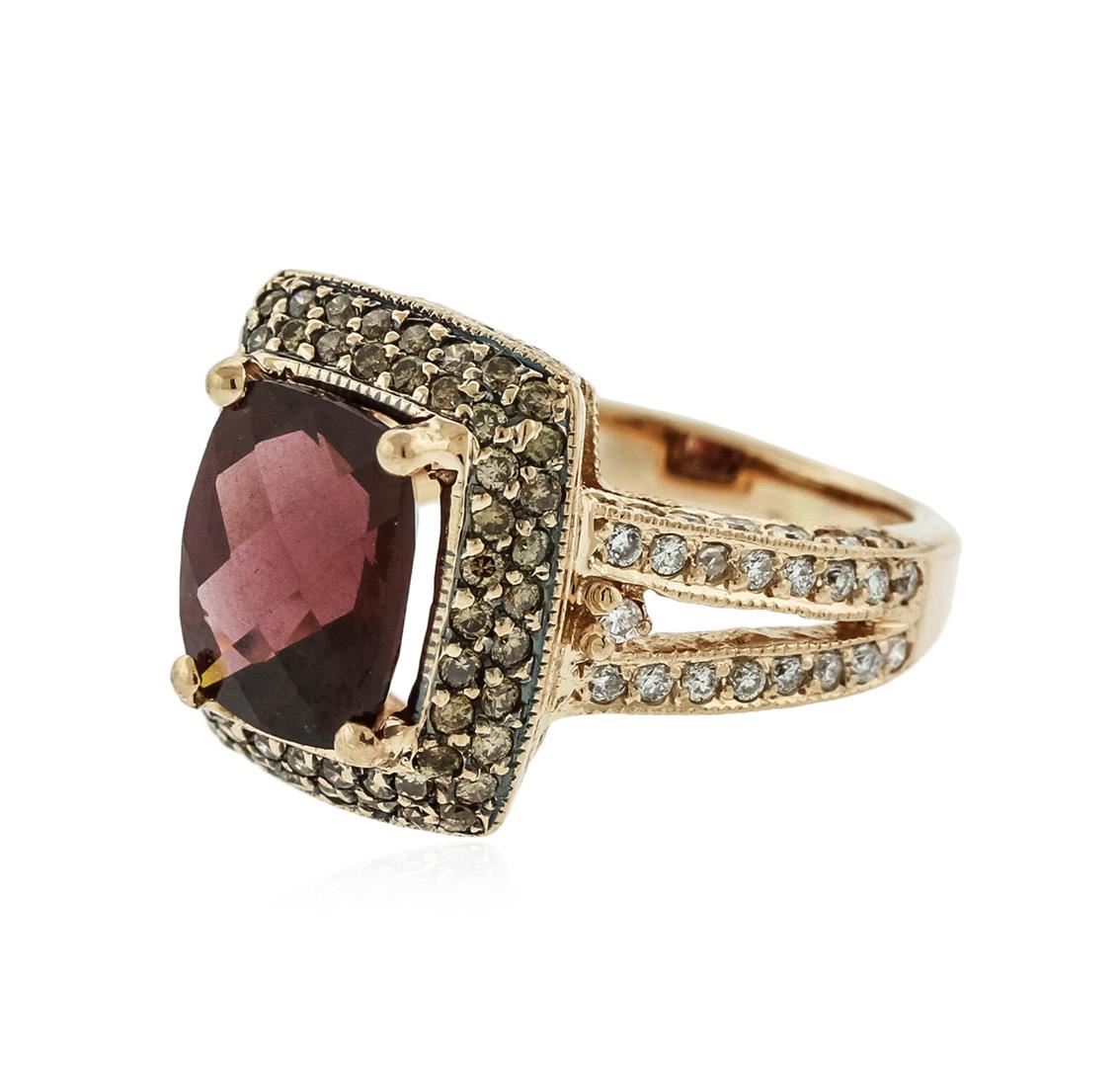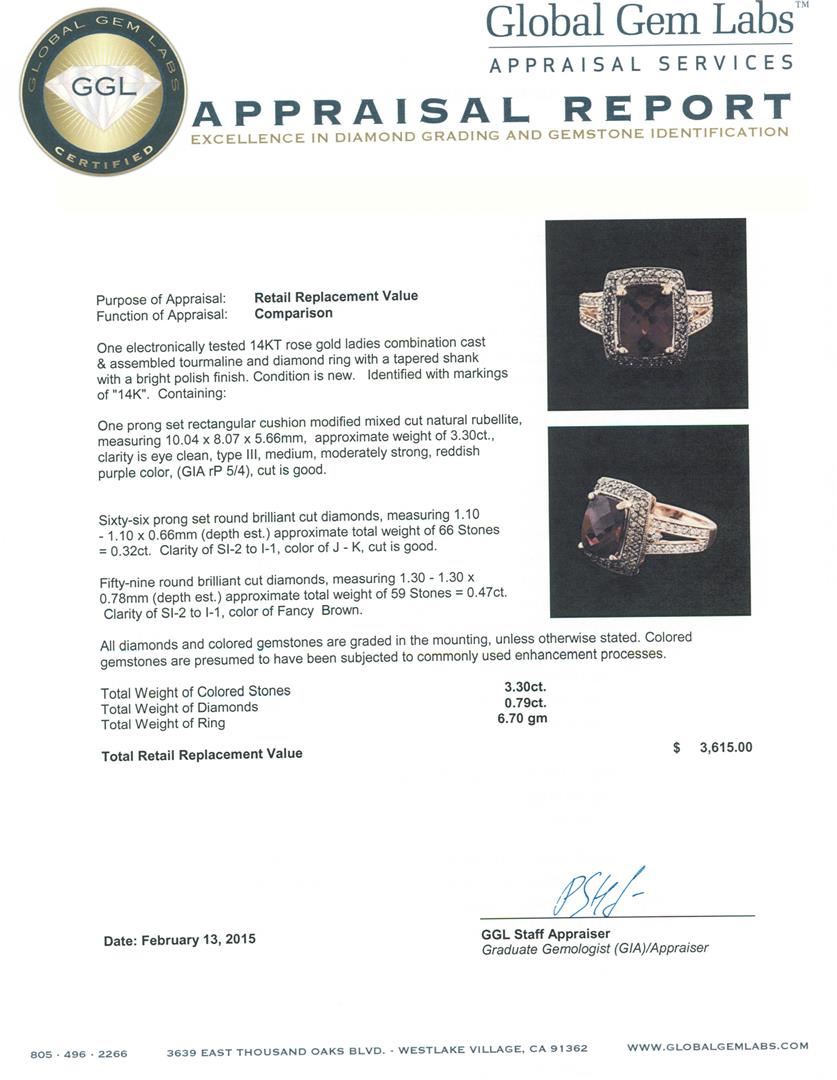 One electronically tested 14KT rose gold ladies combination cast & assembled tourmaline and diamond ring with a tapered shank with a bright polish finish. Identified with markings of "14K". Condition is new. Containing: One prong set rectangular cushion modified mixed cut natural rubellite, measuring 10.04 x 8.07 x 5.66mm, approximate weight of 3.30ct., clarity is eye clean, type III, medium, moderately strong, reddish purple color, (GIA rP 5/4), cut is good. Sixty-Six prong set round brilliant cut diamonds, measuring 1.10 - 1.10 x 0.66mm (depth est.) approximate total weight of 66 Stones = 0.32ct. Clarity: SI-2 to I-1. Color: J - K, Cut is Good. Fifty-Nine round brilliant cut diamonds, measuring 1.30 - 1.30 x 0.78mm (depth est.) approximate total weight of 59 Stones = 0.47ct. Clarity: SI-2 to I-1. All diamonds and colored gemstones are graded in the mounting, unless otherwise stated. Colored gemstones are presumed to have been subjected to commonly used enhancement processes. Total Weight of Colored Stones 3.30ct. Total Weight of Diamonds 0.79ct. Total Weight of Ring 6.70 grams. GGL Appraised at $3,615.00.