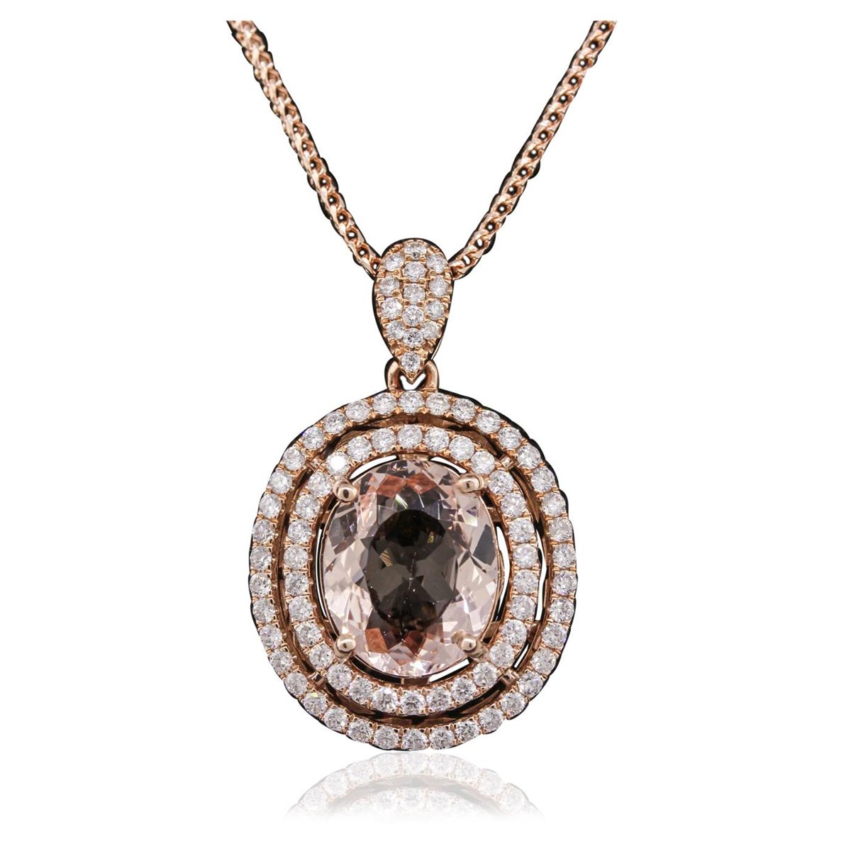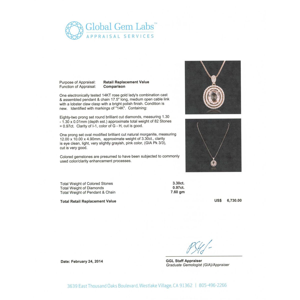 One electronically tested 14KT rose gold Ladies combination cast & assembled pendant & chain 17.5" long, medium open cable link with a lobster claw clasp with a bright polish finish. Condition is new. Identified with markings of "14K". Containing: Eighty-Two prong set round brilliant cut diamonds, measuring 1.30 - 1.30 x 0.01mm (depth est.) approximate. Total Weight of 82 Stones = 0.97ct. Clarity: I-1. Color: G - H, Cut is Good. One prong set oval modified brilliant cut natural morganite, measuring 12.00 x 10.00 x 4.90mm, approximate weight of 3.30ct., clarity is eye clean, light, very slightly grayish, pink color, (GIA Pk 3/3), cut is very good. Colored gemstones are presumed to have been subjected to commonly used color/clarity enhancement processes. Total Weight of Colored Stones 3.30ct. Total Weight of Diamonds 0.97ct. Total Weight of Pendant & Chain 7.60 grams. GGL Appraised at $6,730.00.