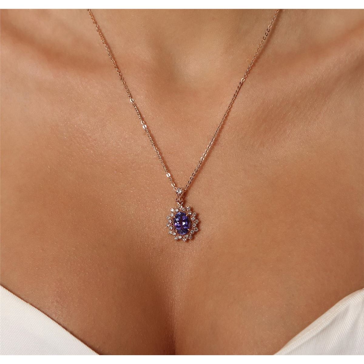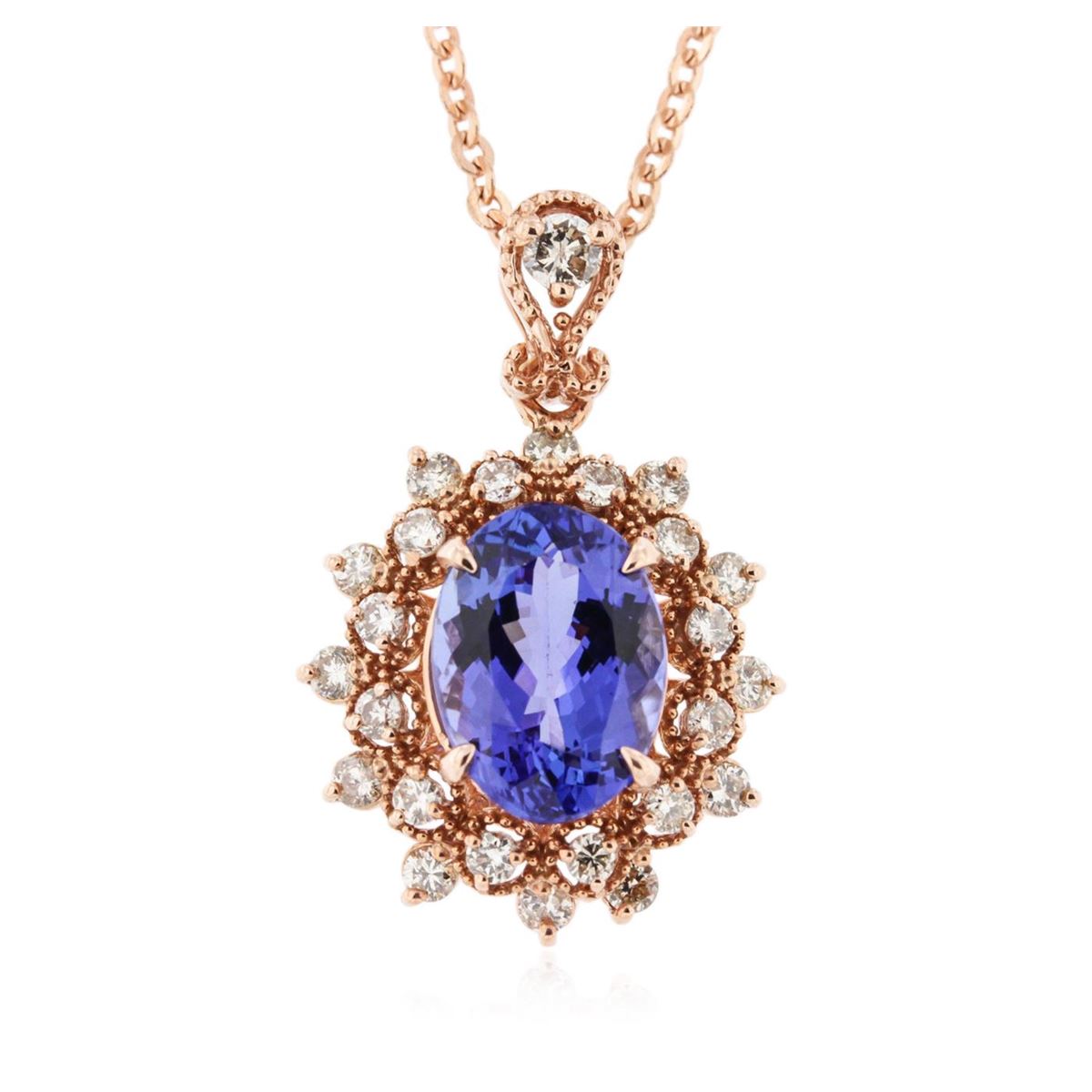 One electronically tested 14KT rose gold ladies cast & assembled tanzanite and diamond pendant with chain. Condition is new, good workmanship. The pendant features a tanzanite set within a stylized diamond bezel, completed by a diamond set bail. The pendant is supported by an eighteen inch length 14KT rose gold designer style chain, terminating in a lobster claw clasp. Bright polish finish with milgrain detailing. Containing: One prong set oval mixed cut natural tanzanite, measuring 10.90 x 7.70 x 5.10mm, 10% bulge factor, approximate weight of 3.33ct., clarity is eye clean, type I, medium dark, very slightly grayish, bluish violet color, (GIA bV 6/3), cut is good. Transmitting light with no distortion, transparent. Graded in the setting. Tanzanite is a very rare gemstone that is only found in the country of Tanzania. Originally discovered in 1967. Tiffany & Company, named the stone Tanzanite. It is found in the Usumburu Mountains that border the Umba Valley of northern Tanzania. Tanzanite occurs in gray, brown, violet, blue, reddish-purple, & green. The gem is interesting because of its exceptional pleochroism. Rotated in different directions a tanzanite will exhibit multiple changes of color. Tanzanite has a low tolerance to ultrasonic cleaning, and should not be cleaned using this method. Twenty-five prong set round brilliant cut diamonds, measuring 2.70 - 1.70 x 1.32mm (depth est.) approximate total weight of 25 Stones = 0.69ct. Graded in the setting. Clarity SI-1 to I-1. Color H - J. Total Weight of Colored Stones 3.33ct. Total Weight of Diamonds 0.69ct. Total Weight of Pendant With Chain 5.78gm. AIG Appraised at $11,395.00.