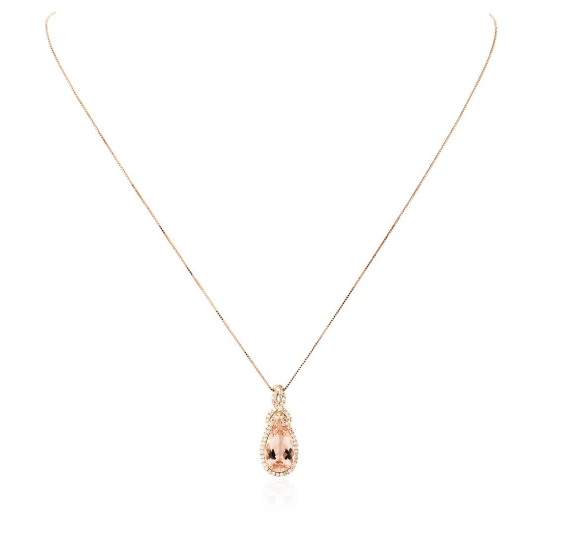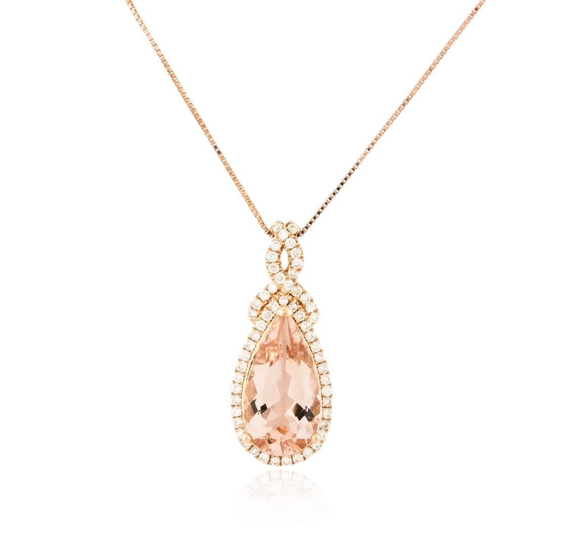 One pendant with chain featuring: 14KT rose gold weighing 2.03 grams containing one morganite with a total weight of 3.40ct and 55 round diamonds with a total weight of 0.32ct.