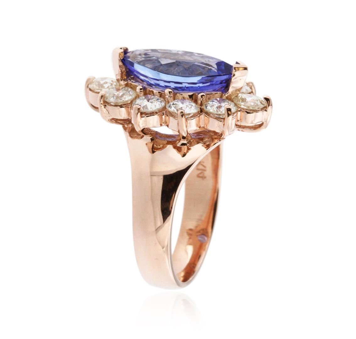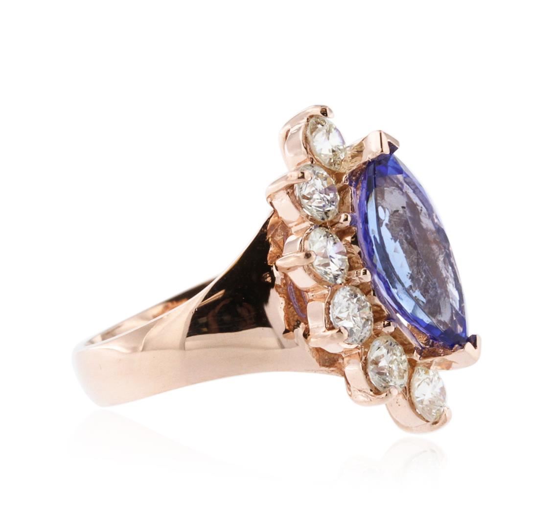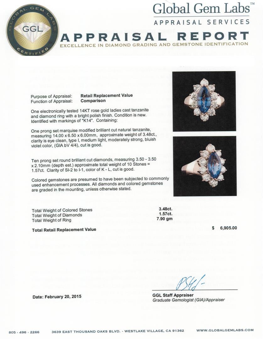 One electronically tested 14KT rose gold ladies cast tanzanite and diamond ring with a bright polish finish. Identified with markings of "K14". Condition is new. Containing: One prong set marquise modified brilliant cut natural tanzanite, measuring 14.00 x 6.50 x 6.00mm, approximate weight of 3.48ct., clarity is eye clean, type I, medium light, moderately strong, bluish violet color, (GIA bV 4/4), cut is good. Ten prong set round brilliant cut diamonds, measuring 3.50 - 3.50 x 2.10mm (depth est.) approximate total weight of 10 Stones = 1.57ct. Clarity: SI-2 to I-1. Color: K - L, Cut is Good. Colored gemstones are presumed to have been subjected to commonly used enhancement processes. All diamonds and colored gemstones are graded in the mounting, unless otherwise stated. Total Weight of Colored Stones 3.48ct. Total Weight of Diamonds 1.57ct. Total Weight of Ring 7.90 grams. GGL Appraised at $6,905.00.