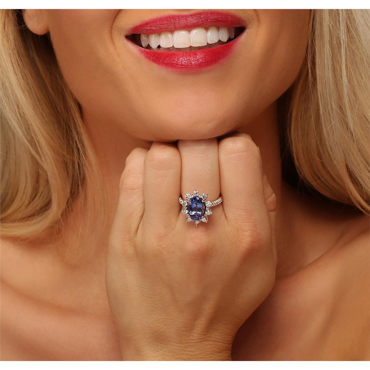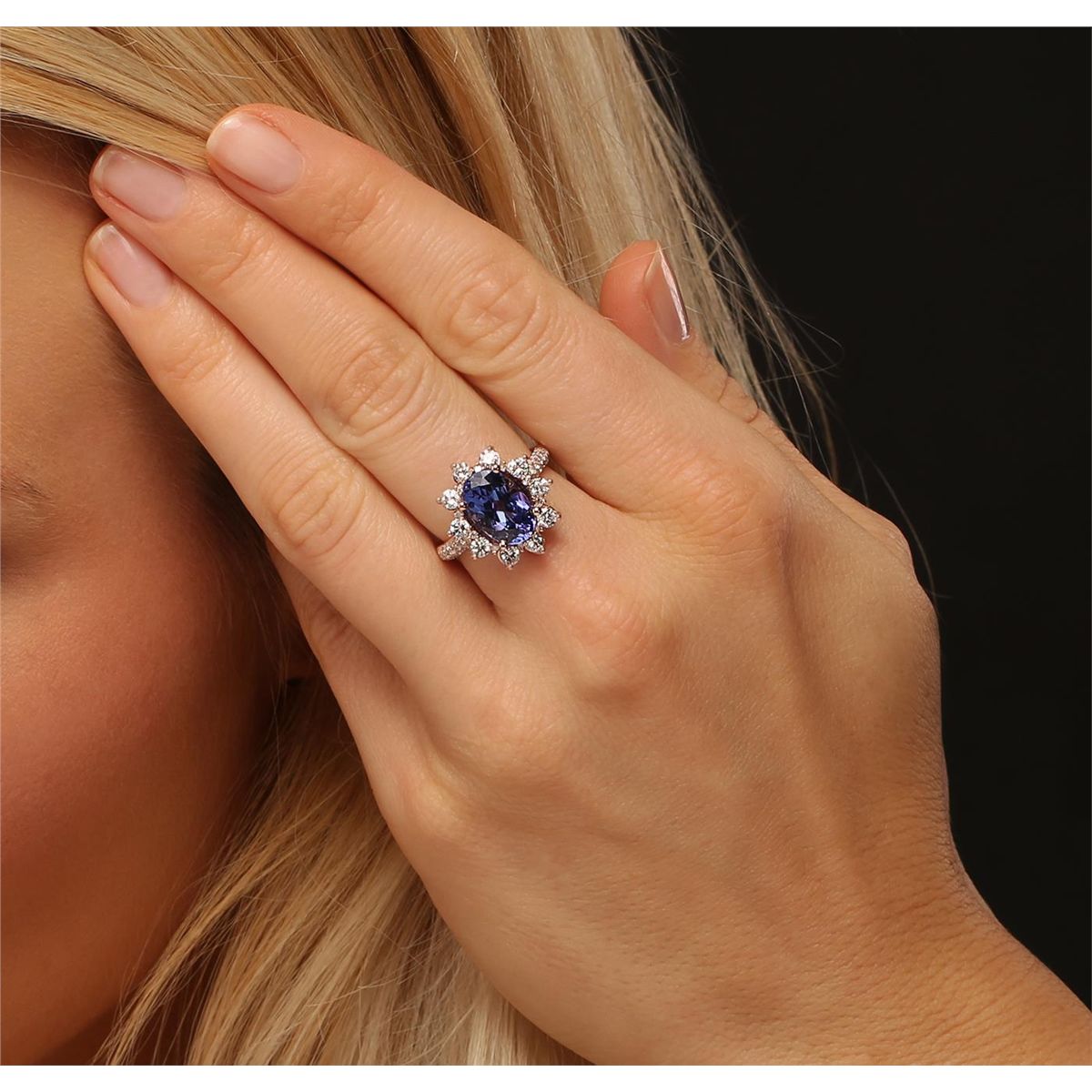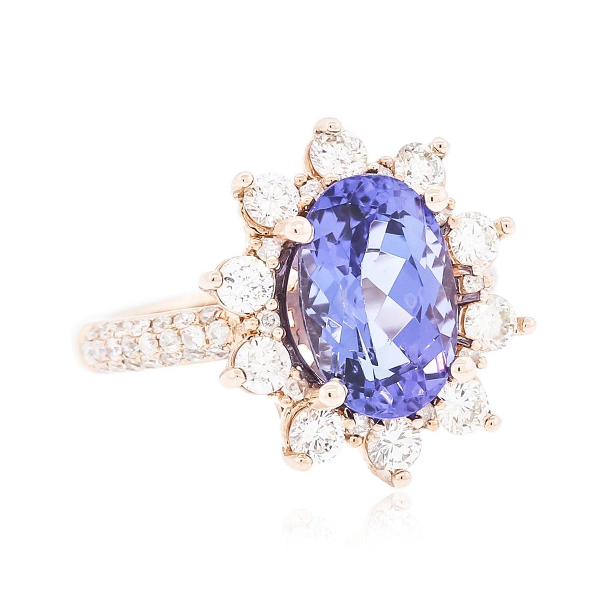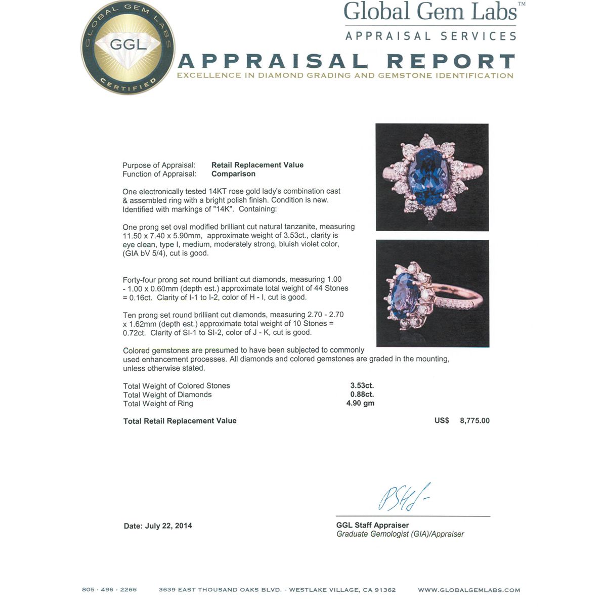One electronically tested 14KT rose gold ladies combination cast & assembled ring with a bright polish finish. Condition is new. Identified with markings of "14K". Containing: One prong set oval modified brilliant cut natural tanzanite, measuring 11.50 x 7.40 x 5.90mm, approximate weight of 3.53ct., clarity is eye clean, type I, medium, moderately strong, bluish violet color, (GIA bV 5/4), cut is good. Forty-Four prong set round brilliant cut diamonds, measuring 1.00 - 1.00 x 0.60mm (depth est.) approximate total weight of 44 Stones = 0.16ct. Clarity: I-1 to I-2. Color: H - I, Cut is Good. Ten prong set round brilliant cut diamonds, measuring 2.70 - 2.70 x 1.62mm (depth est.) approximate total weight of 10 Stones = 0.72ct. Clarity: SI-1 to SI-2. Color: J - K, Cut is Good. Colored gemstones are presumed to have been subjected to commonly used enhancement processes. All diamonds and colored gemstones are graded in the mounting, unless otherwise stated. Total Weight of Colored Stones 3.53ct. Total Weight of Diamonds 0.88ct. Total Weight of Ring 4.90 grams. GGL Appraised at $8,775.00.