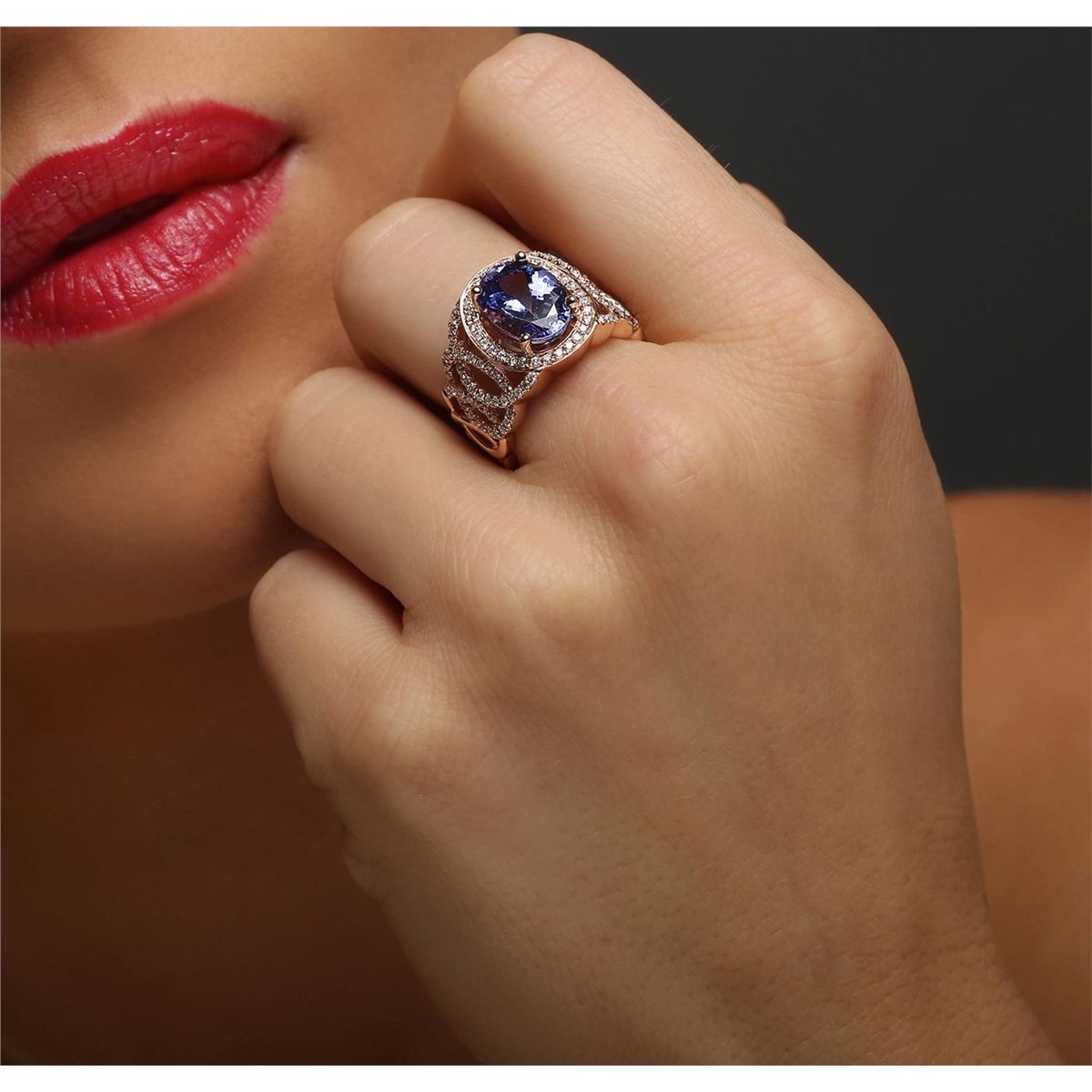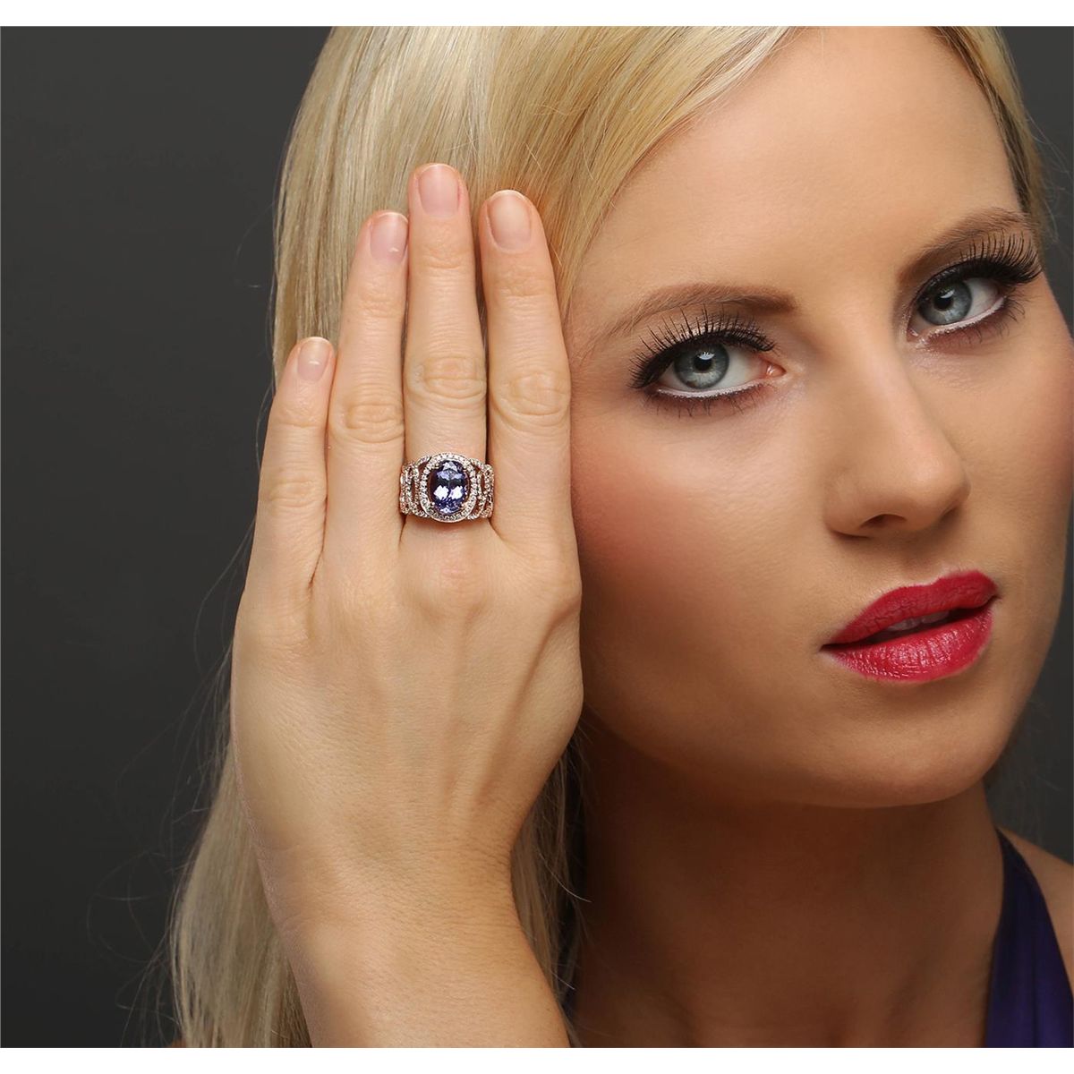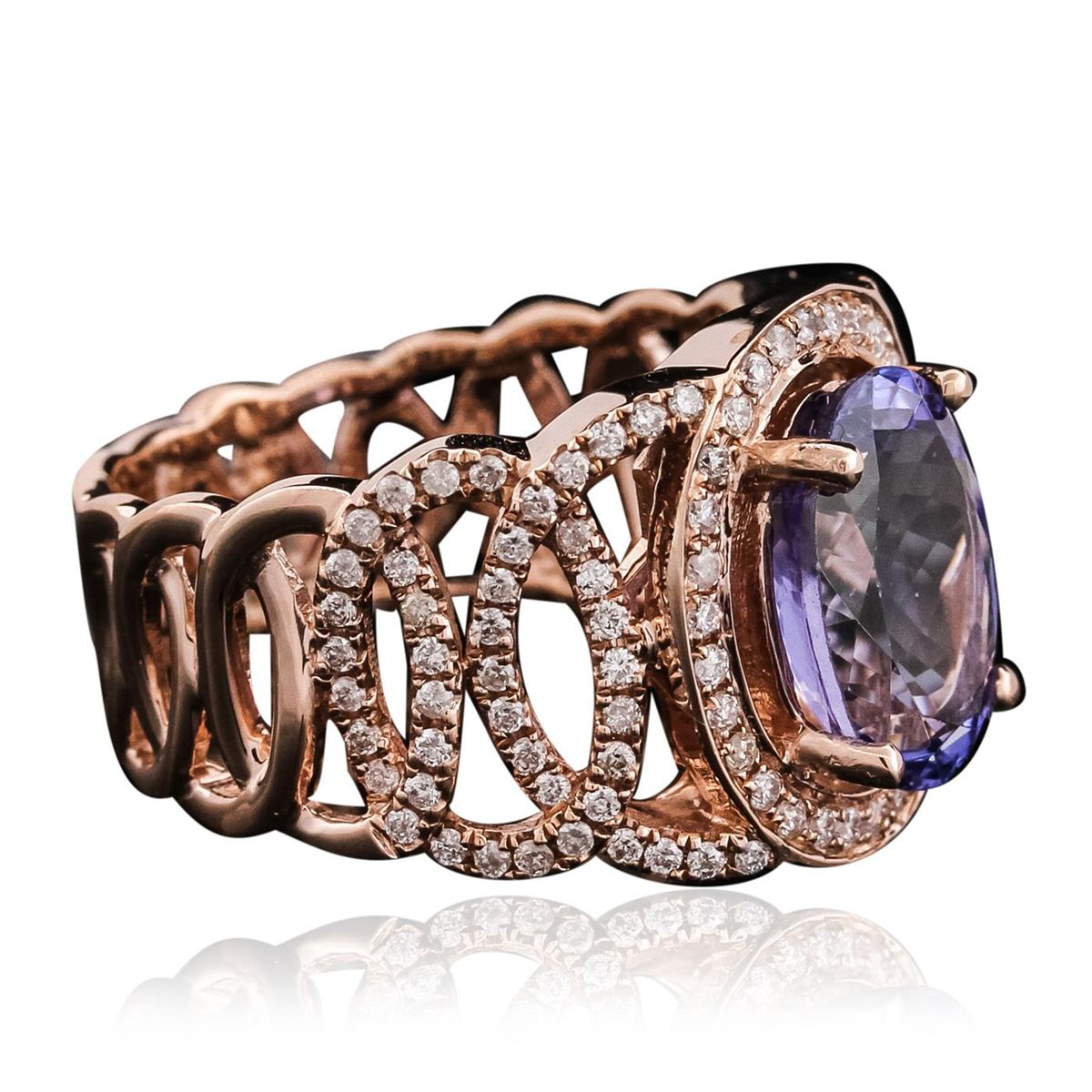 One electronically tested 14KT rose gold ladies combination cast & assembled tanzanite and diamond ring with a tapered shank with a bright polish finish. Identified with markings of "14K". Condition is new. Containing: One prong set oval modified brilliant cut natural tanzanite, measuring 11.56 x 8.35 x 5.41mm, approximate weight of 3.59ct., clarity is eye clean, type I, medium, moderately strong, bluish violet color, (GIA bV 5/4), cut is good. One Hundred Eighteen prong set round brilliant cut diamonds, measuring 1.20 - 1.20 x 0.72mm (depth est.) approximate total weight of 118 Stones = 0.74ct. Clarity: I-1 to I-2. Color: I - J, Cut is Good. Colored gemstones are presumed to have been subjected to commonly used enhancement processes. All diamonds and colored gemstones are graded in the mounting, unless otherwise stated total weight of Colored Stones 3.59ct. Total Weight of Diamonds 0.74ct. Total Weight of Ring 8.40 grams. GGL Appraised at $9,555.00.