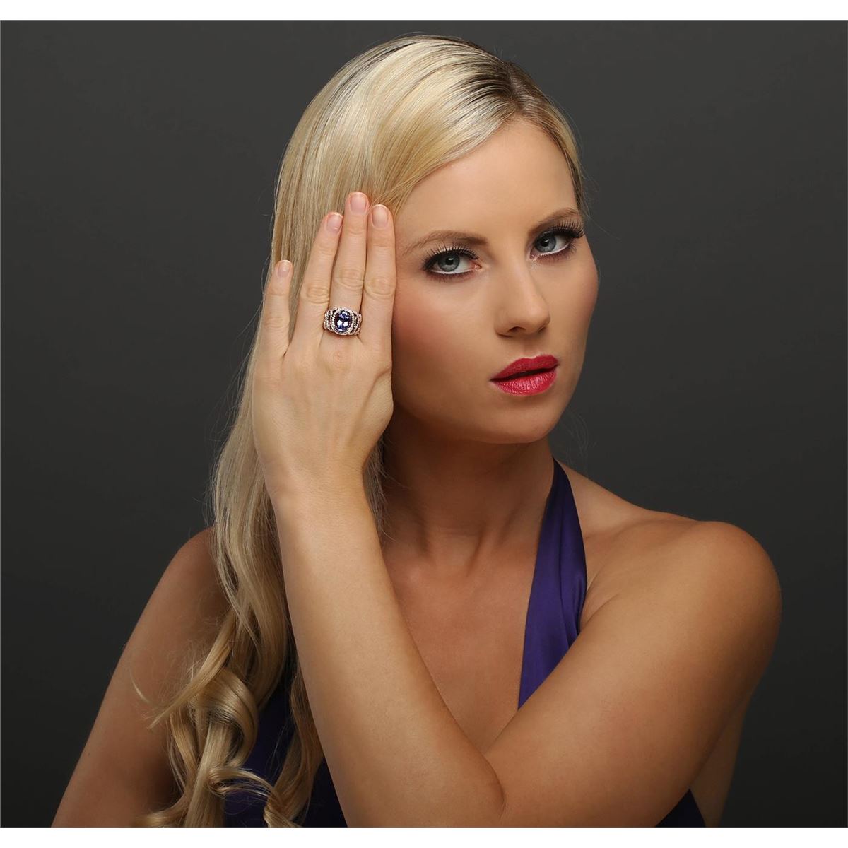 One electronically tested 14KT rose gold ladies combination cast & assembled tanzanite and diamond ring with a tapered shank with a bright polish finish. Identified with markings of "14K". Condition is new. Containing: One prong set oval modified brilliant cut natural tanzanite, measuring 11.56 x 8.35 x 5.41mm, approximate weight of 3.59ct., clarity is eye clean, type I, medium, moderately strong, bluish violet color, (GIA bV 5/4), cut is good. One Hundred Eighteen prong set round brilliant cut diamonds, measuring 1.20 - 1.20 x 0.72mm (depth est.) approximate total weight of 118 Stones = 0.74ct. Clarity: I-1 to I-2. Color: I - J, Cut is Good. Colored gemstones are presumed to have been subjected to commonly used enhancement processes. All diamonds and colored gemstones are graded in the mounting, unless otherwise stated total weight of Colored Stones 3.59ct. Total Weight of Diamonds 0.74ct. Total Weight of Ring 8.40 grams. GGL Appraised at $9,555.00.